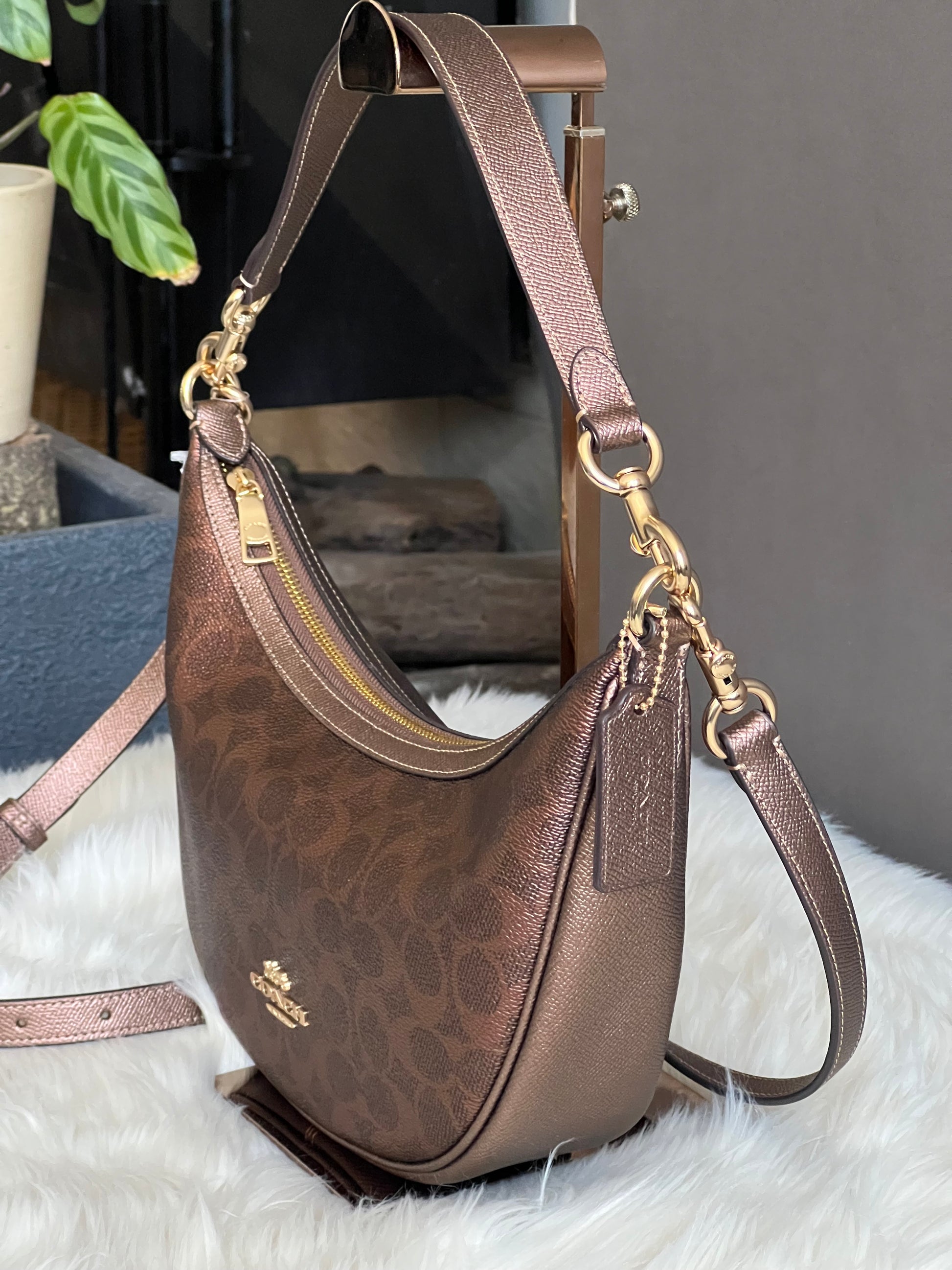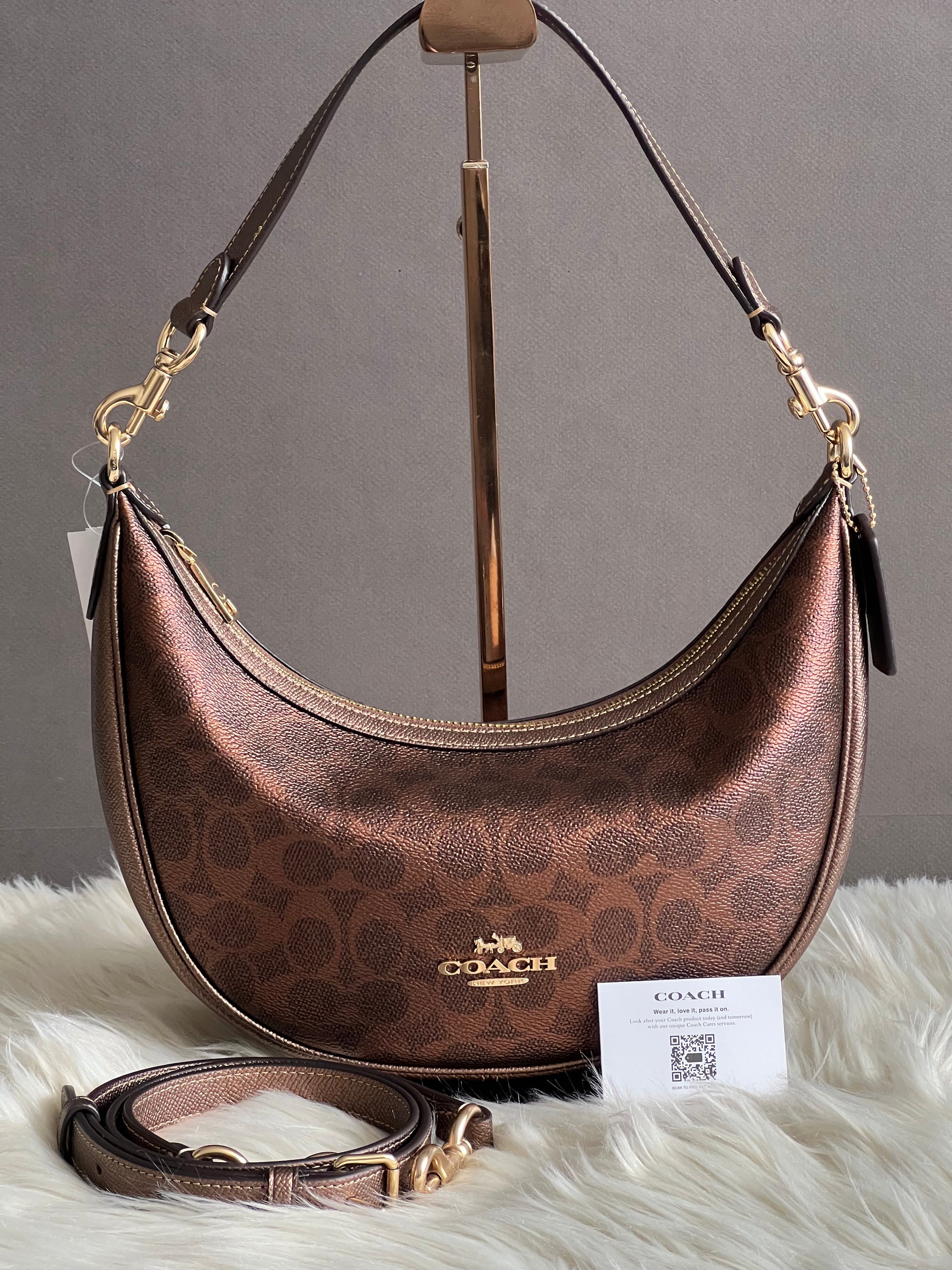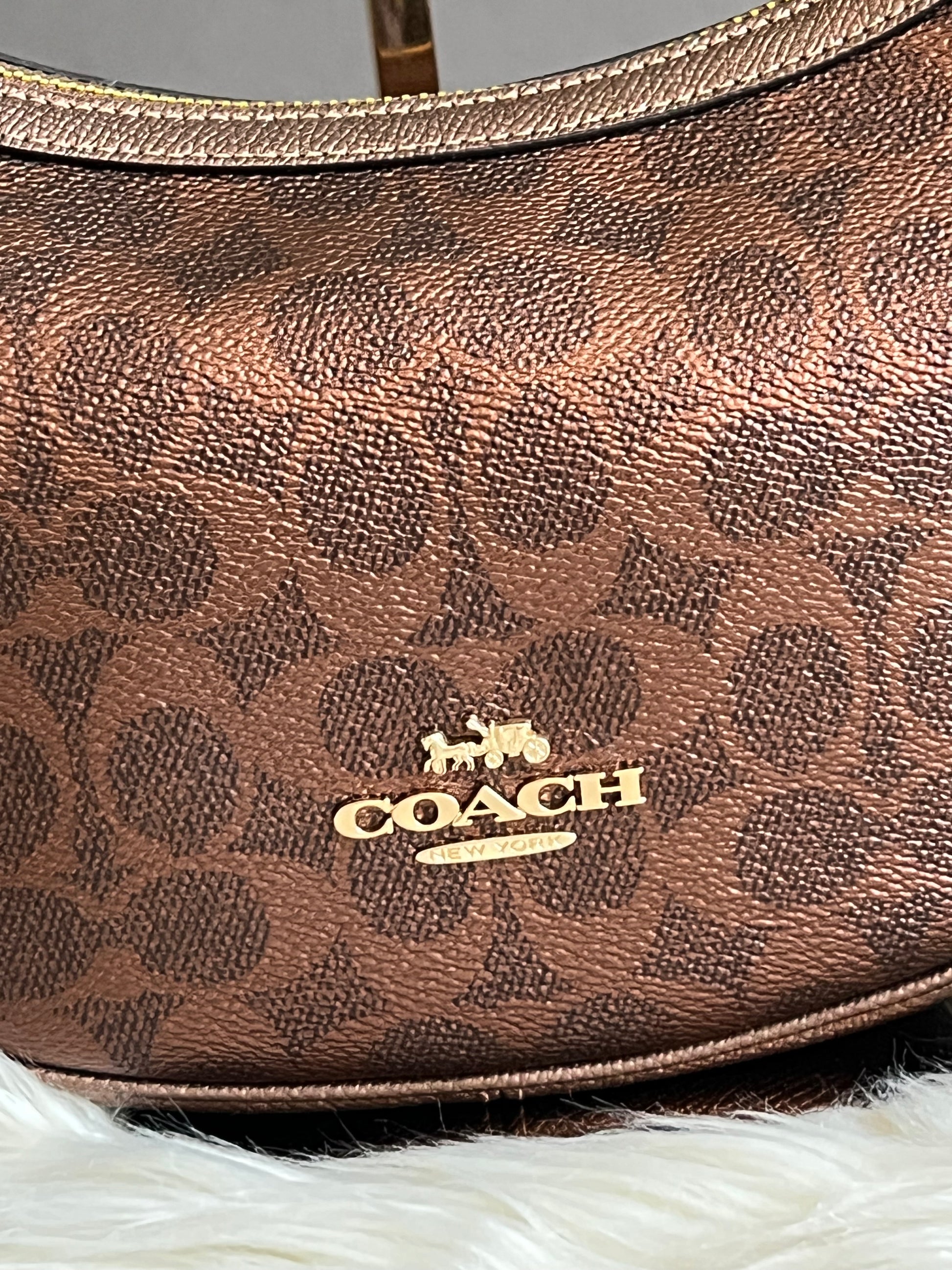 The Coach Aria Shoulder Bag in Signature Canvas offers a blend of durability and elegance, crafted from high-quality materials known for their resilience. This bag's spacious interior provides ample storage, while the signature canvas design enhances its aesthetic appeal, making it suitable for various occasions.