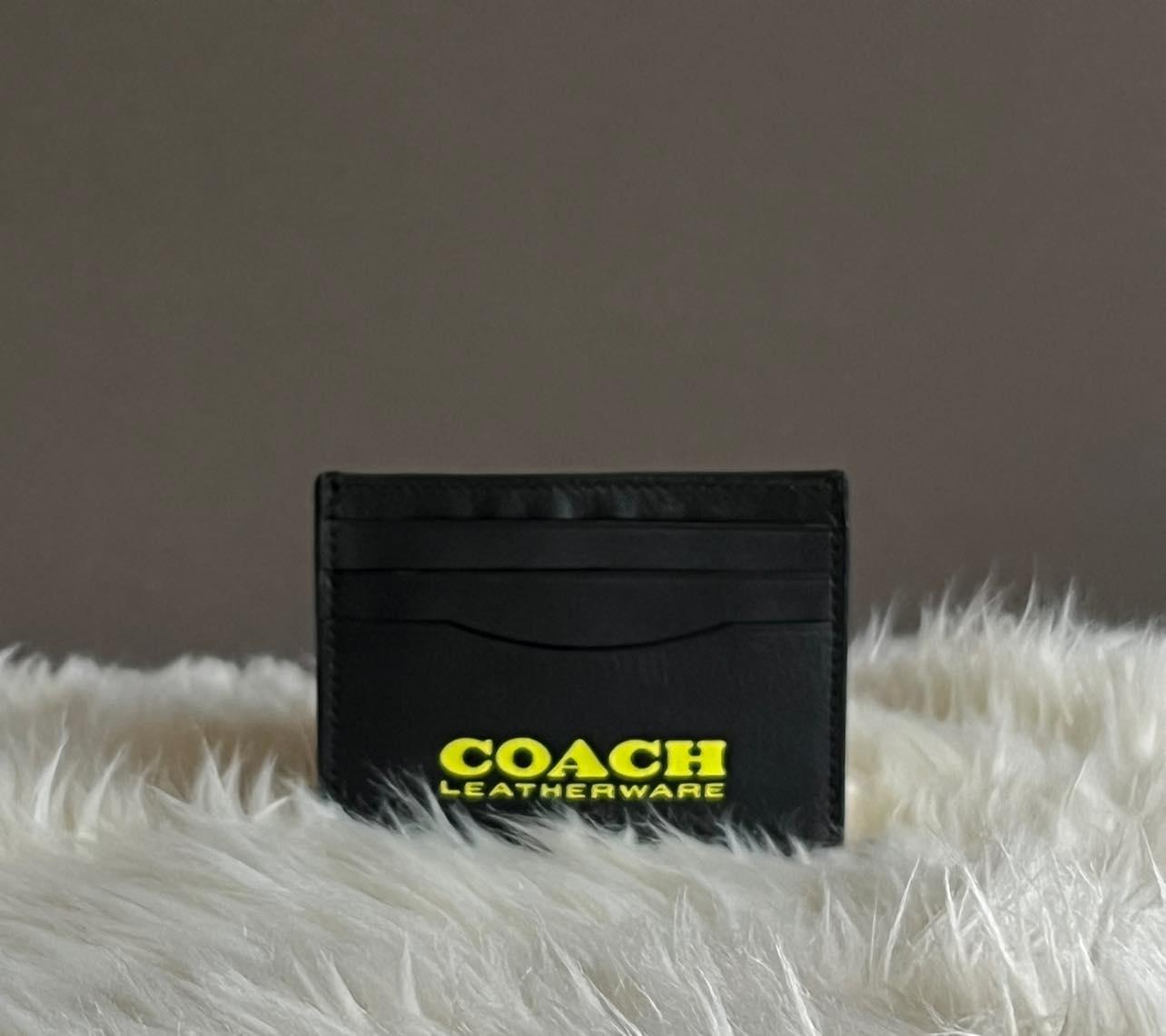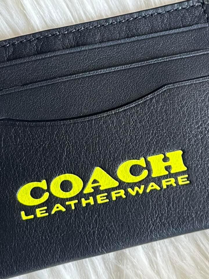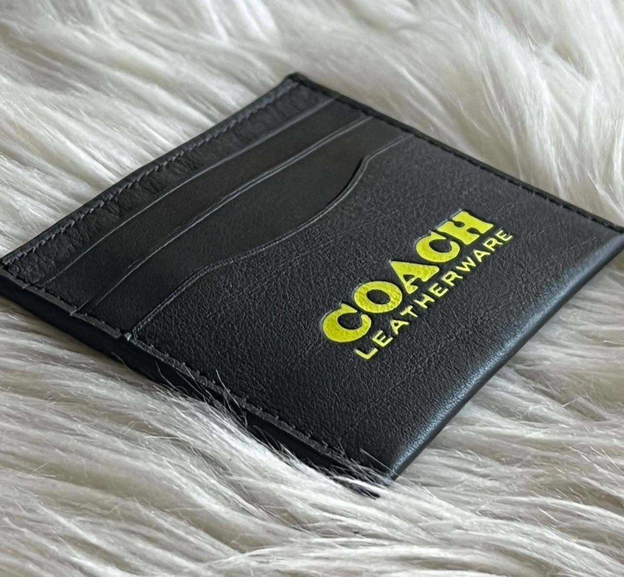 Expertly crafted with style and functionality in mind, the C5352- Coach Card Case is a must-have accessory. Made from durable materials, this black and neon card case measures 4 inches in length and 3 inches in height, making it the perfect size to fit in your pocket or bag. Add a touch of luxury to your everyday routine with its sleek design and superior quality. MSRP $90.
