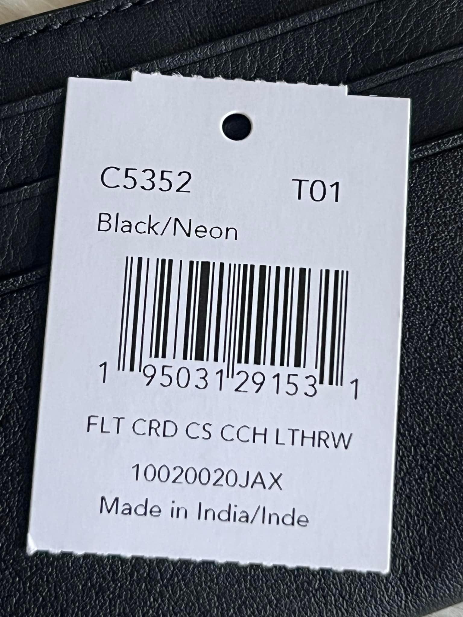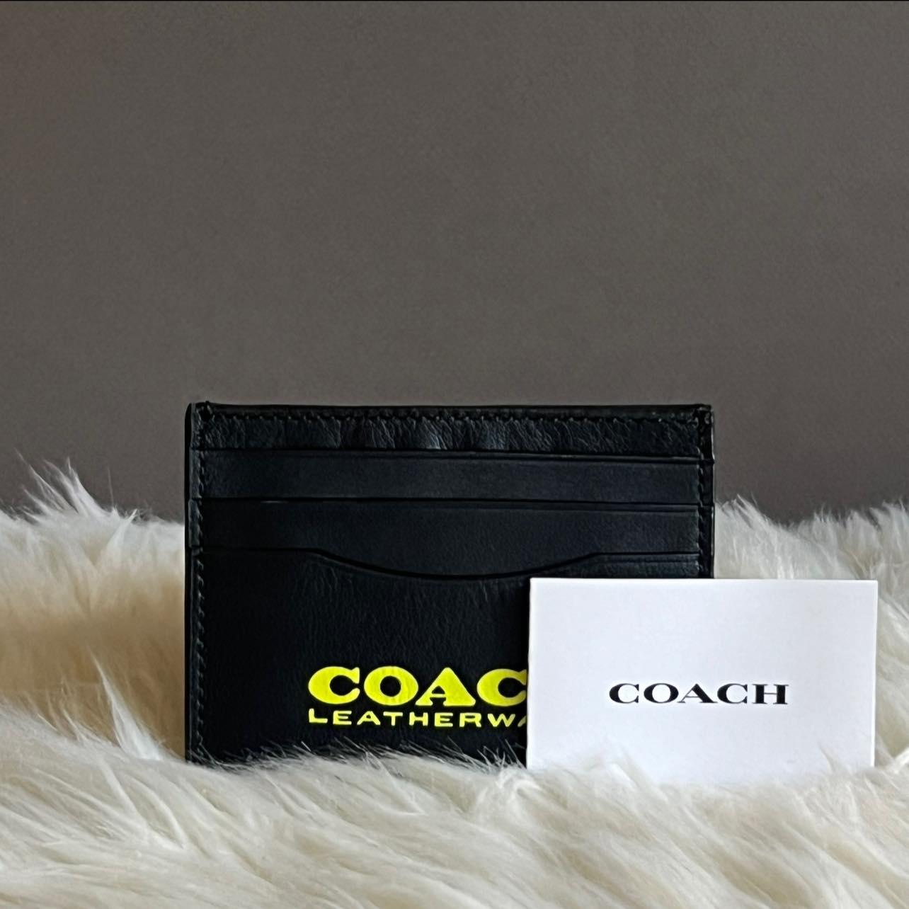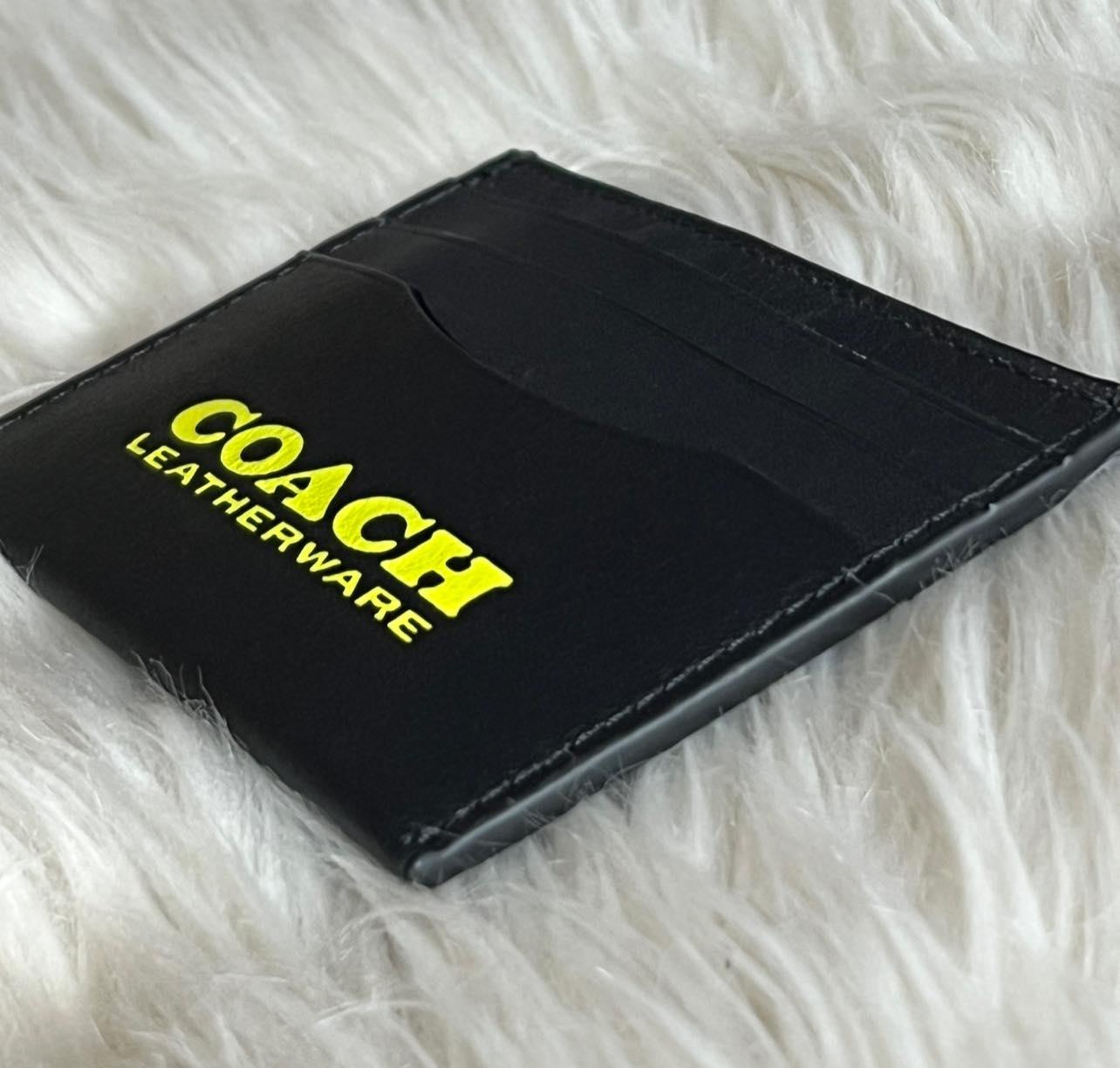 Expertly crafted with style and functionality in mind, the C5352- Coach Card Case is a must-have accessory. Made from durable materials, this black and neon card case measures 4 inches in length and 3 inches in height, making it the perfect size to fit in your pocket or bag. Add a touch of luxury to your everyday routine with its sleek design and superior quality. MSRP $90.