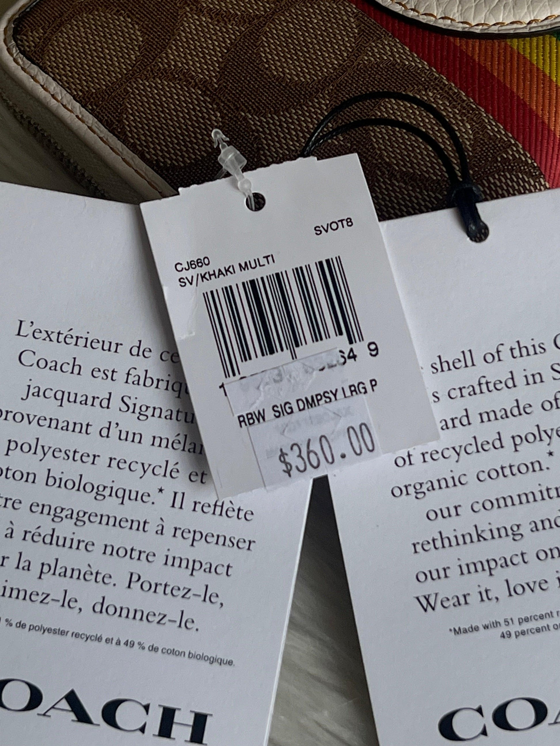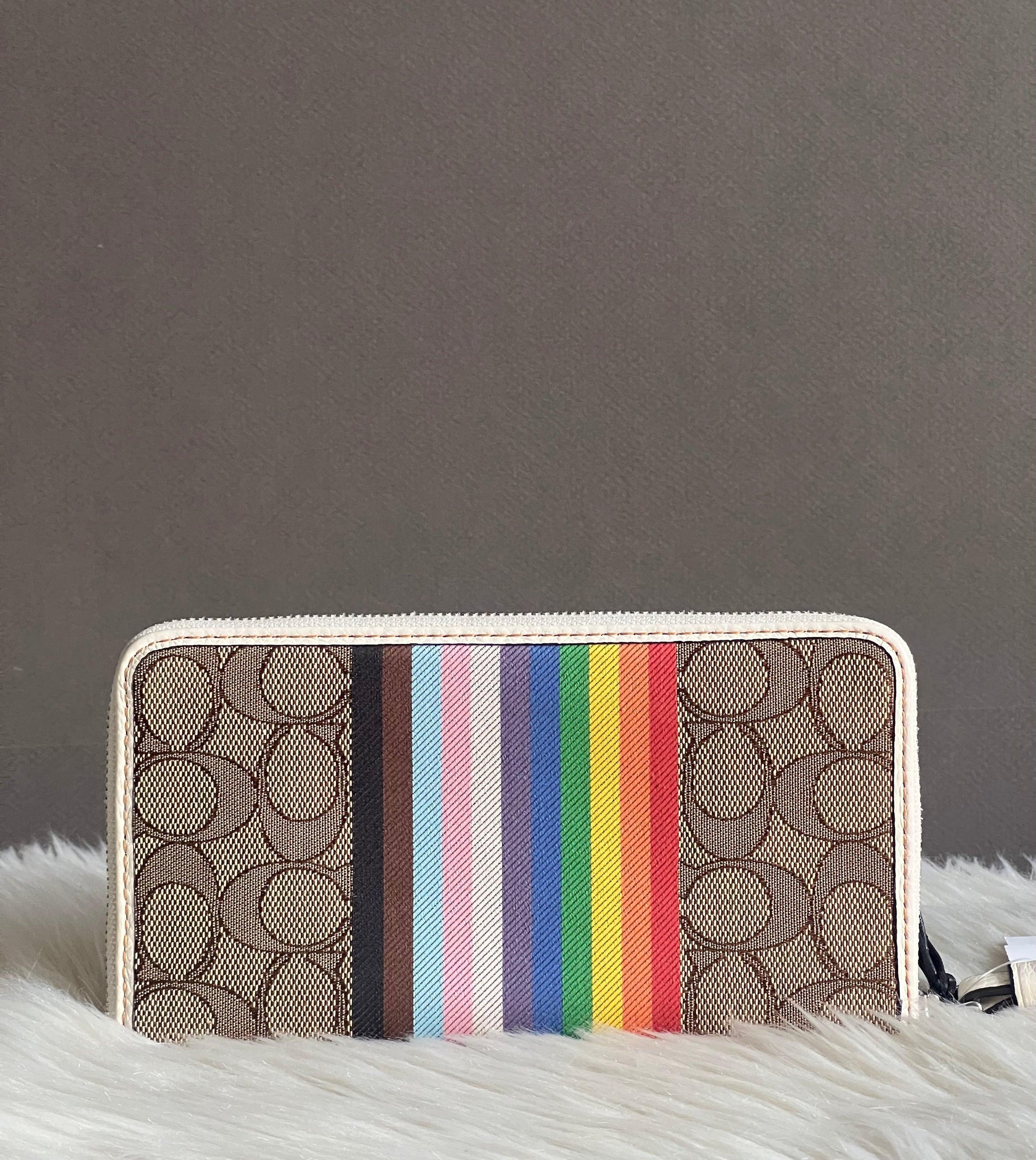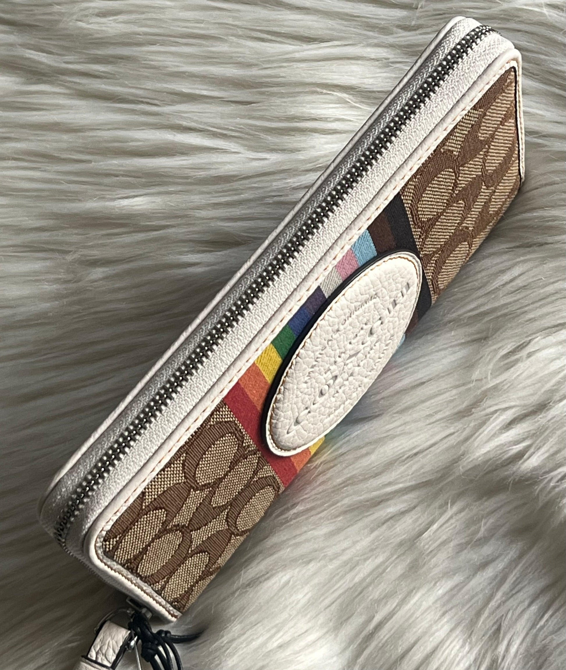 This Coach Dempsey Large Phone Wallet is made of Signature Jacquard Rainbow Stripe material. It is equipped with multiple pockets and card slots for convenient organization. With its stylish design, it is perfect for on-the-go use while also adding a pop of color to any outfit.