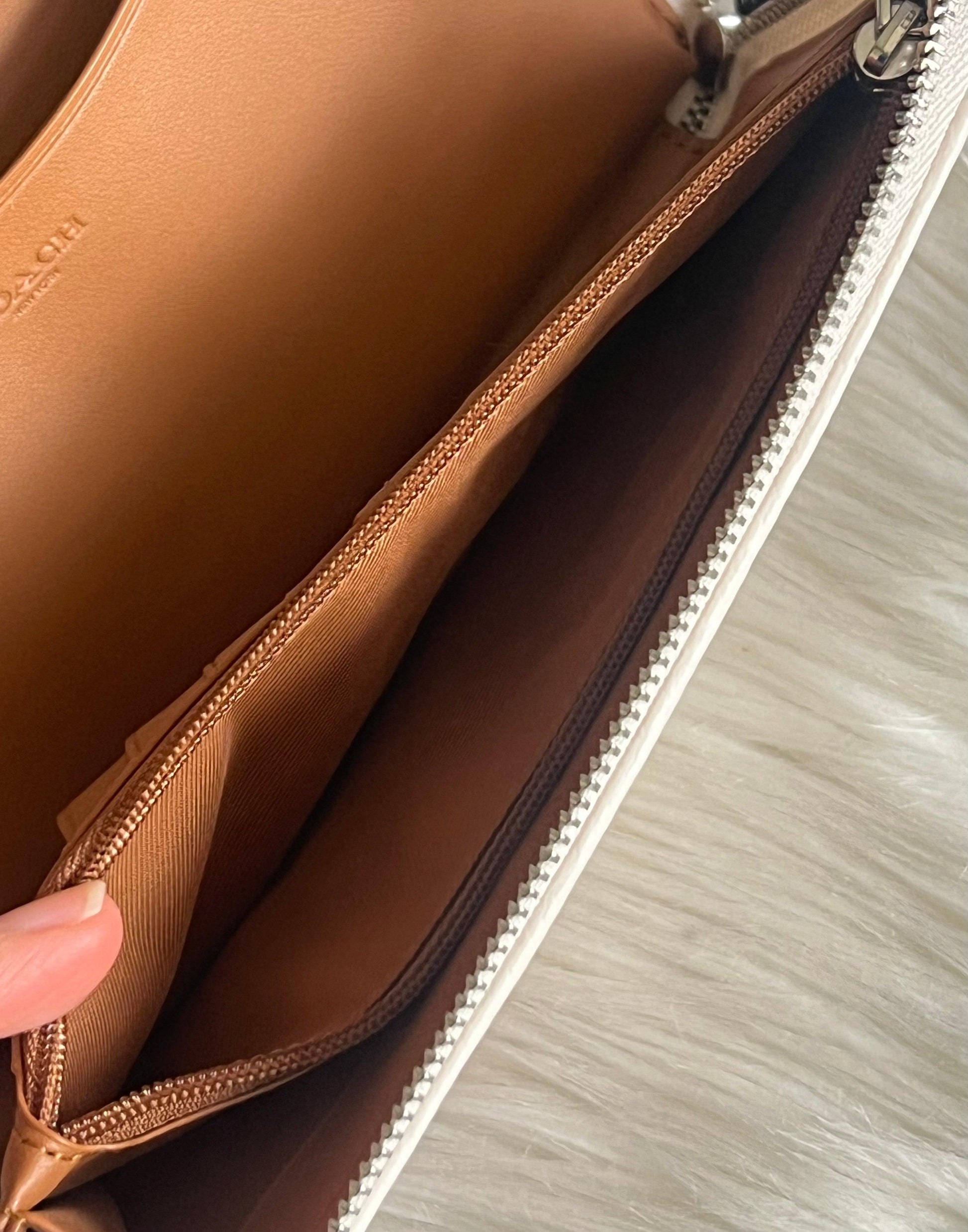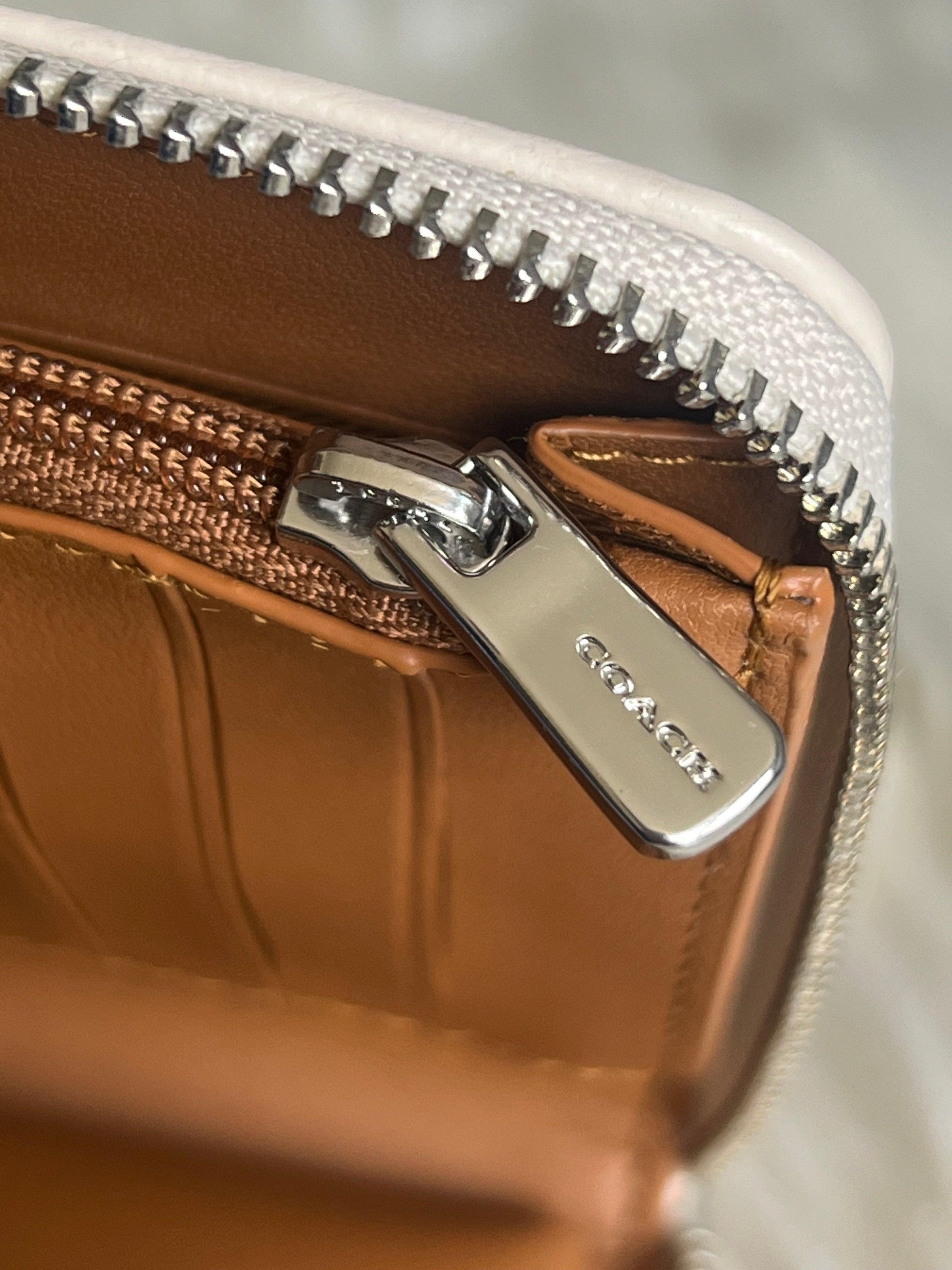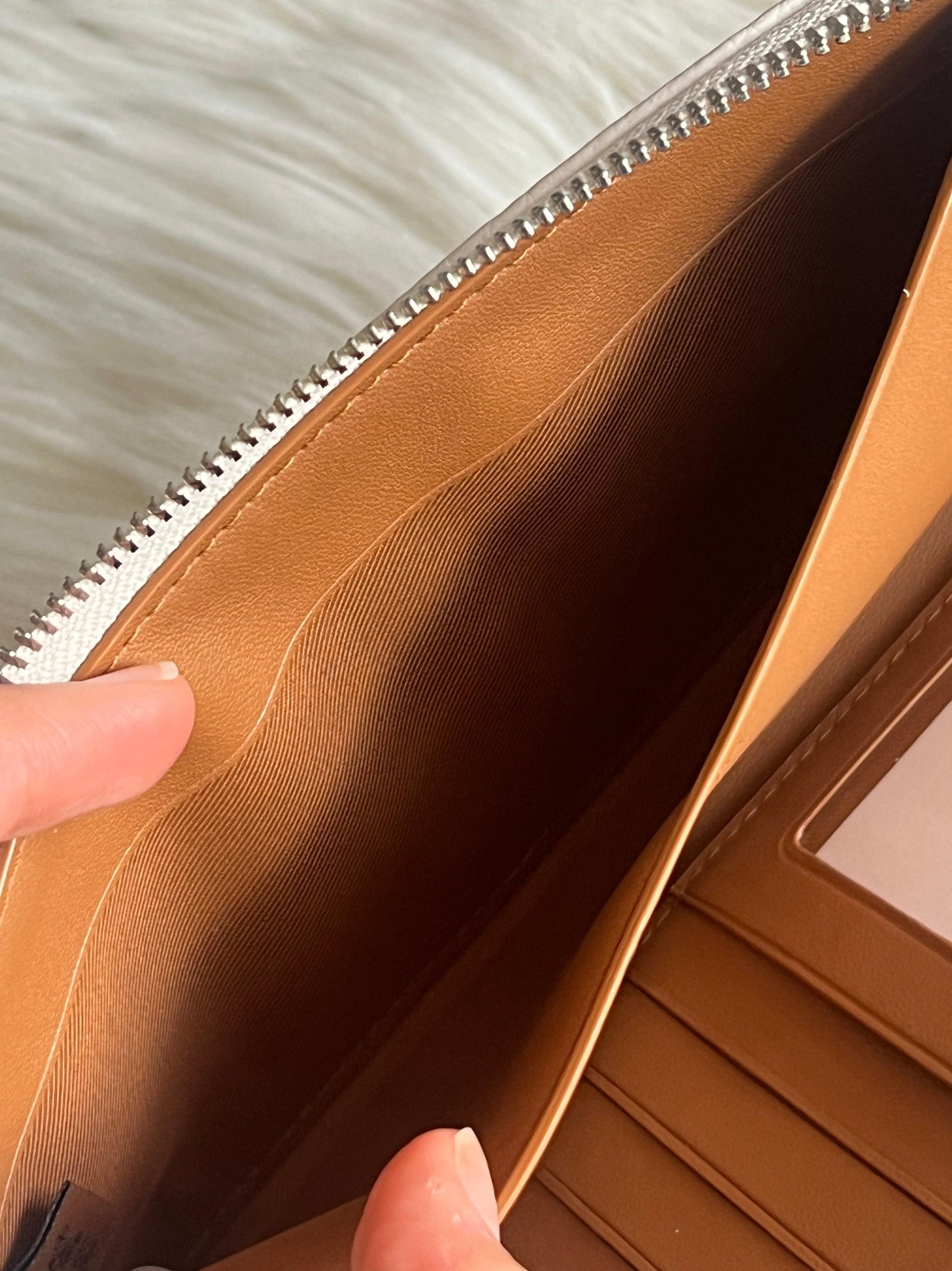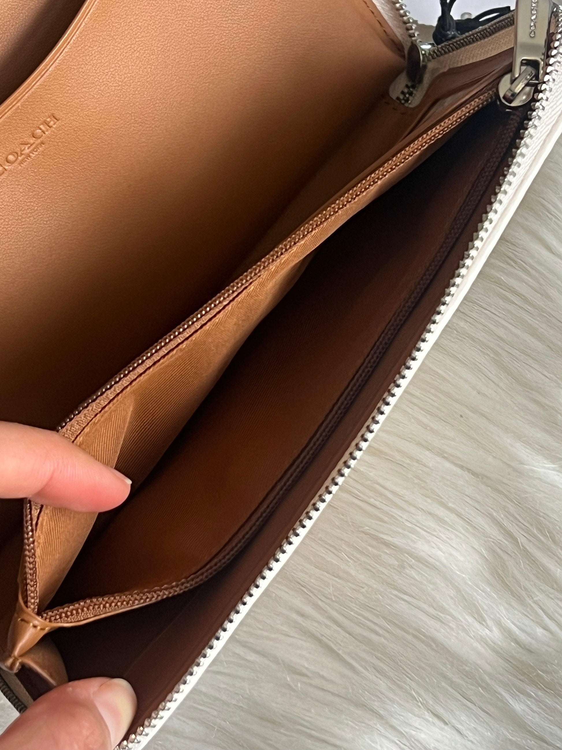 This Coach Dempsey Large Phone Wallet is made of Signature Jacquard Rainbow Stripe material. It is equipped with multiple pockets and card slots for convenient organization. With its stylish design, it is perfect for on-the-go use while also adding a pop of color to any outfit.