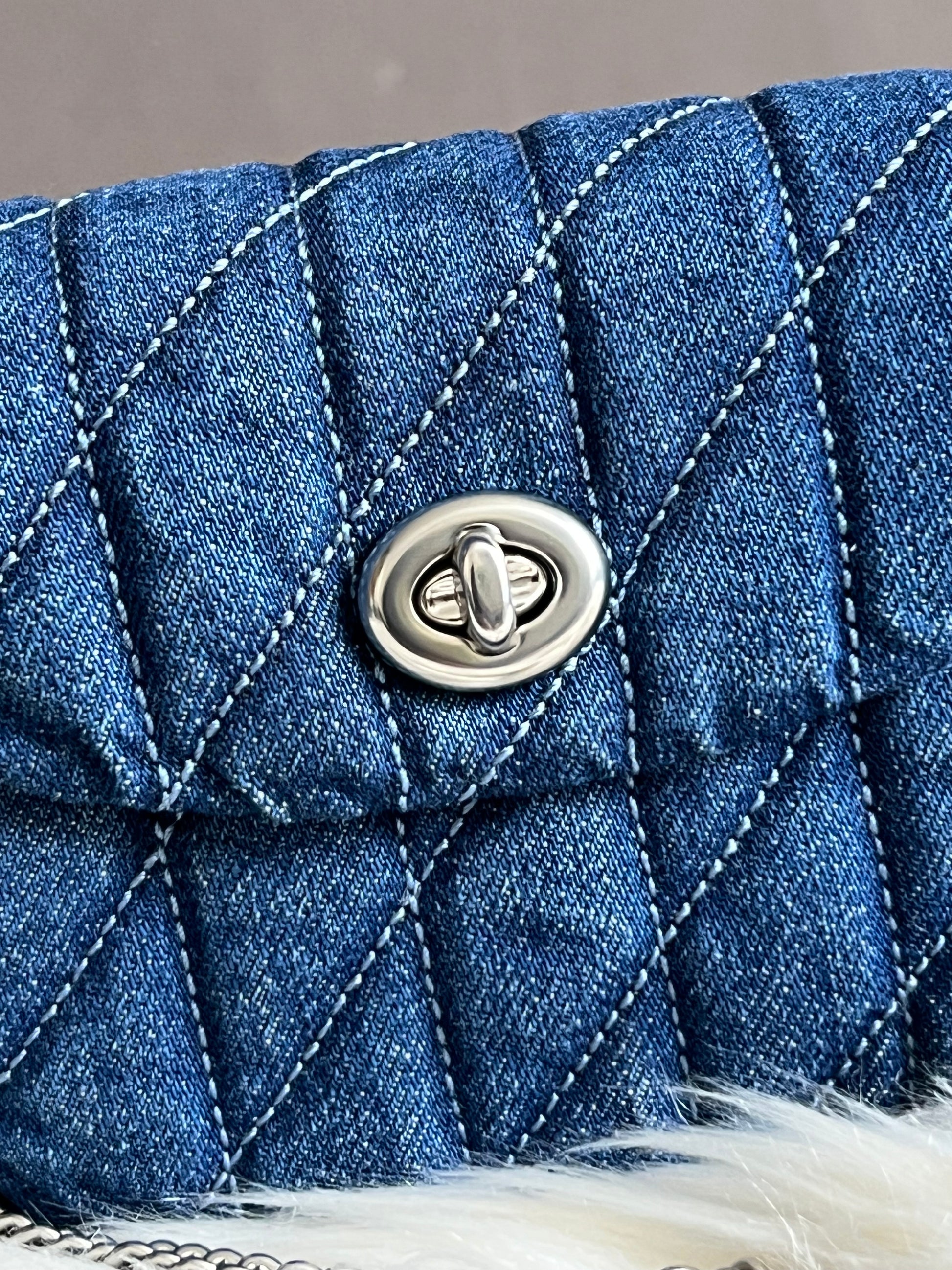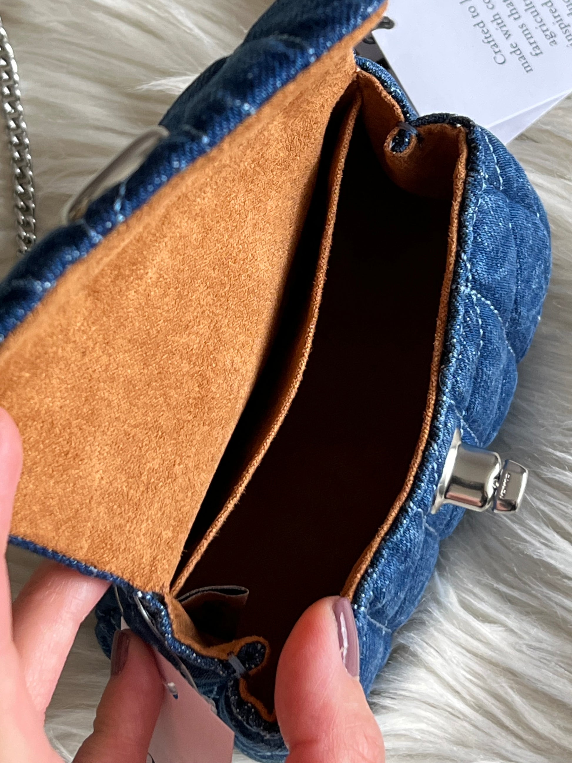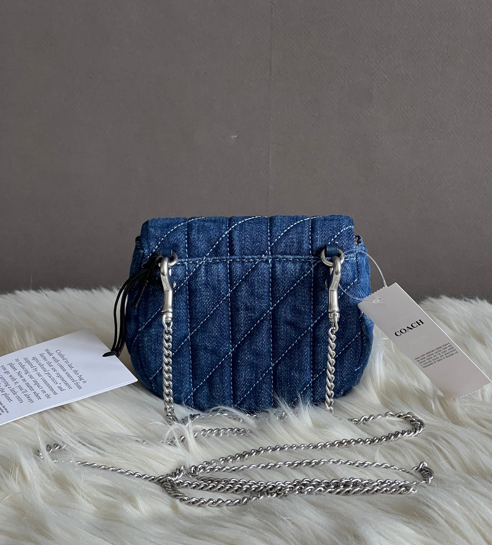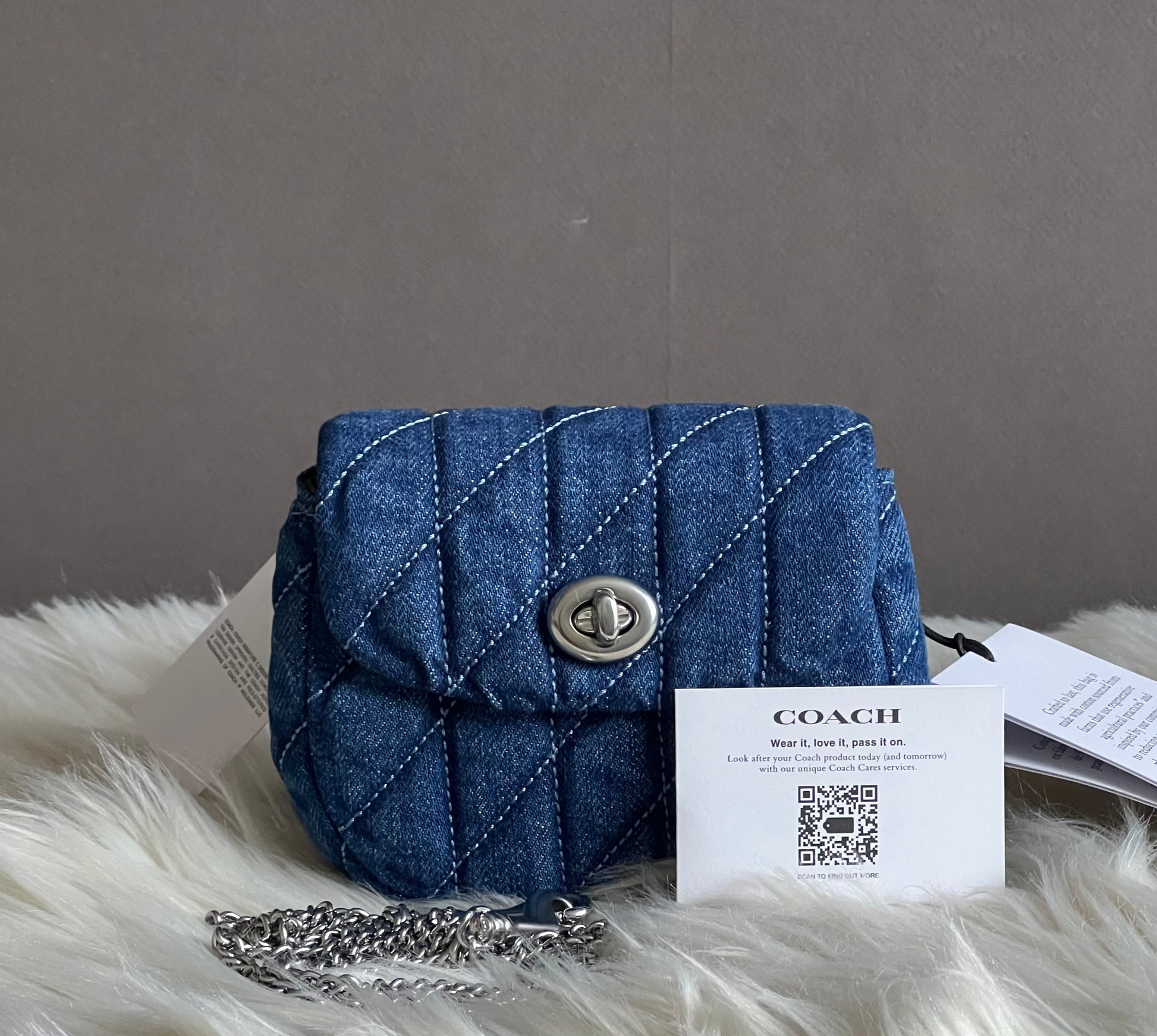 The Coach Denim Quilted Turnlock Card Case combines durability with sophisticated design. Made from premium denim, its quilted texture provides enhanced protection for cards, while the turnlock closure ensures secure storage. This card case is an essential accessory, designed for functionality and style, accommodating multiple cards with ease.