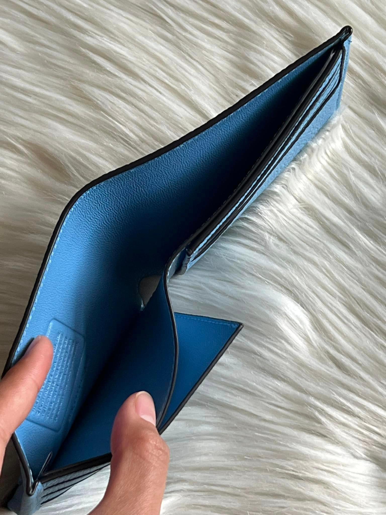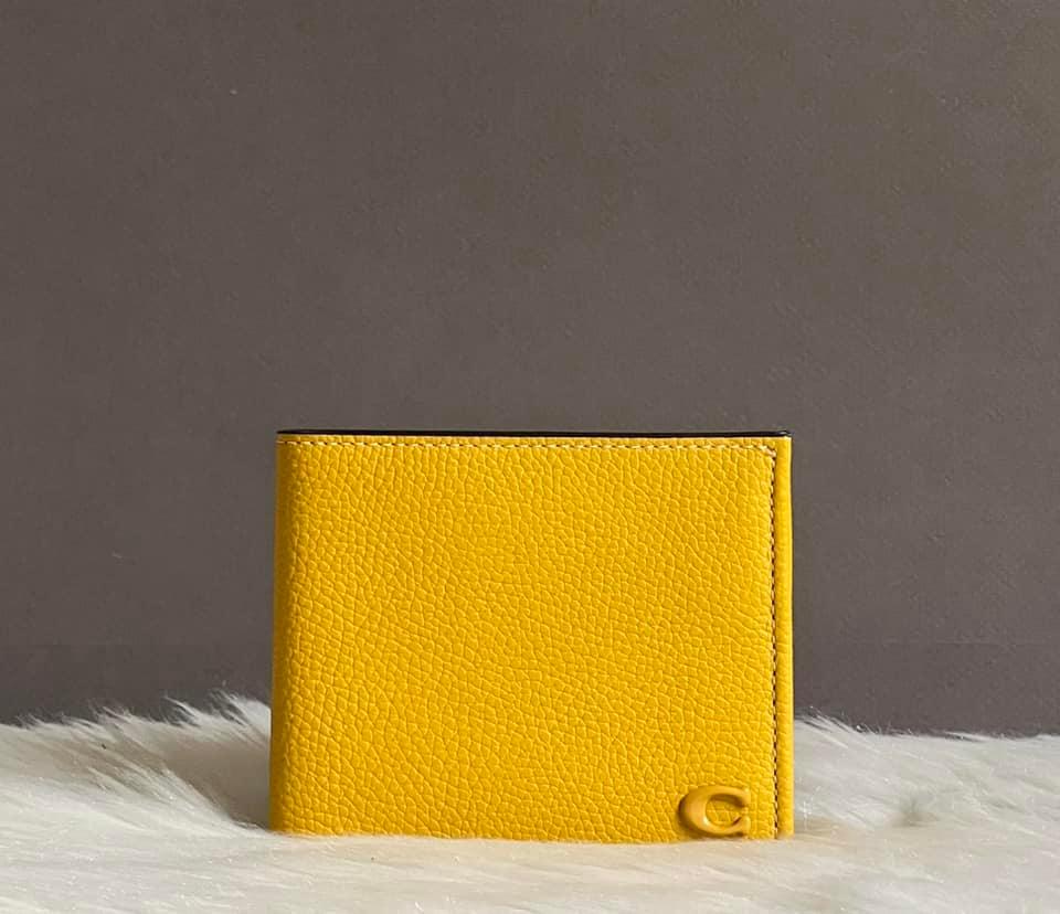 Expertly crafted from high-quality leather, the Coach Men's Double Billfold Wallet is a stylish and functional accessory. Featuring a double billfold design, this wallet offers ample space for all your cards and cash. Available in a pool color with a yellow gold finish, this wallet is the perfect blend of sophistication and utility. A must-have for any modern man.