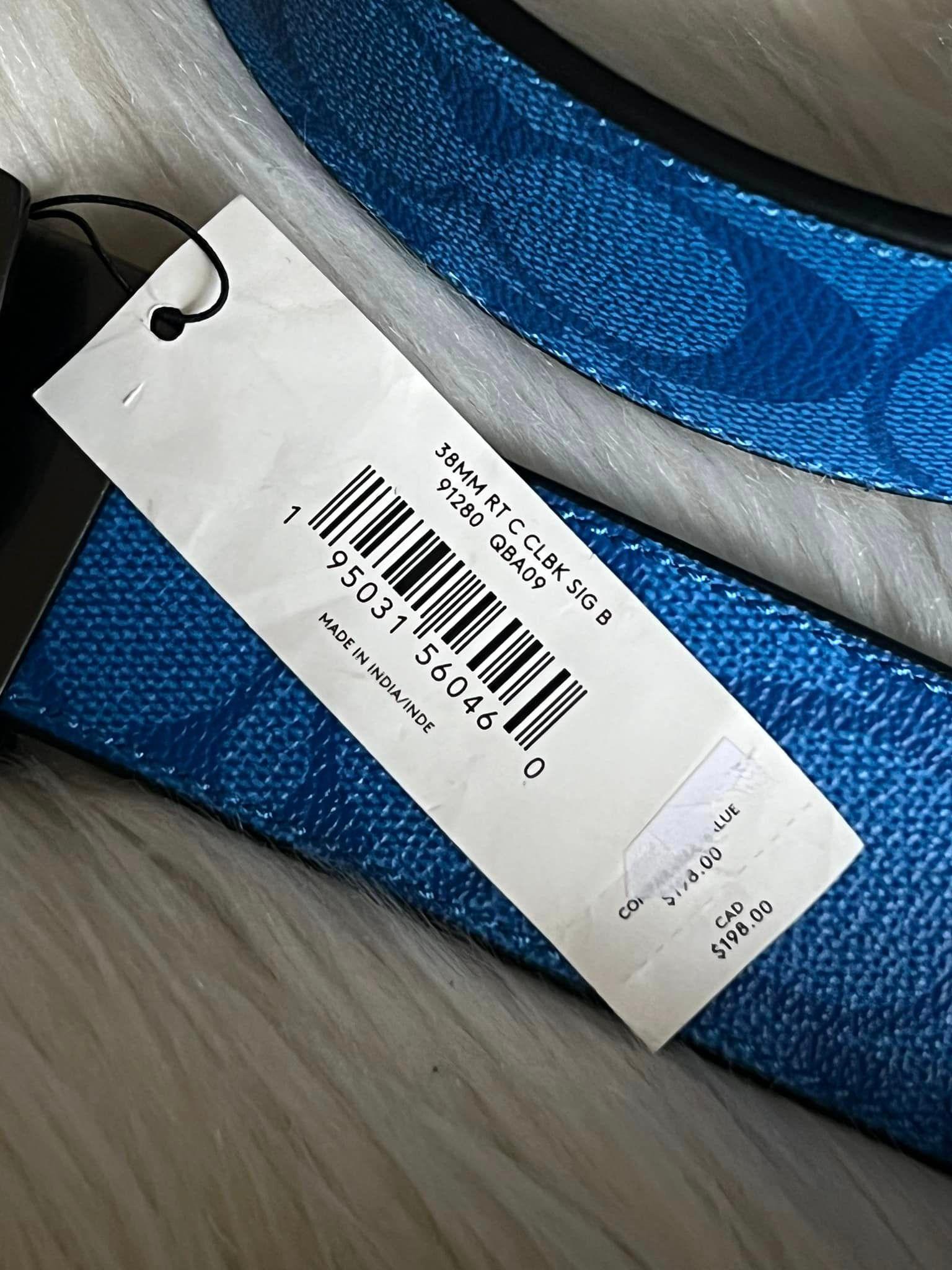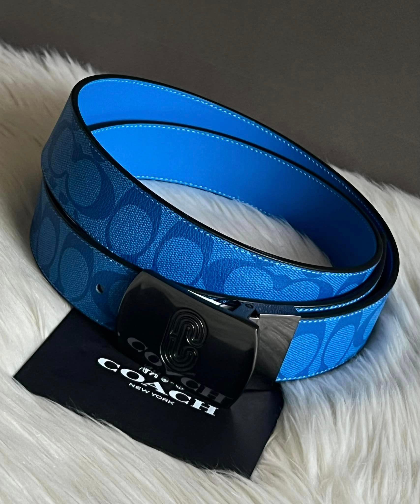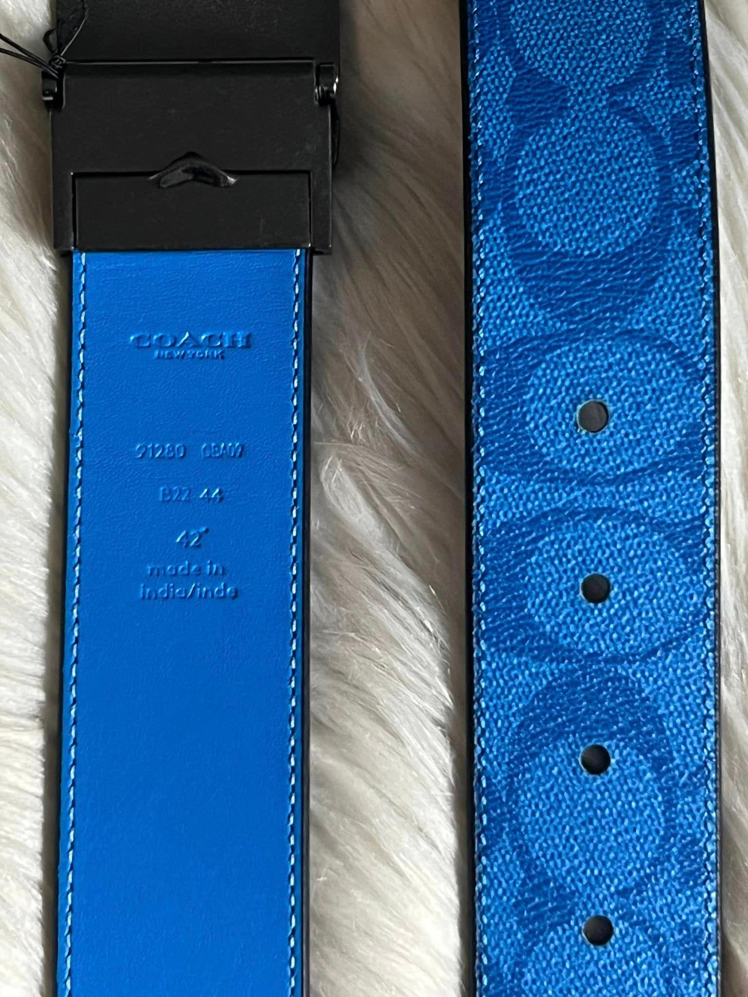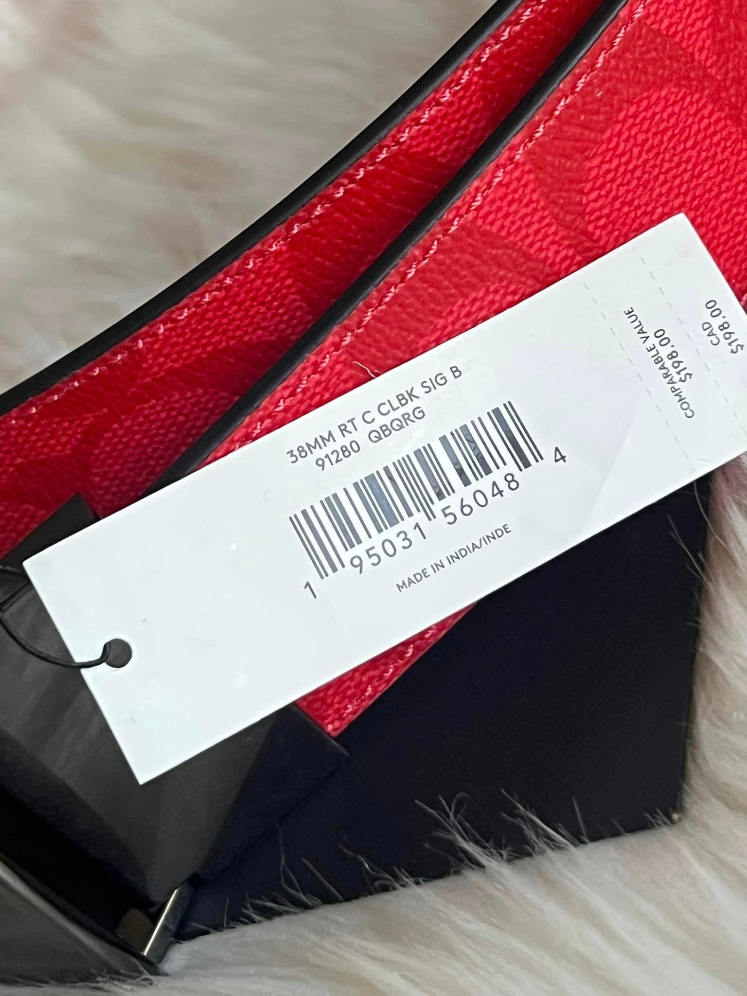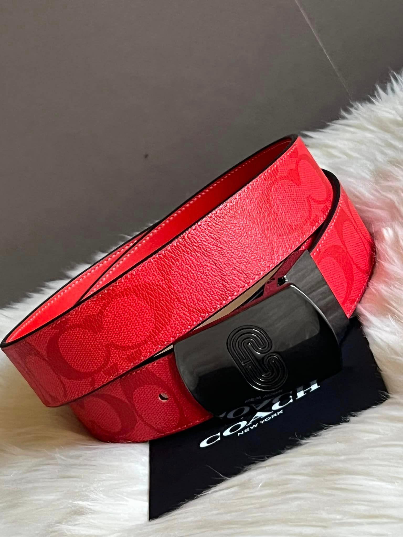 This reversible belt from Coach features a sleek gunmetal plaque buckle and is available in two stylish color combinations: Red/Black and Gunmetal/Blue. With a 38mm width, this belt is both fashionable and functional, making it a must-have for any wardrobe. Trust in Coach's expert design for a versatile and high-quality accessory. MSRP $198.