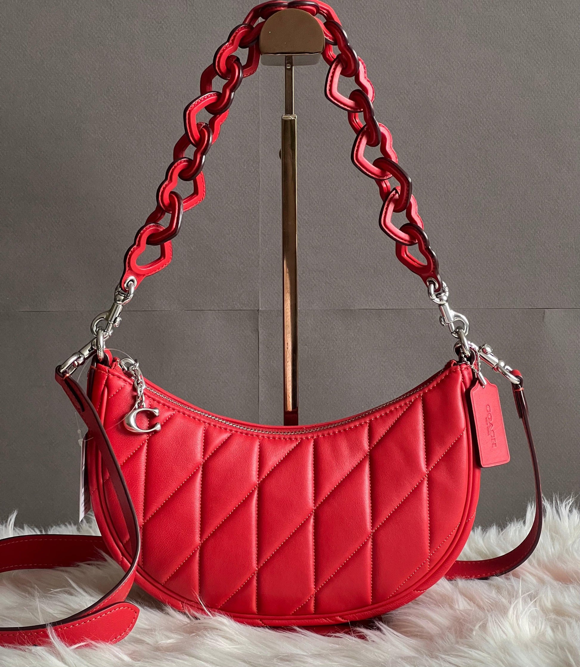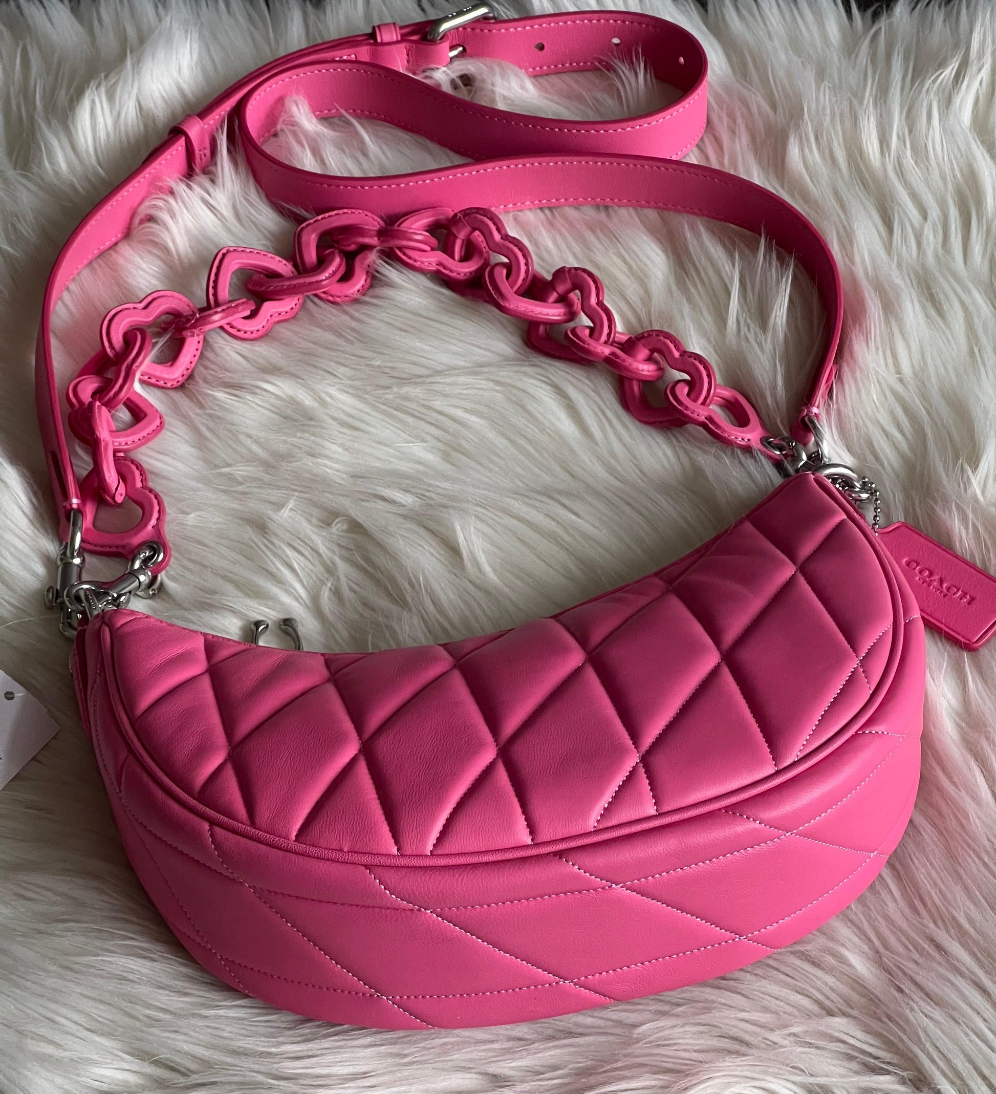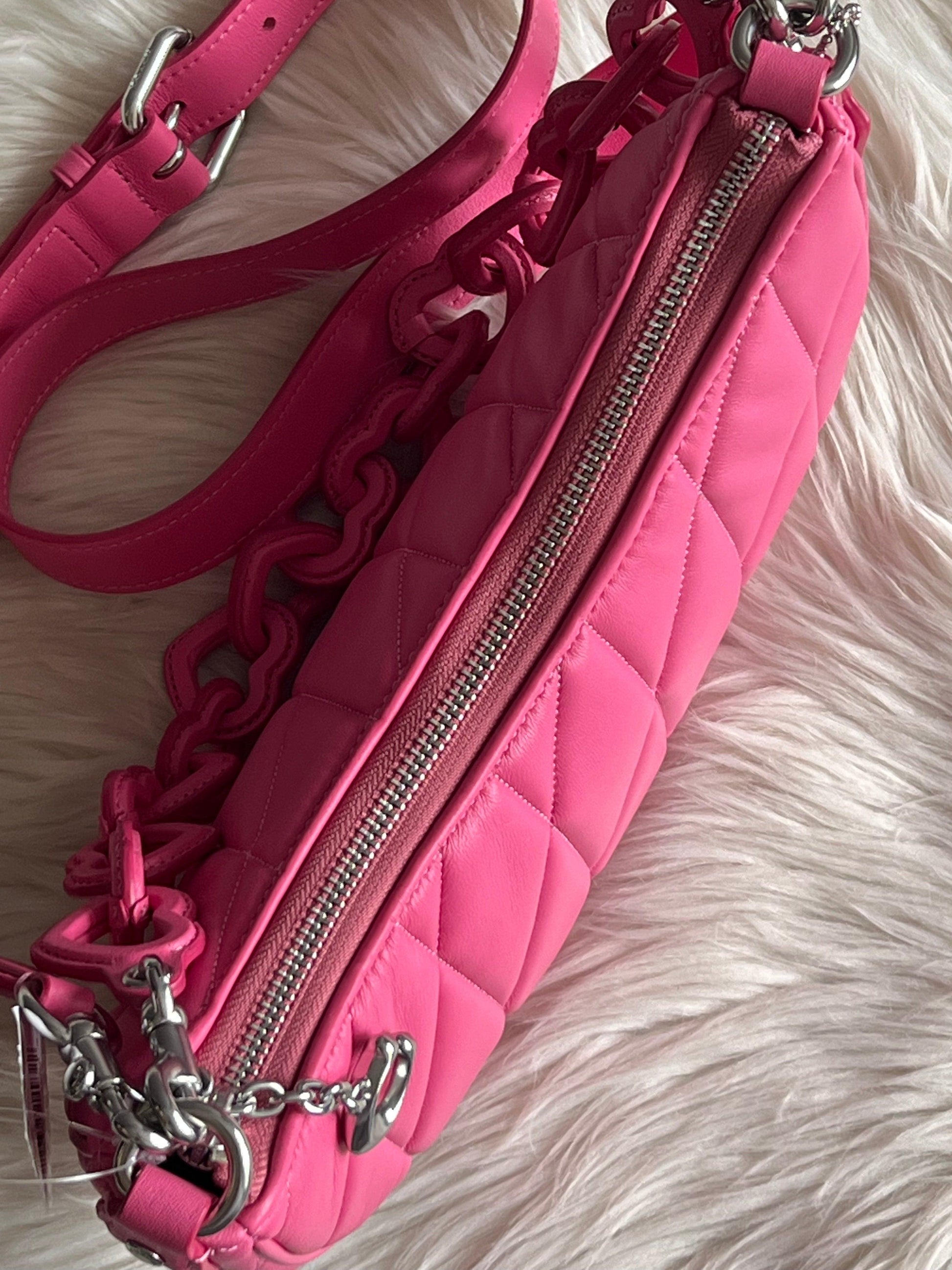 Introducing the Coach Mira Shoulder Bag, featuring a unique pillow quilting design and a heart-shaped strap. With this stylish bag, enjoy the perfect blend of fashion and functionality. Stay organized with the spacious interior and elevate your look with the eye-catching heart strap. A must-have for any fashion-forward individual. Available in Petunia and Sport Red colors.