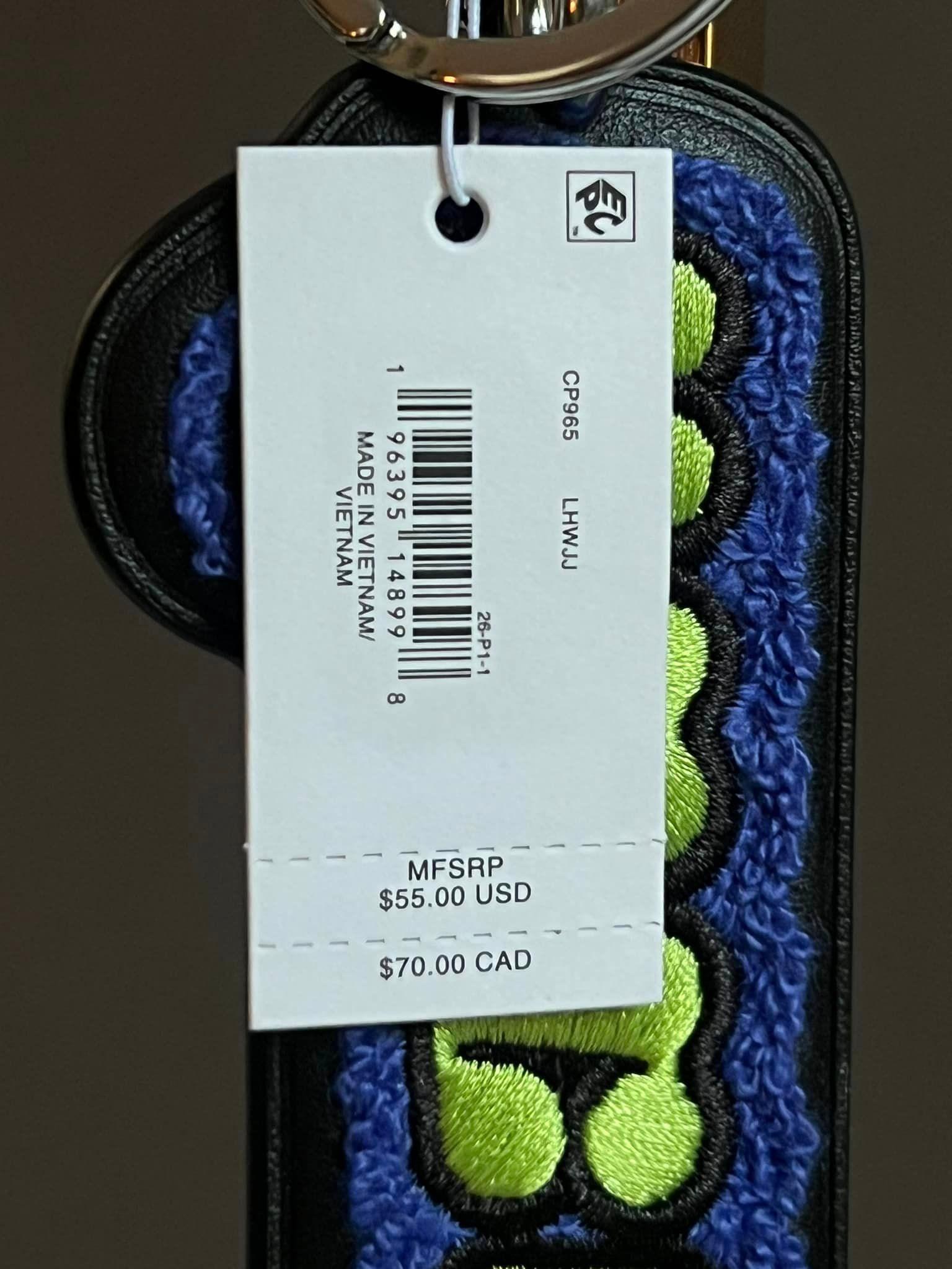 The Coach The Lil Nas X Drop Bag Charm features an eye-catching design of silver and lime green multi-colors. At 1.75” (L) x 4.75” (H), this charm is the perfect size to add a pop of color and style to any bag. Made with CP965 material, it is both durable and fashionable. Elevate your accessories game with this one-of-a-kind charm.