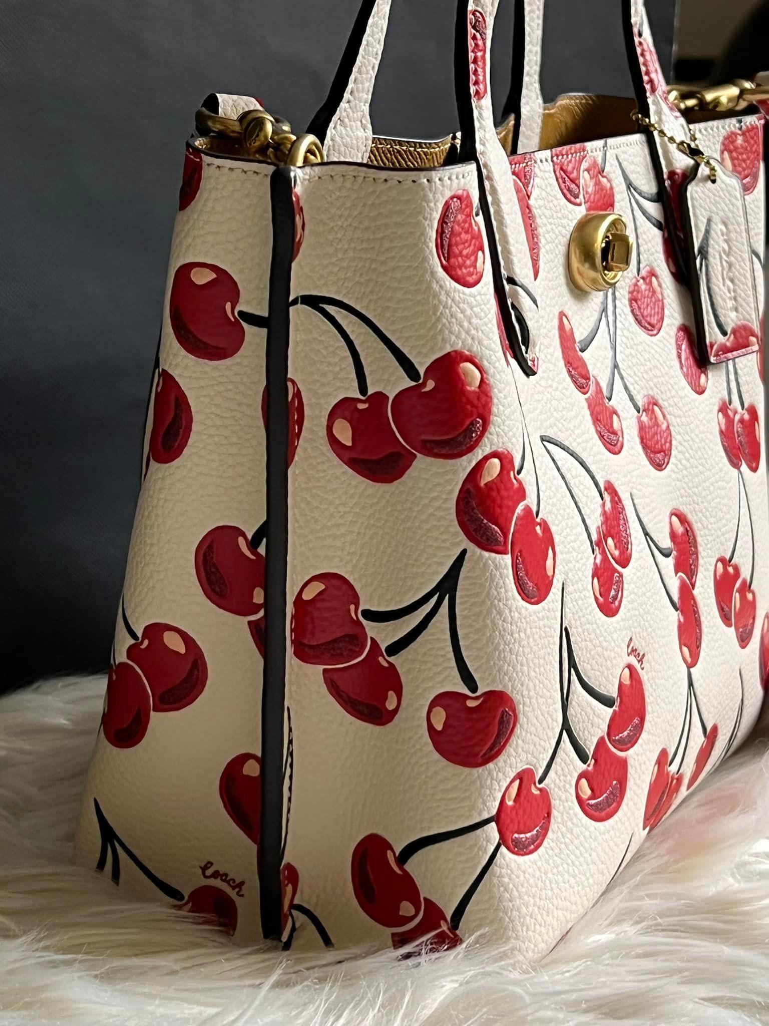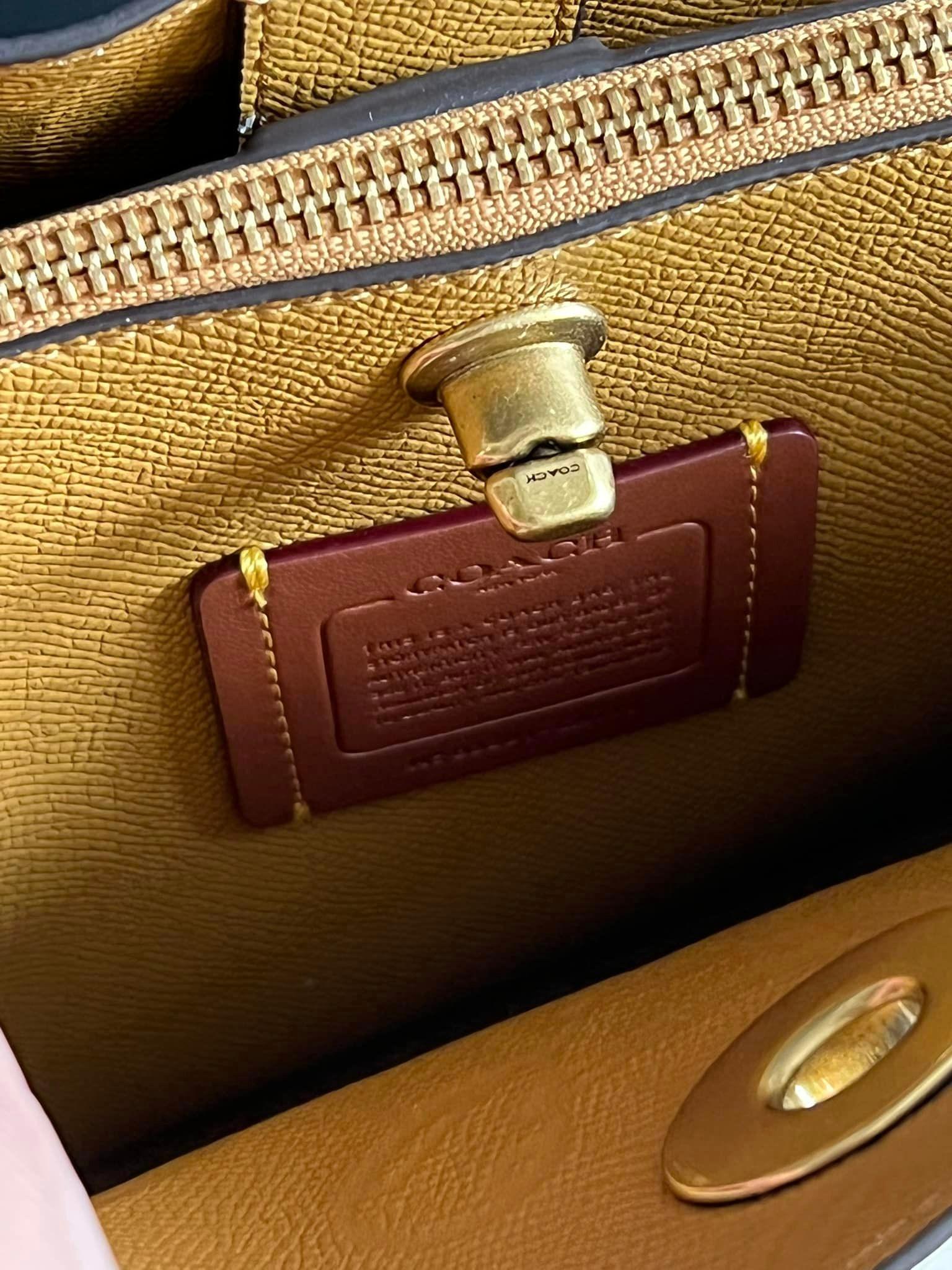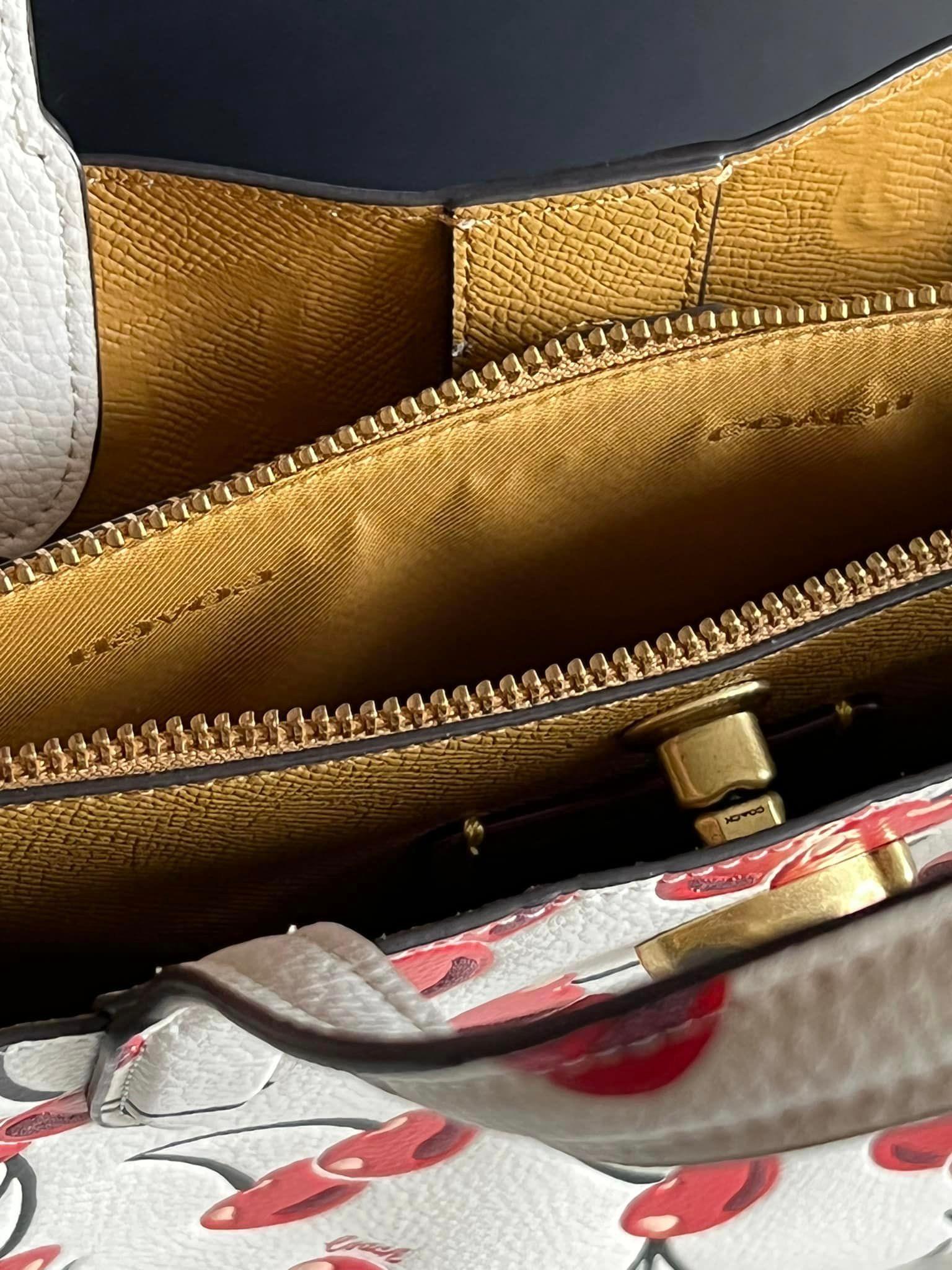 Polished pebble leatherCenter zip compartmentTurnlock and magnetic snap closuresHandles with 4 1/2" dropDetachable strap with 21 1/2" drop for shoulder or crossbody wearFour protective feet at base