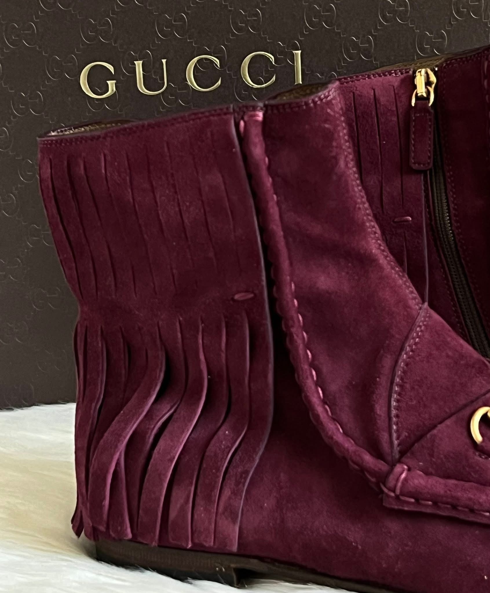Expertly crafted with luxurious leather and the iconic Horsebit detail, these Gucci Mocasin Boots offer unmatched style and comfort. With a classic design, these boots are perfect for any occasion. Elevate your wardrobe with these timeless boots and make a statement of elegance and sophistication.