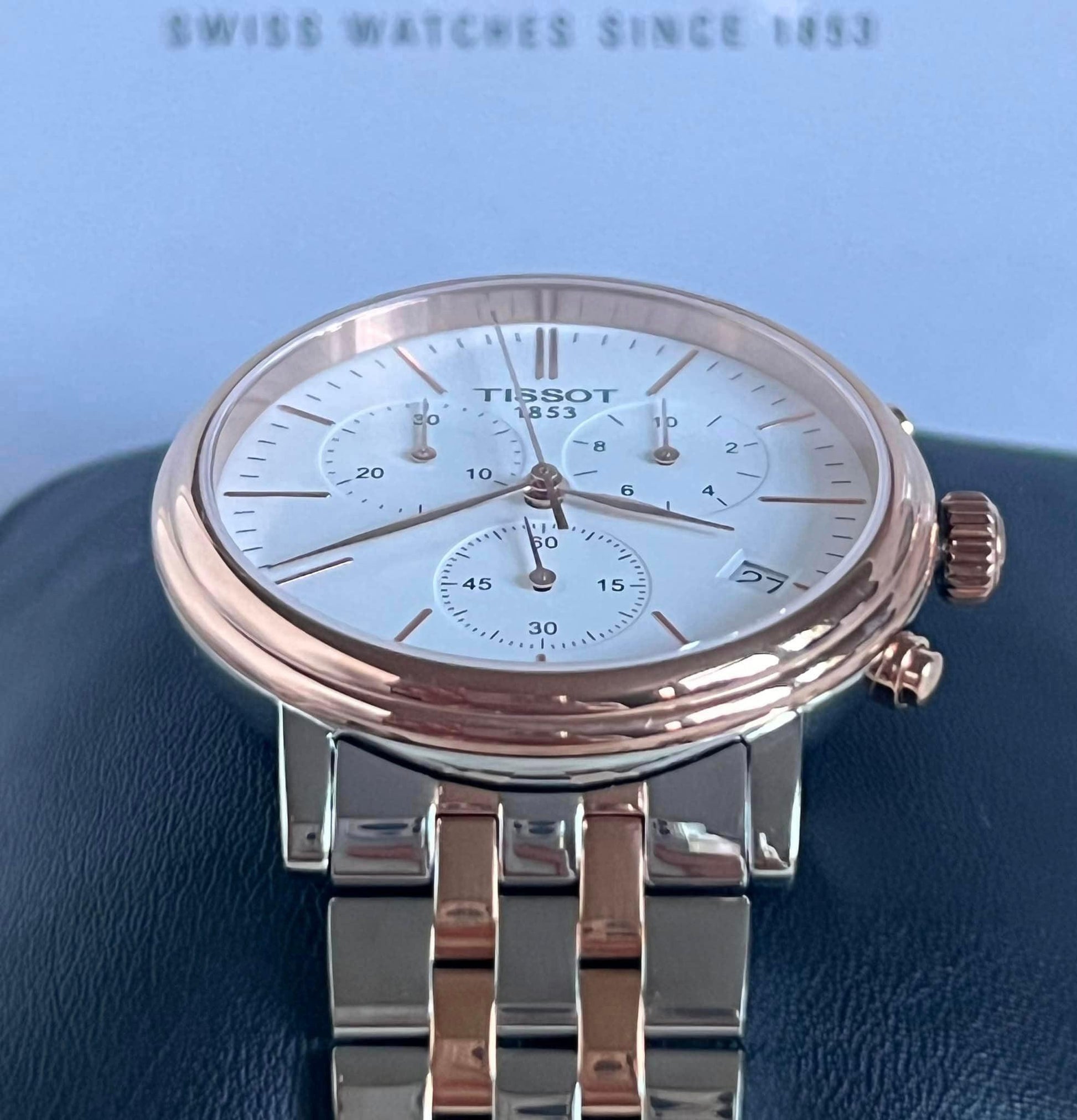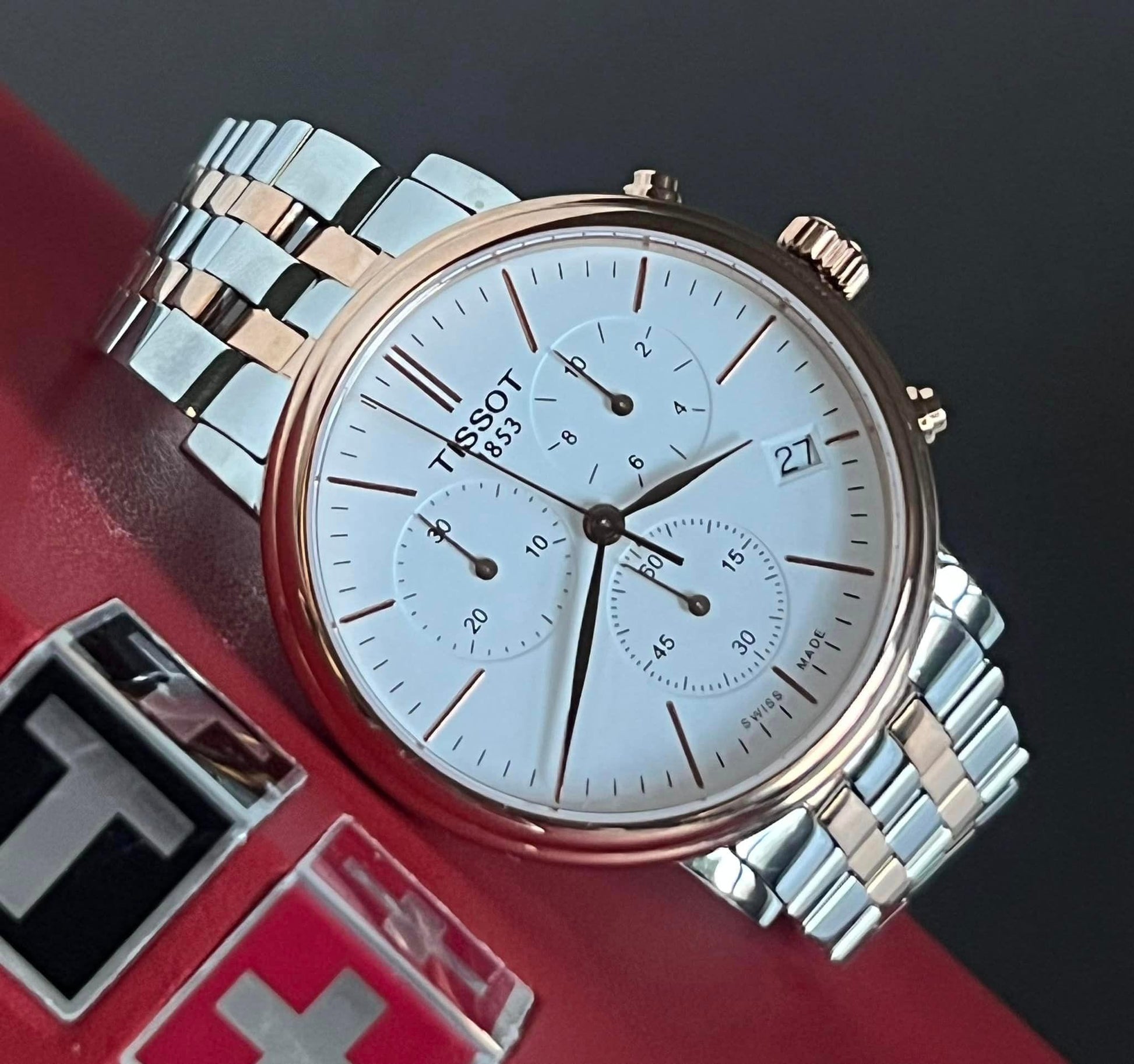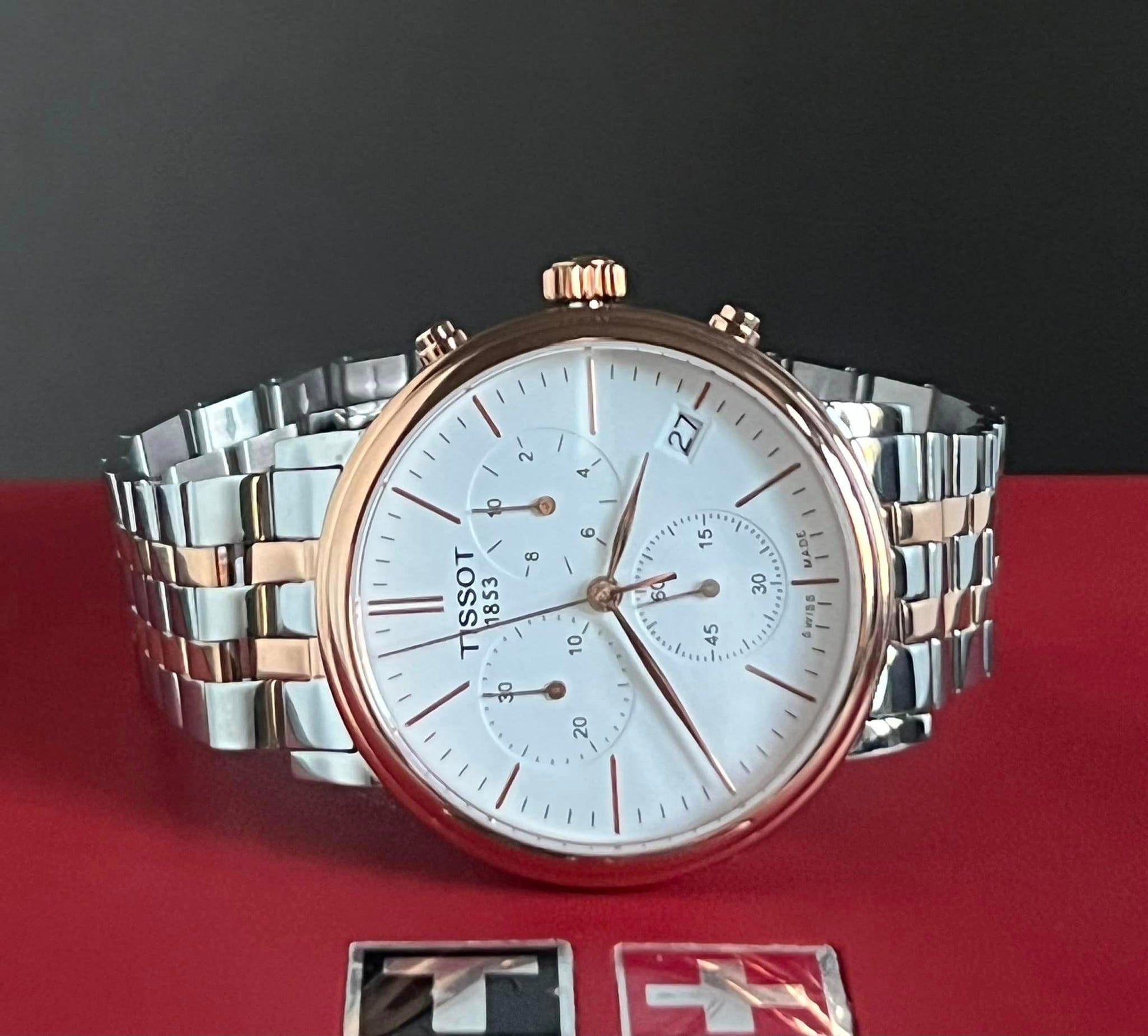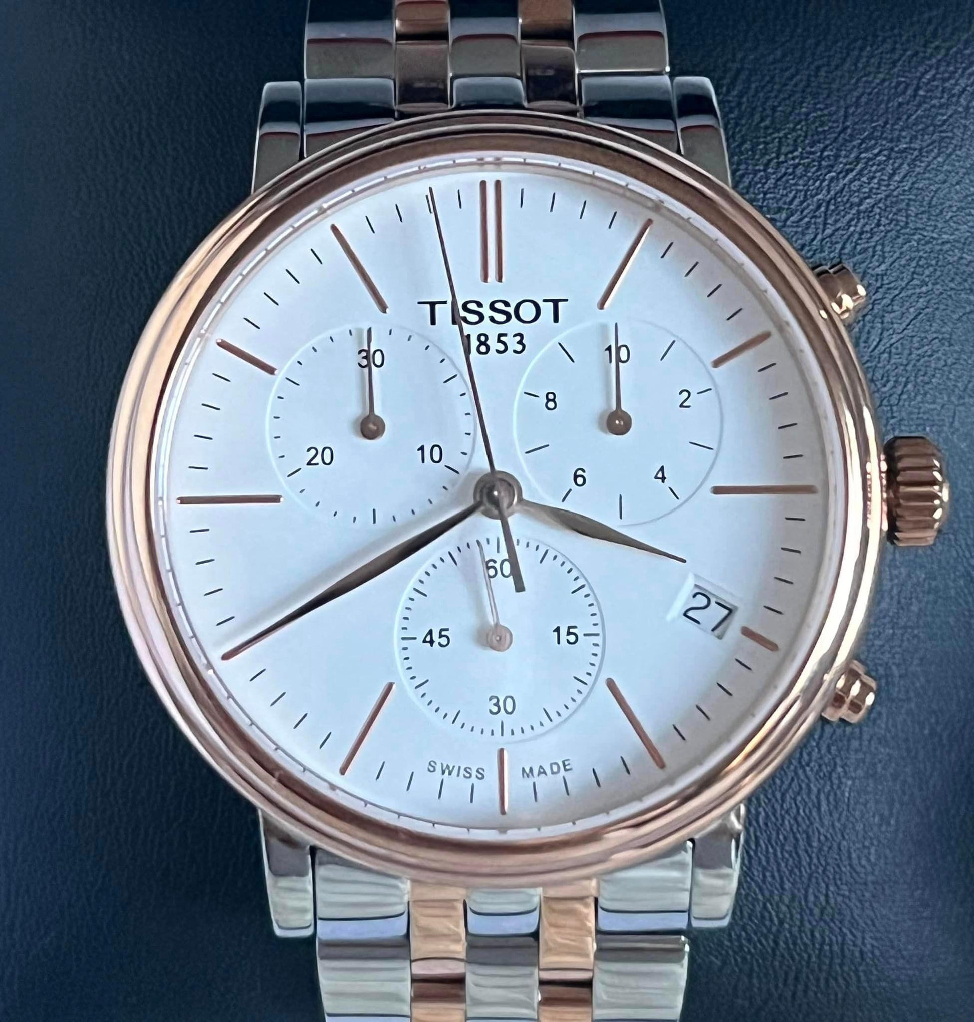 Discover the perfect blend of style and function with the Tissot Men's Carson Premium Chronograph Watch. With a sleek 41mm case and water resistance up to 300M, this Swiss Quartz watch is built to withstand the elements. Featuring a scratch-resistant Sapphire Crystal with anti-reflective coating, this chronograph watch is both durable and easy to read. Expertly crafted, it's a timeless timepiece for the modern man. MSRP $850.