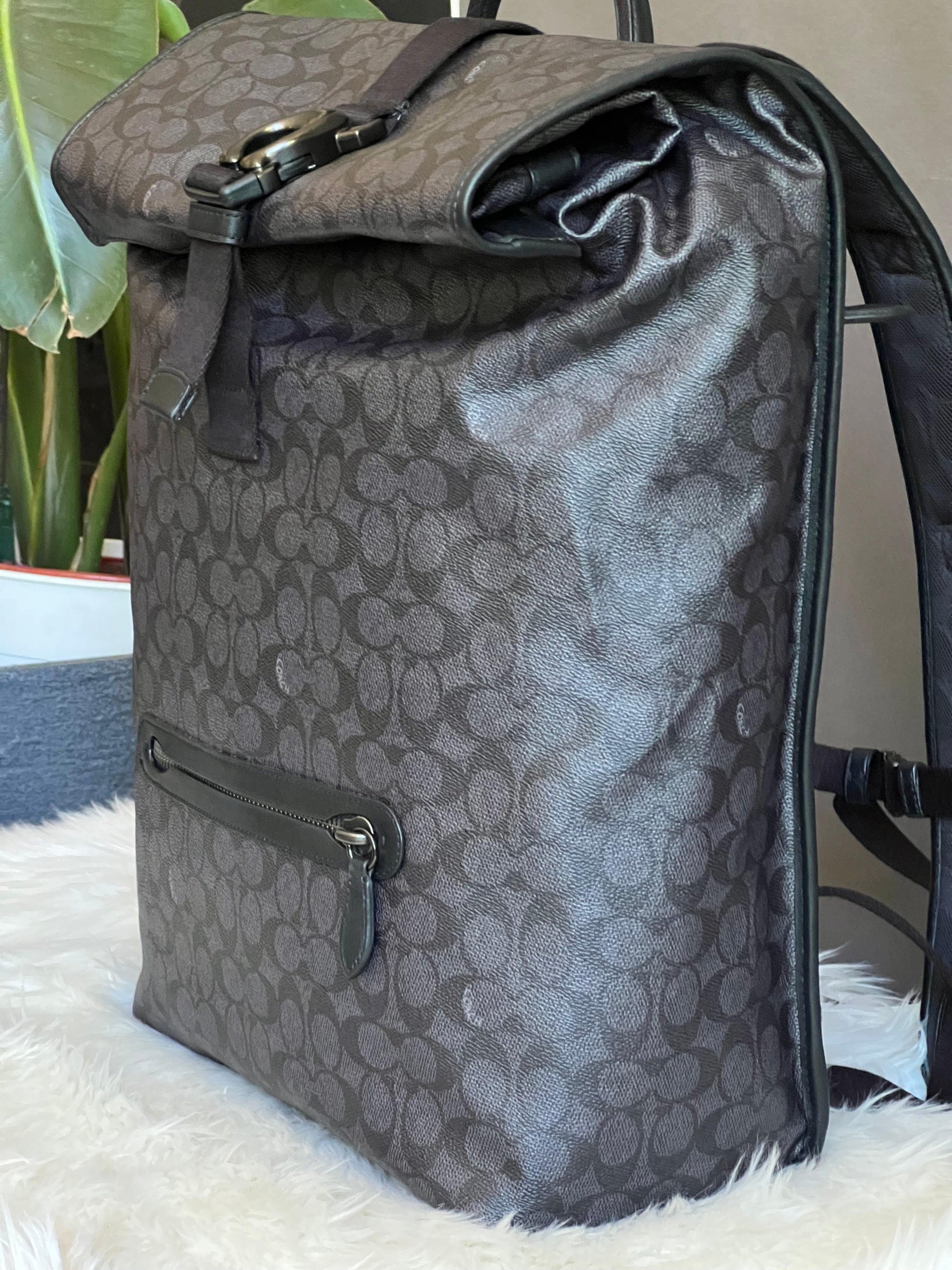 Stay organized and stylish with the Coach Beck Roll Top Backpack in Signature Canvas. Its durable and spacious design allows you to comfortably carry all your essentials, while its signature canvas material adds a touch of luxury. Perfect for both everyday use and travel.