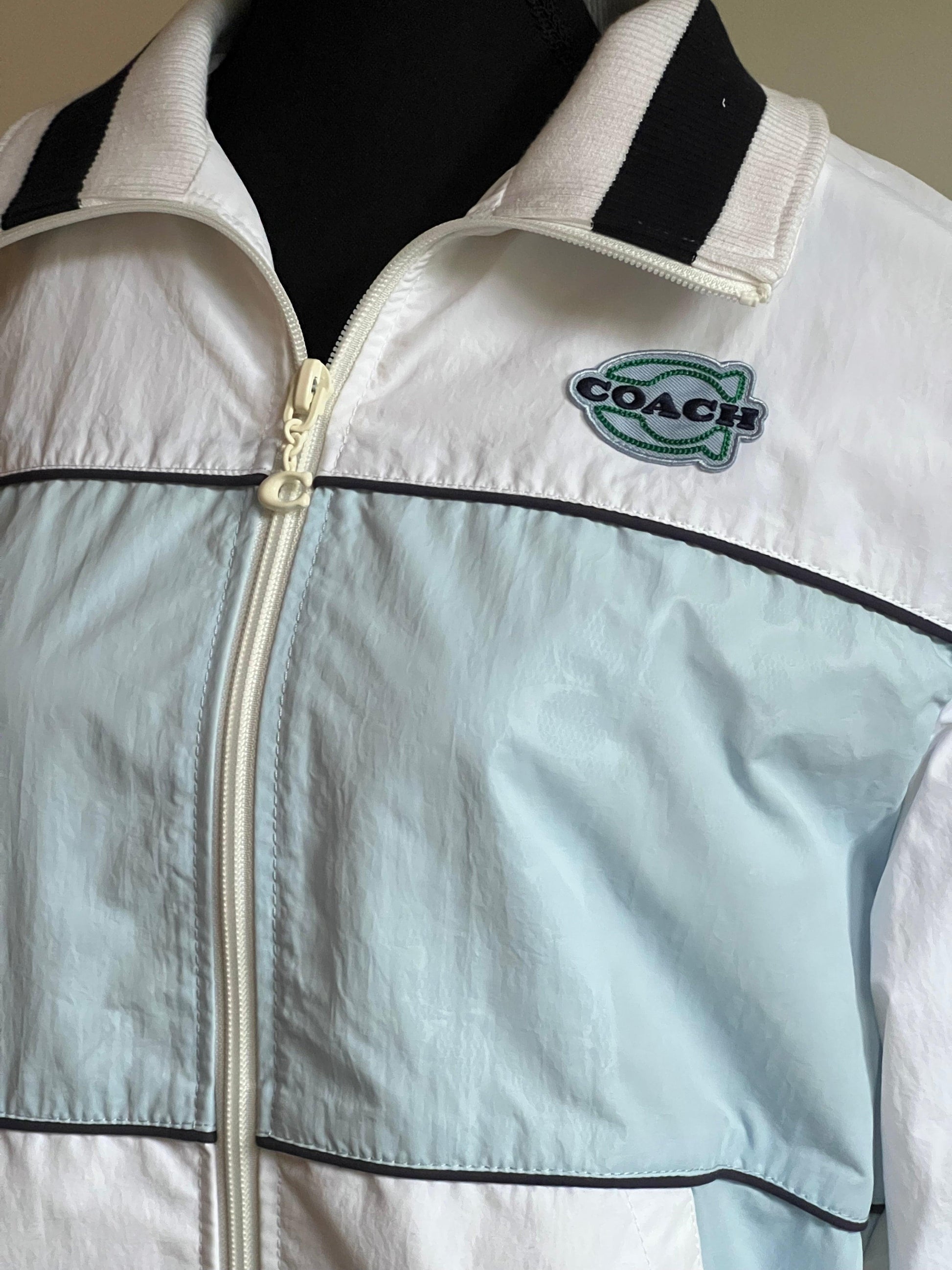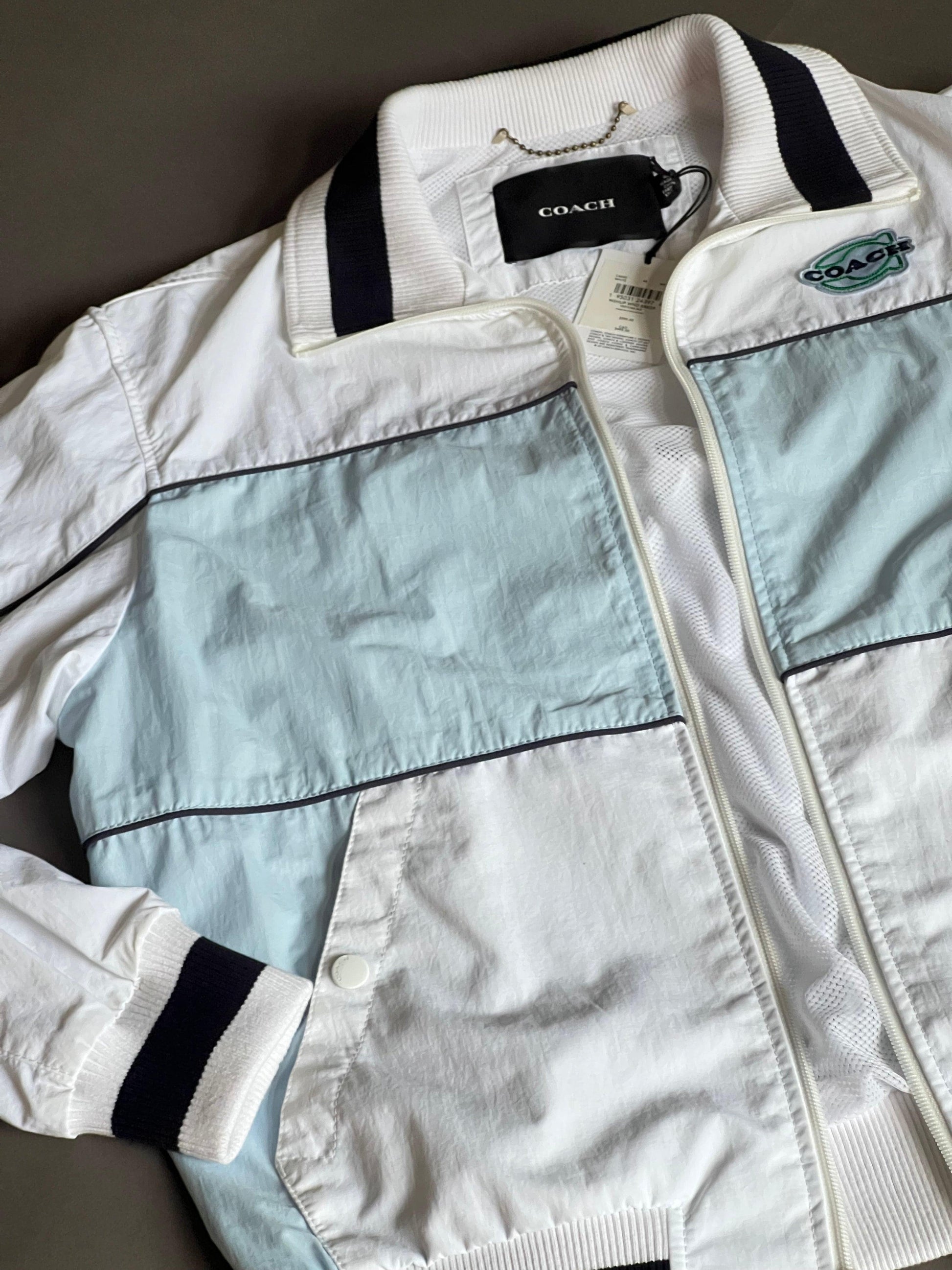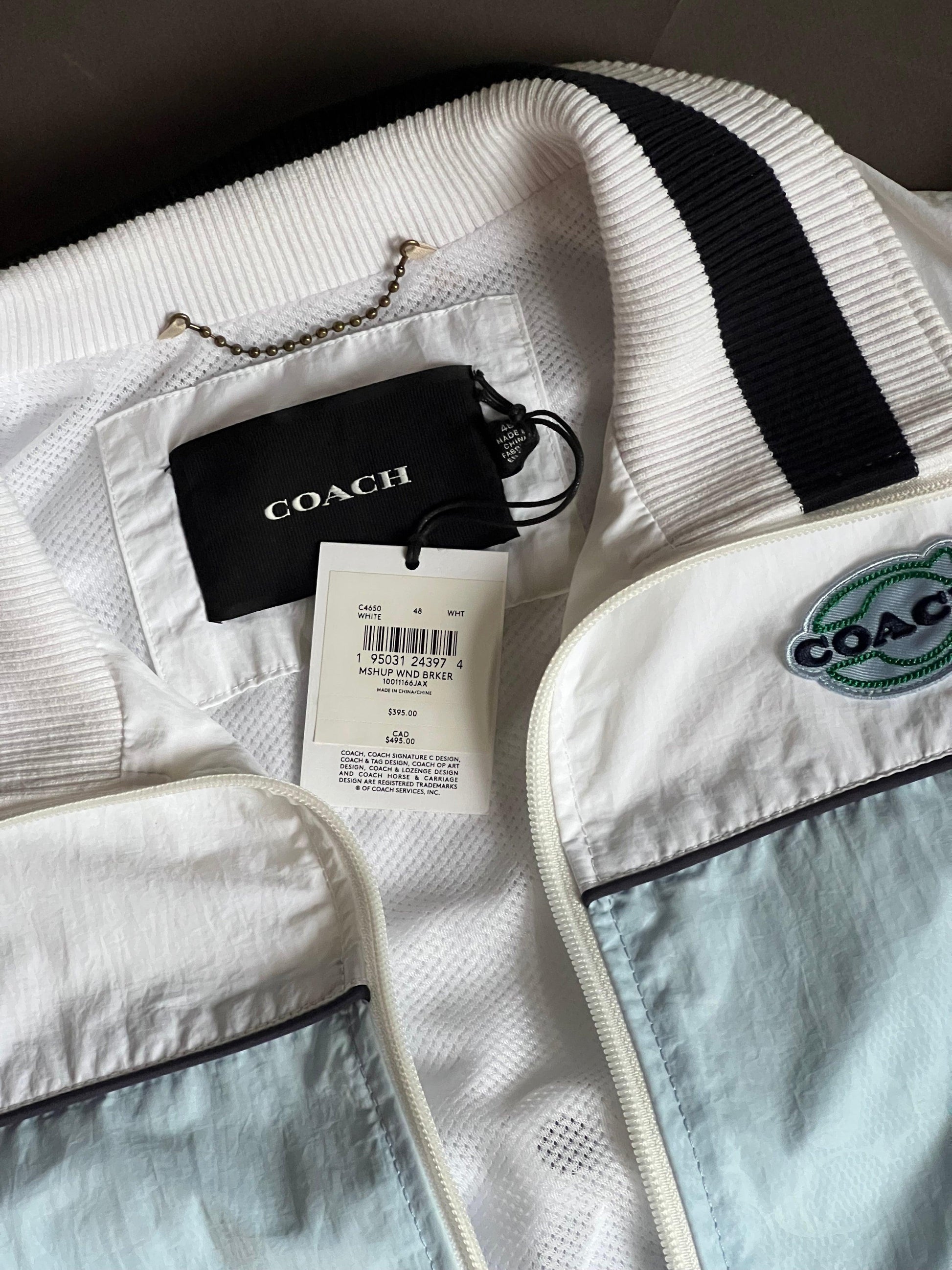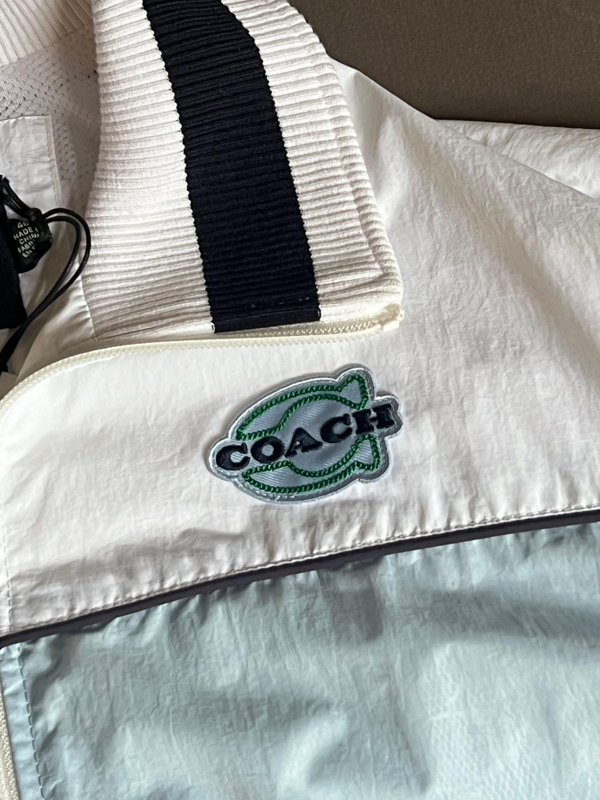 Introducing the Coach Colorblock Mashup Windbreaker, made with sustainable and lightweight recycled nylon. Stay stylish and eco-friendly with this windbreaker that features a unique colorblock design. Designed by industry experts, this windbreaker provides both style and functionality for any outdoor adventure.