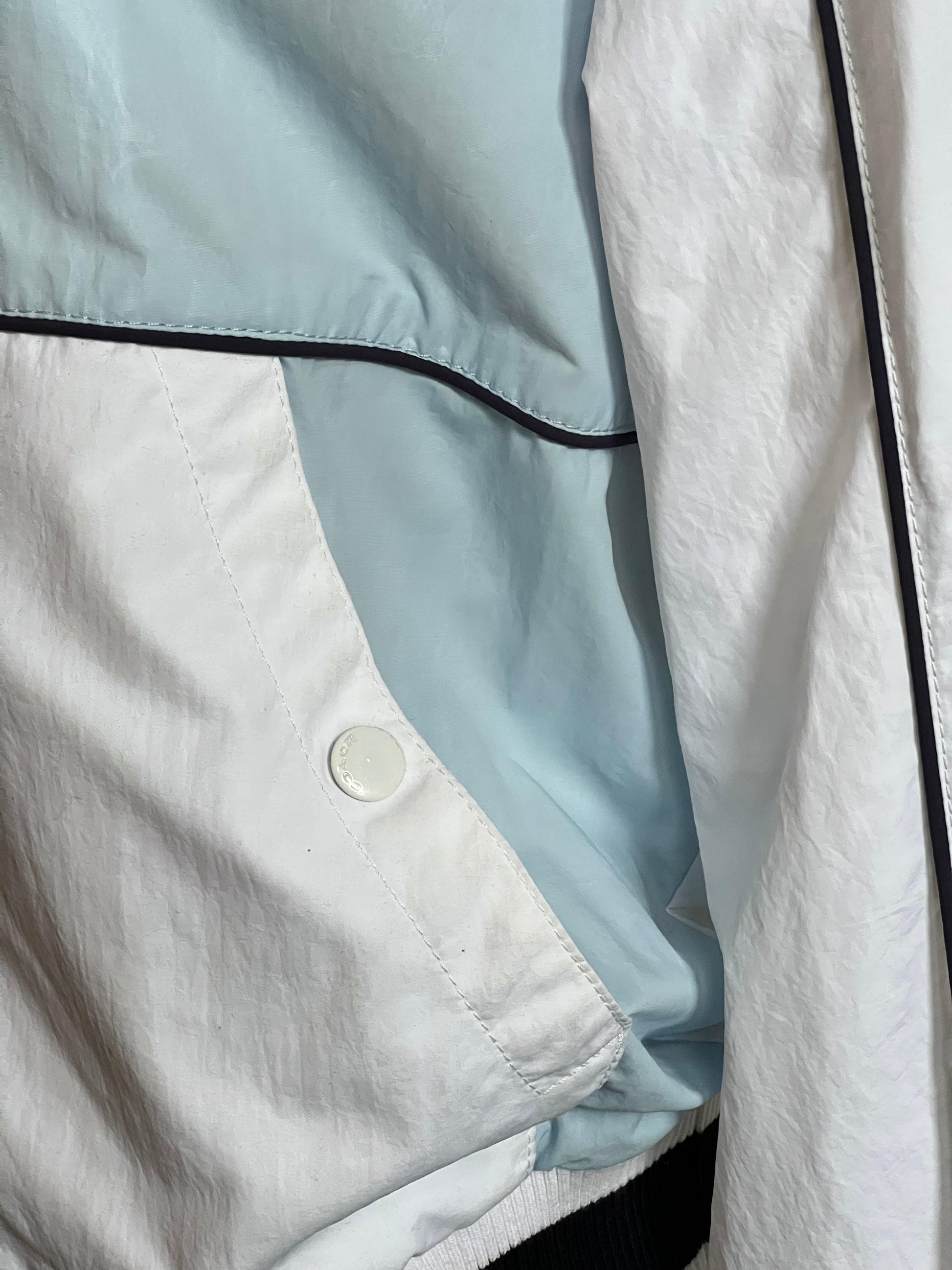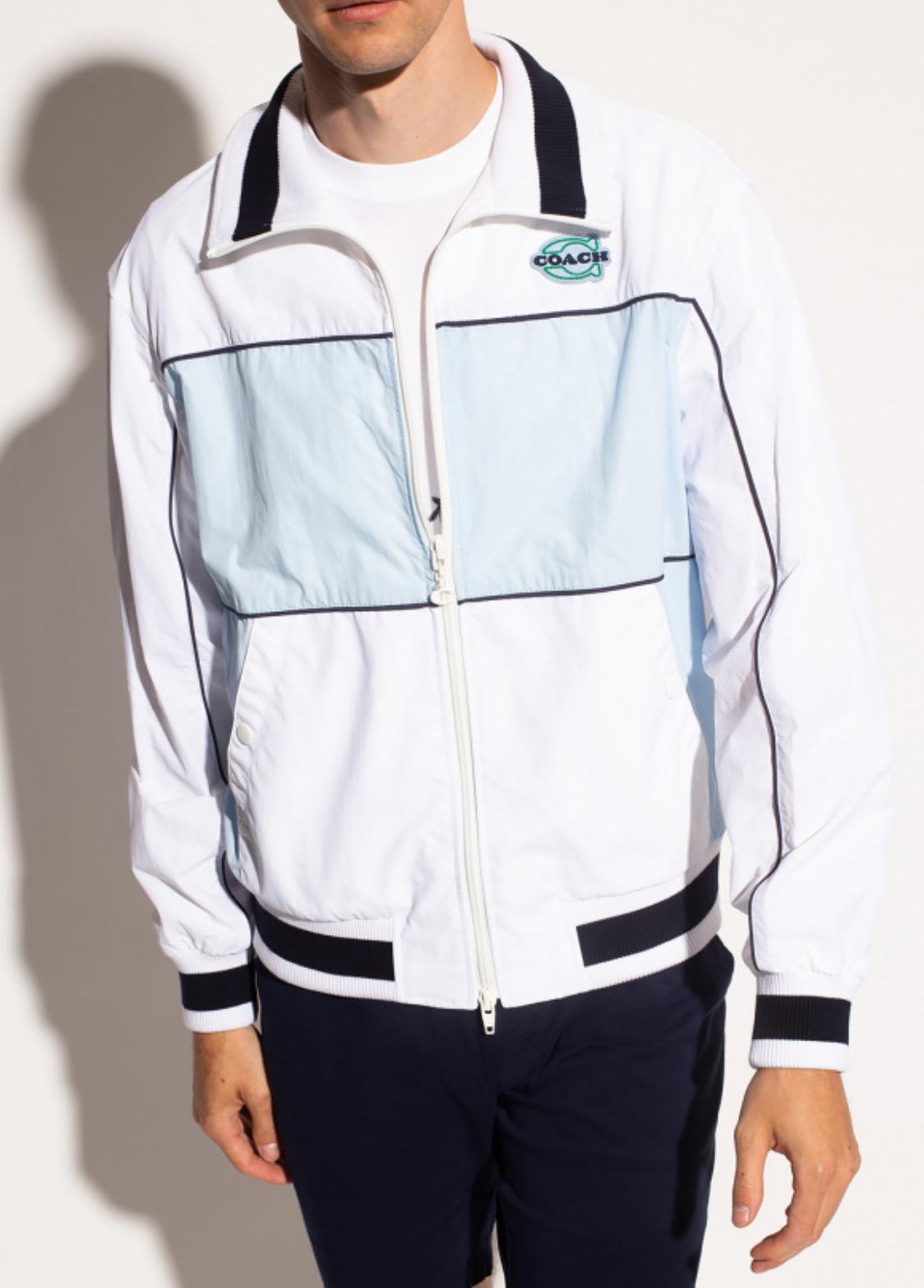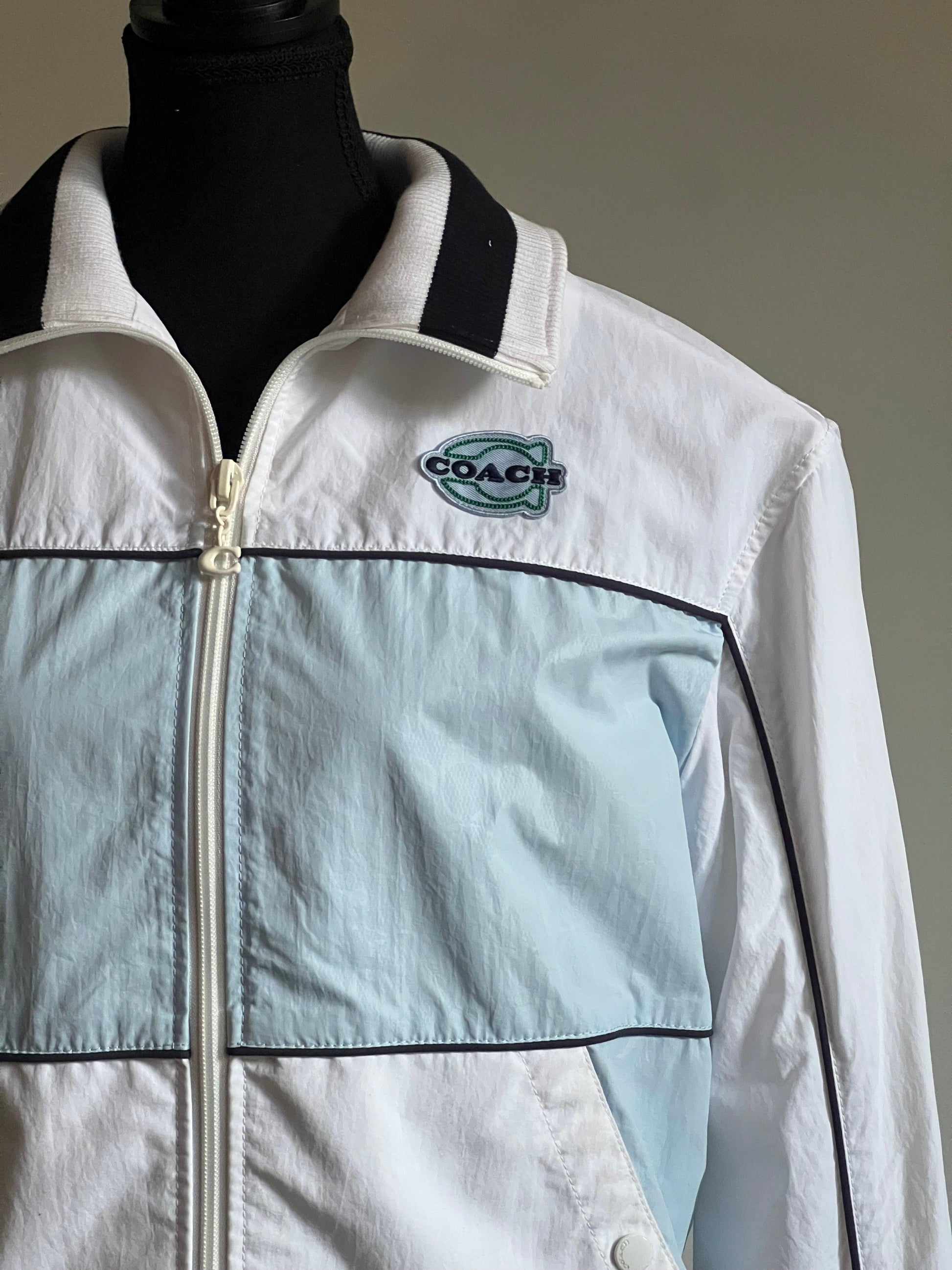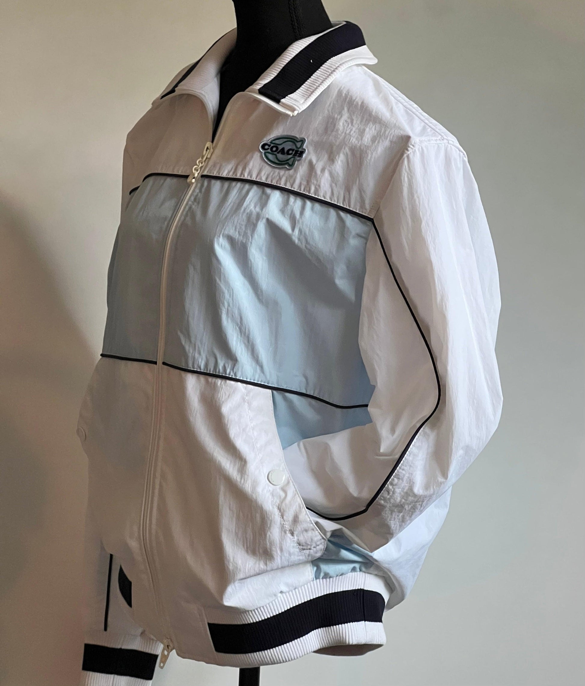 Introducing the Coach Colorblock Mashup Windbreaker, made with sustainable and lightweight recycled nylon. Stay stylish and eco-friendly with this windbreaker that features a unique colorblock design. Designed by industry experts, this windbreaker provides both style and functionality for any outdoor adventure.