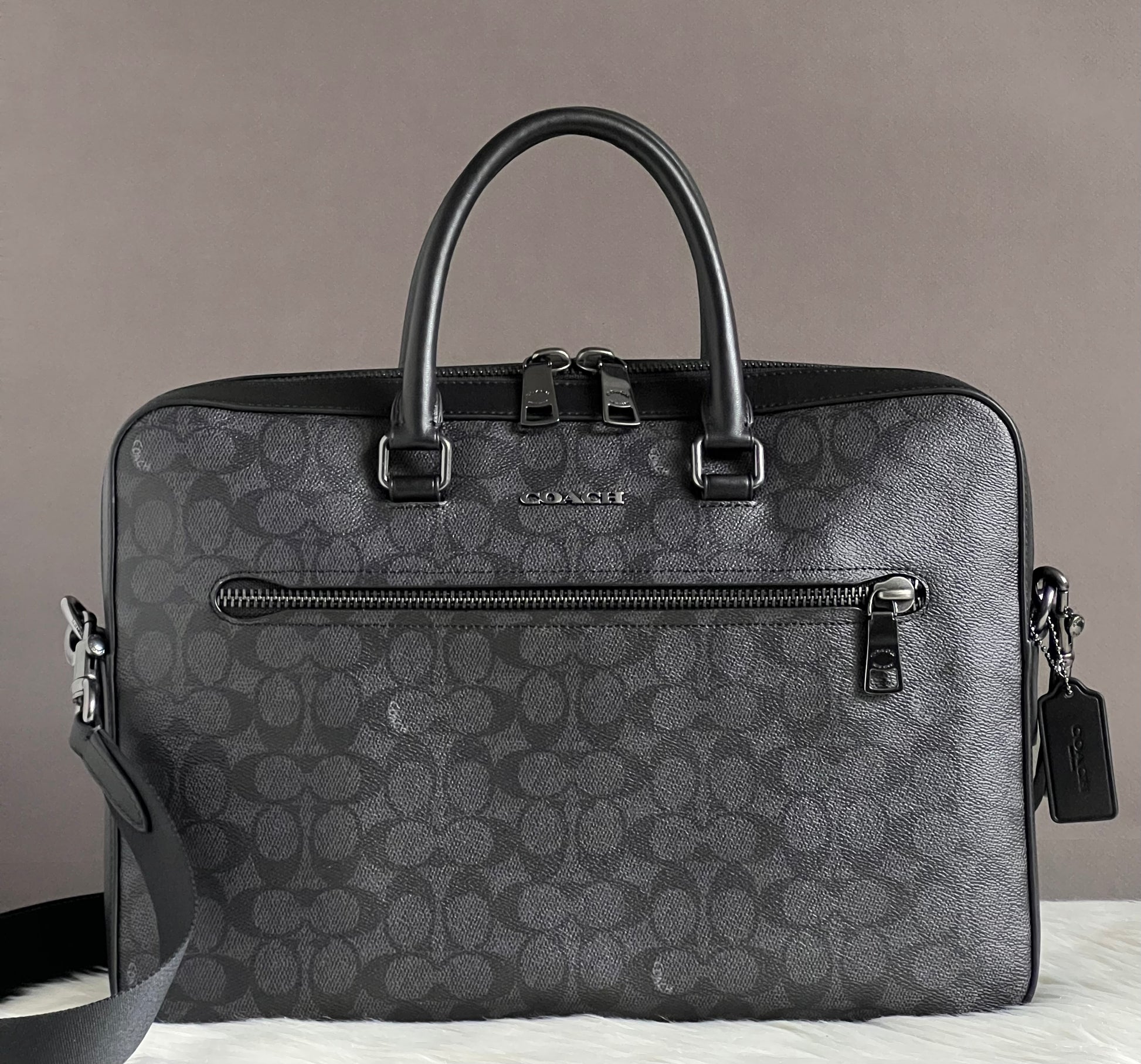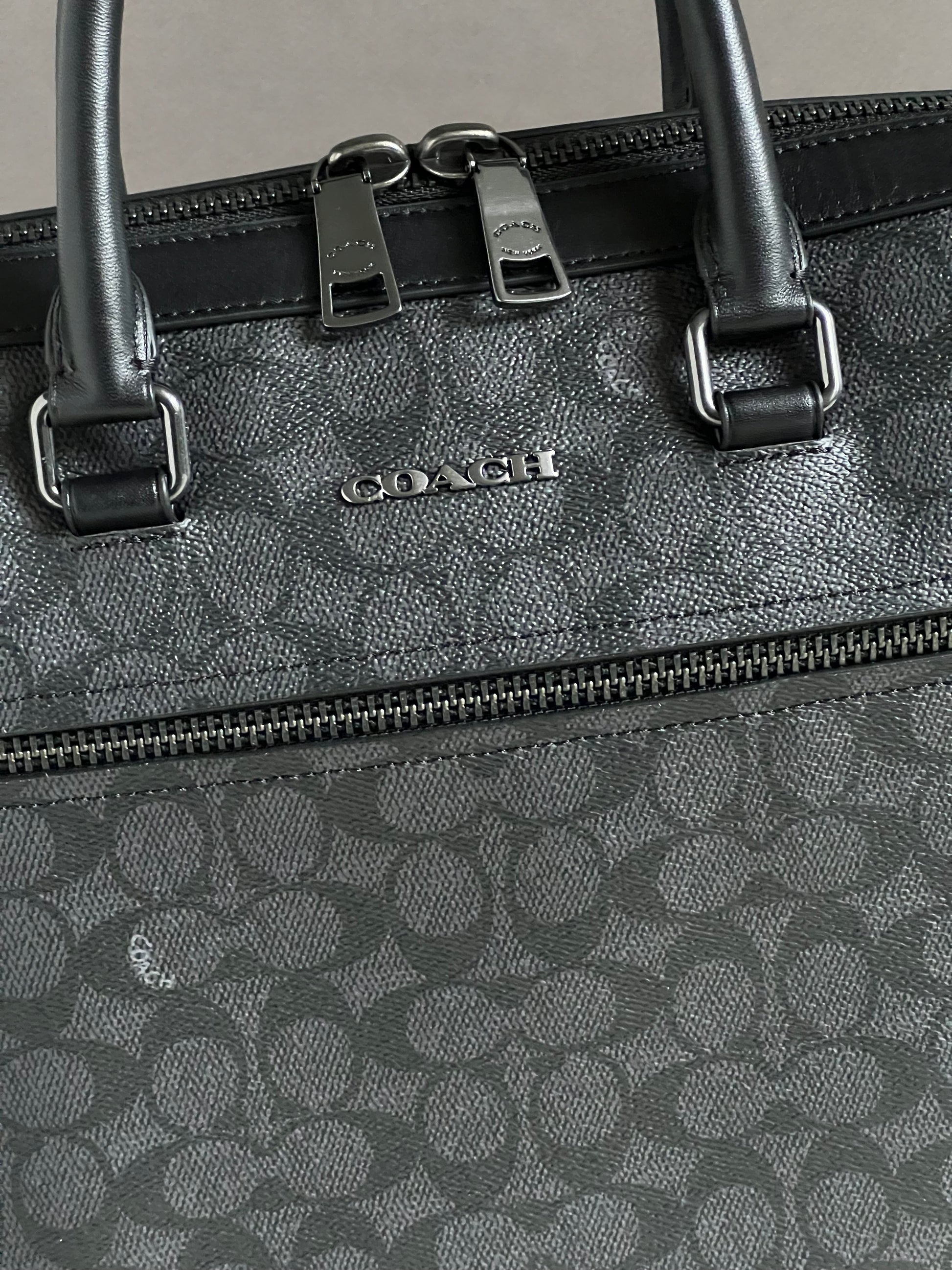 Introducing the Coach Ethan Slim Brief in Signature Canvas. With its sleek and sophisticated design, this brief is perfect for the modern professional. Crafted from high-quality signature canvas, it boasts durability and style. Keep your essentials organized and look professional on the go with this essential accessory.