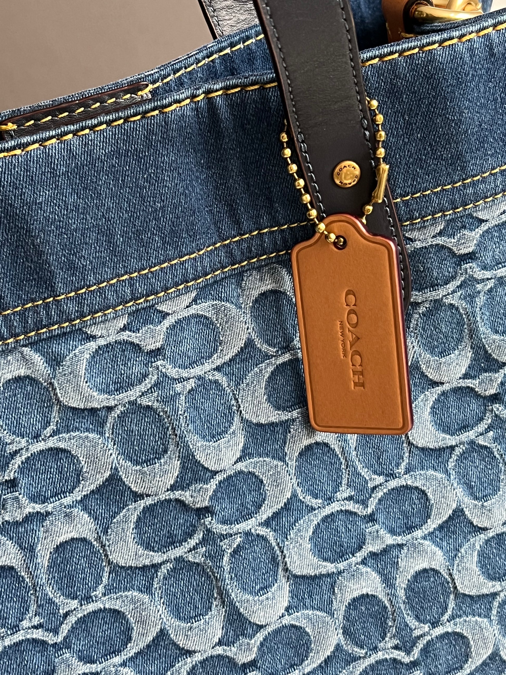 Experience luxury and style with the Coach Field Tote 40 in Signature Denim. Made with high-quality denim, this tote provides durability and a sophisticated look. With a spacious interior and multiple pockets, it is perfect for carrying all your essentials while keeping them organized. Elevate your everyday wardrobe with this chic and functional tote.