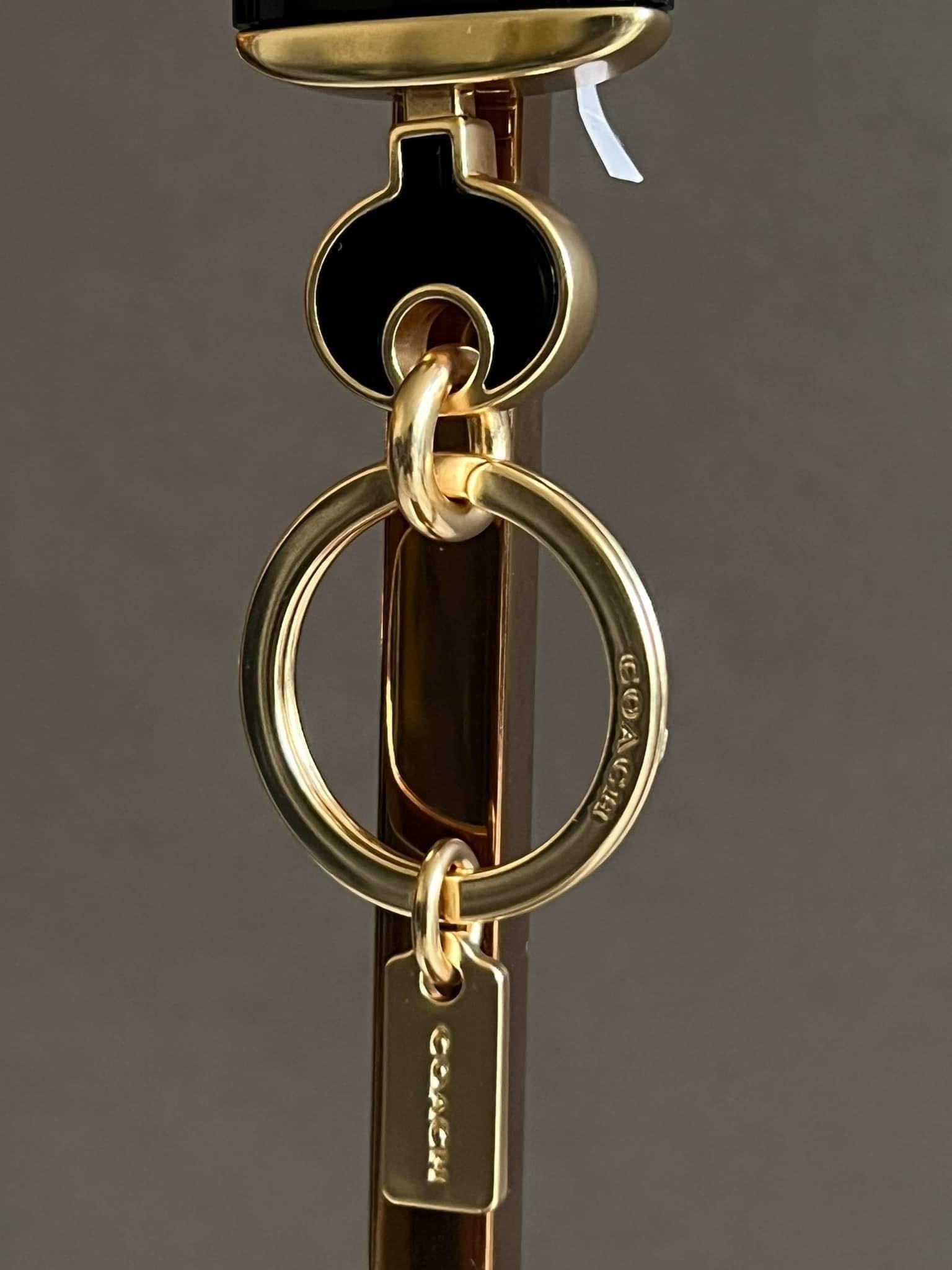 Elevate your style with the Coach Lock And Key Bag Charm Key Ring. This sophisticated accessory not only adds a touch of luxury to your look, but also serves as a functional key ring. Crafted with Coach's signature quality and design, it's the perfect addition to any fashion lover's collection.
