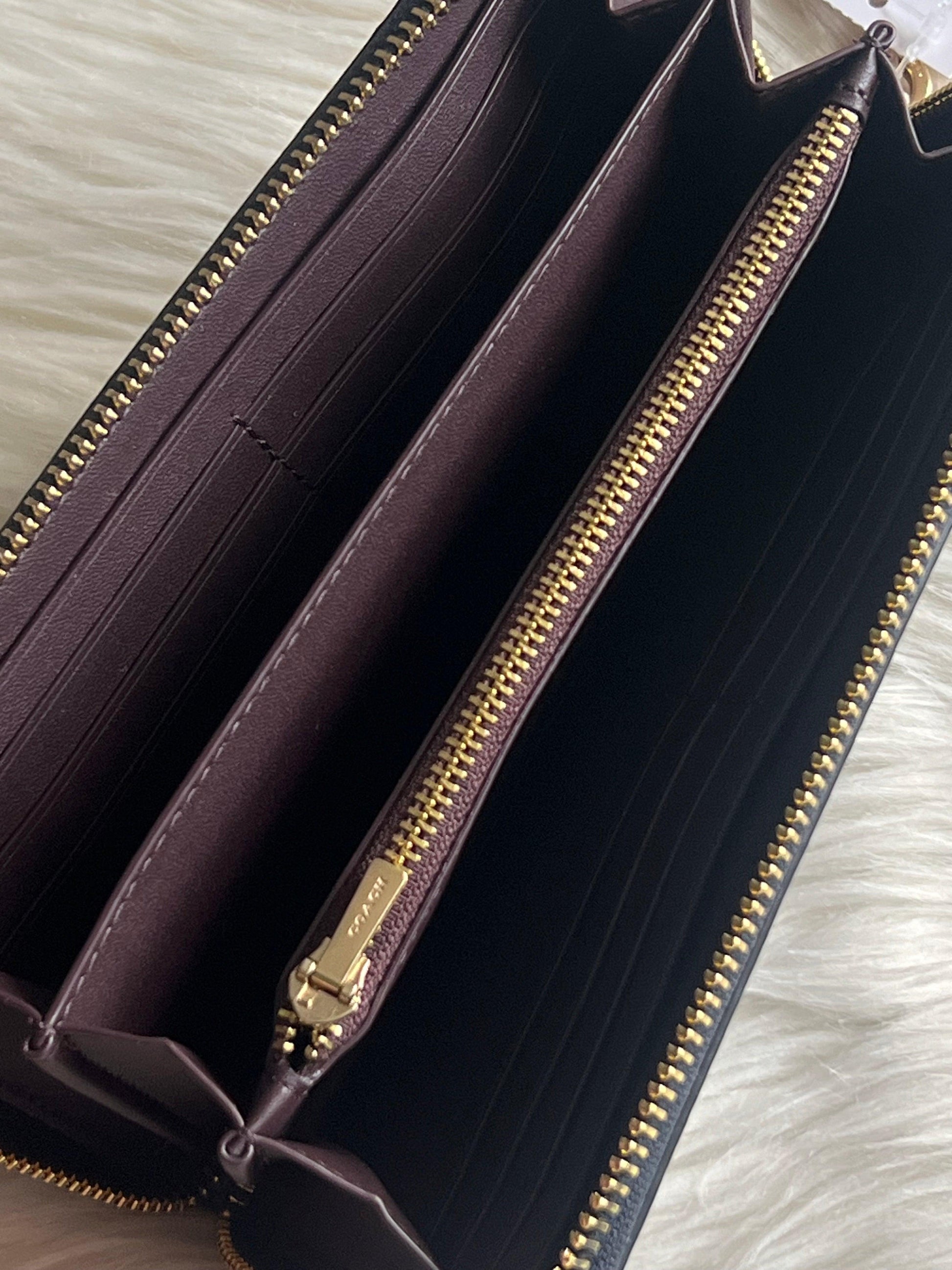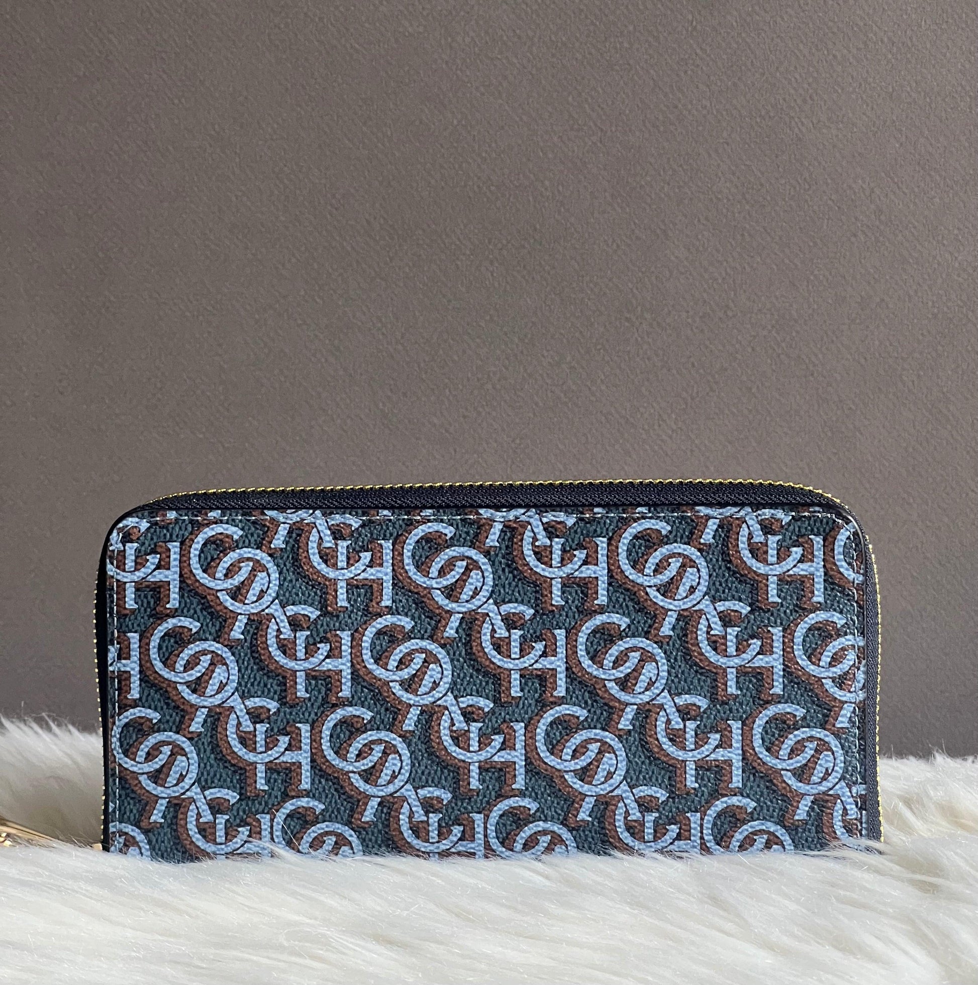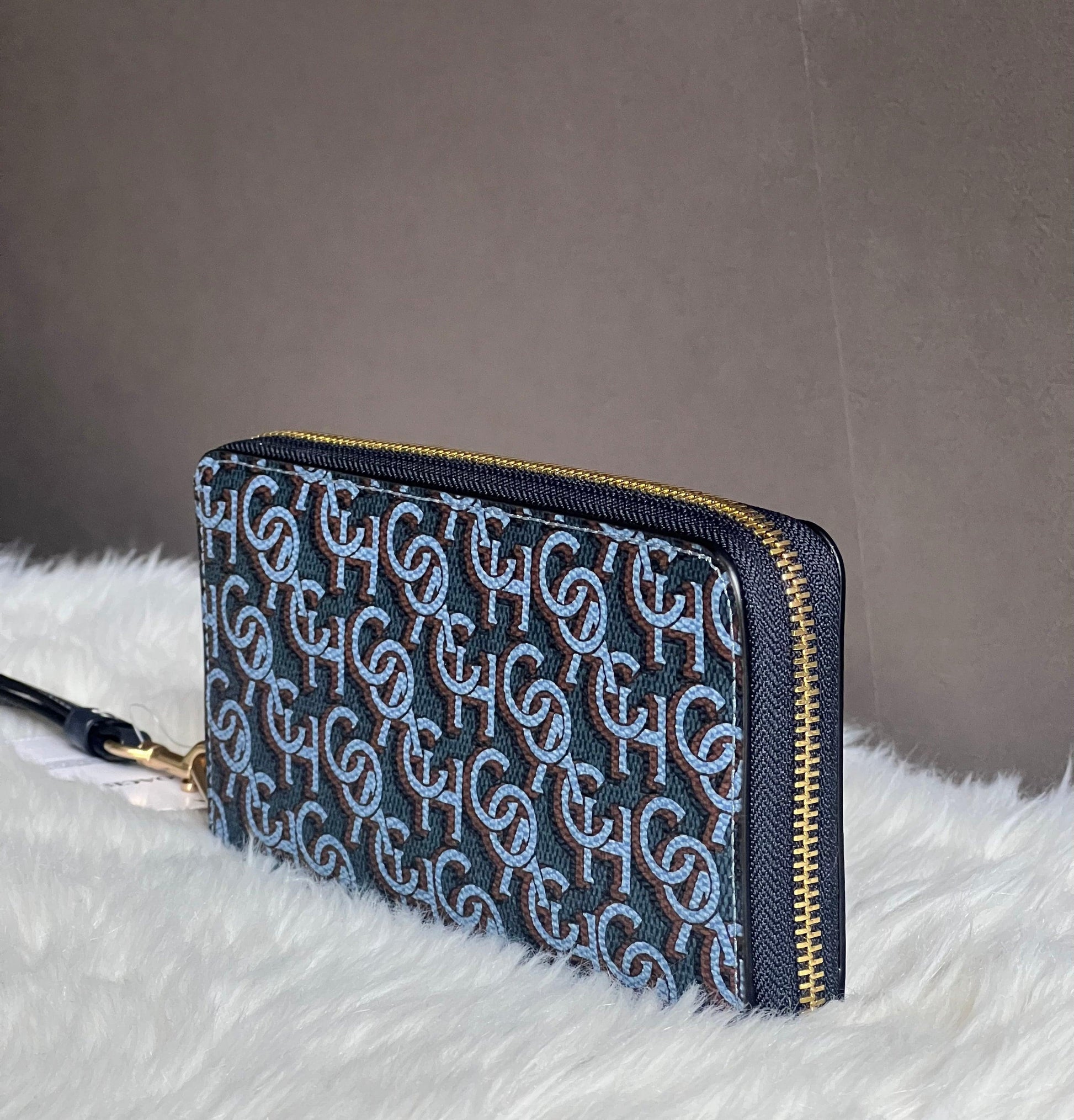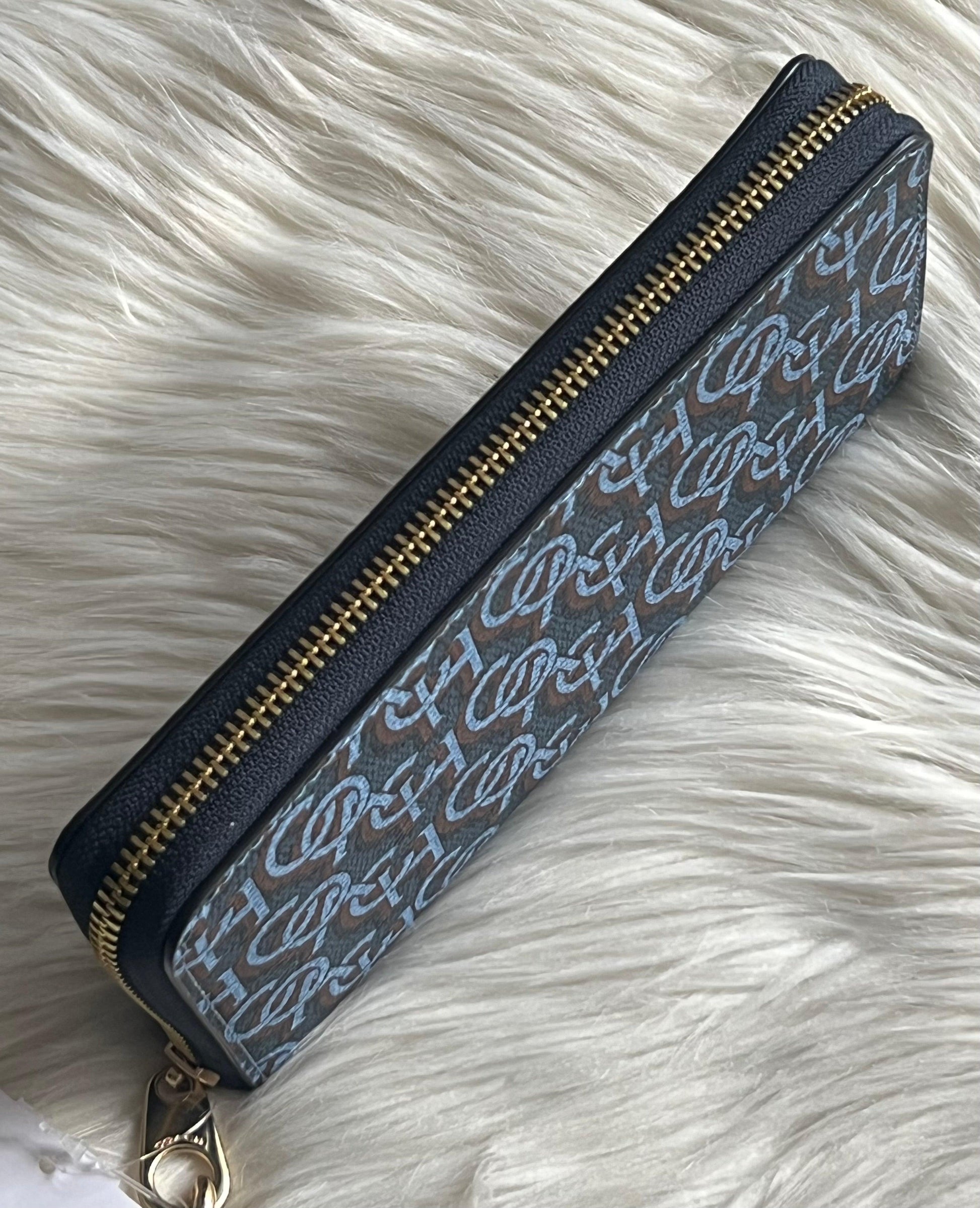 Expertly crafted with the finest materials, this Coach wallet features a sleek monogram print. With a spacious zip around design, it effortlessly holds your cash, cards, and IDs. Available in navy or black, this wallet is both stylish and functional, measuring 7.25”L x 4”H x .75”W.