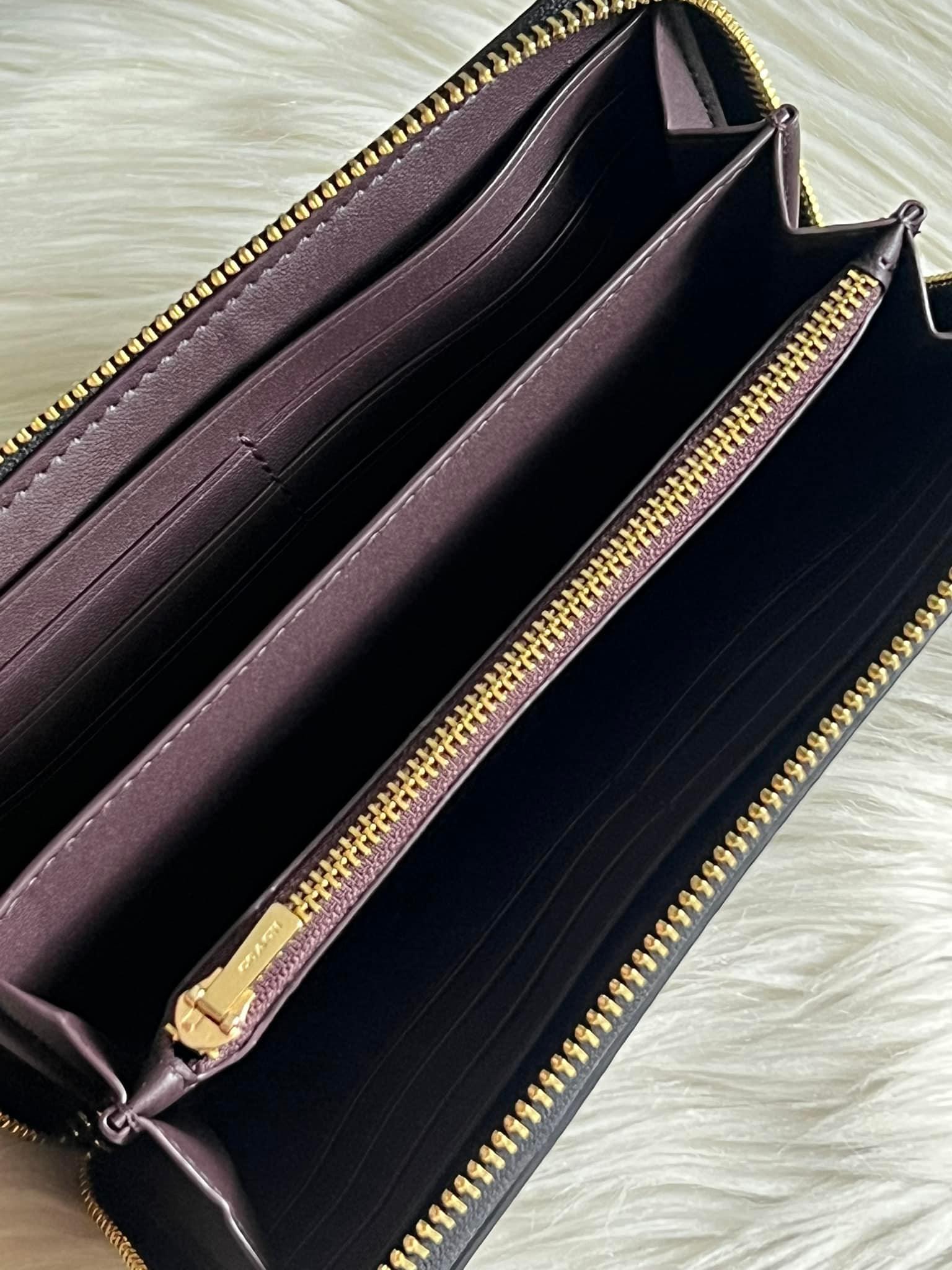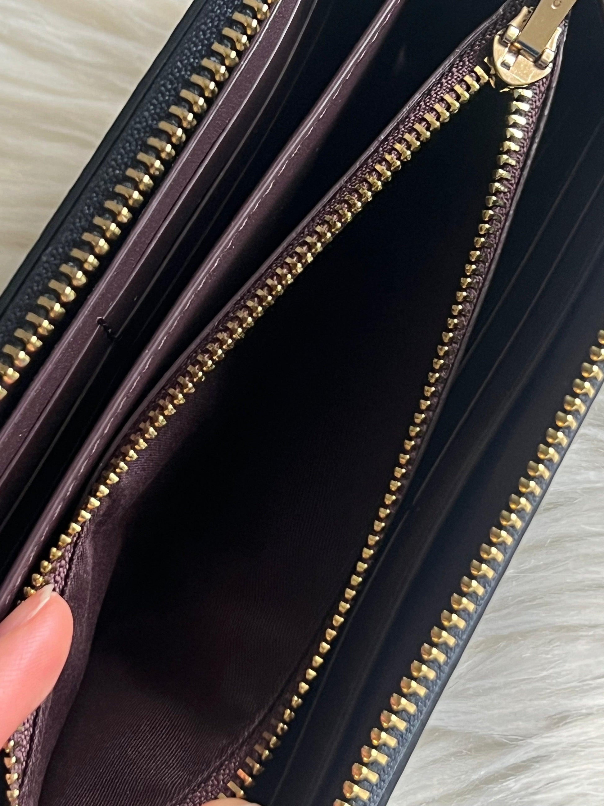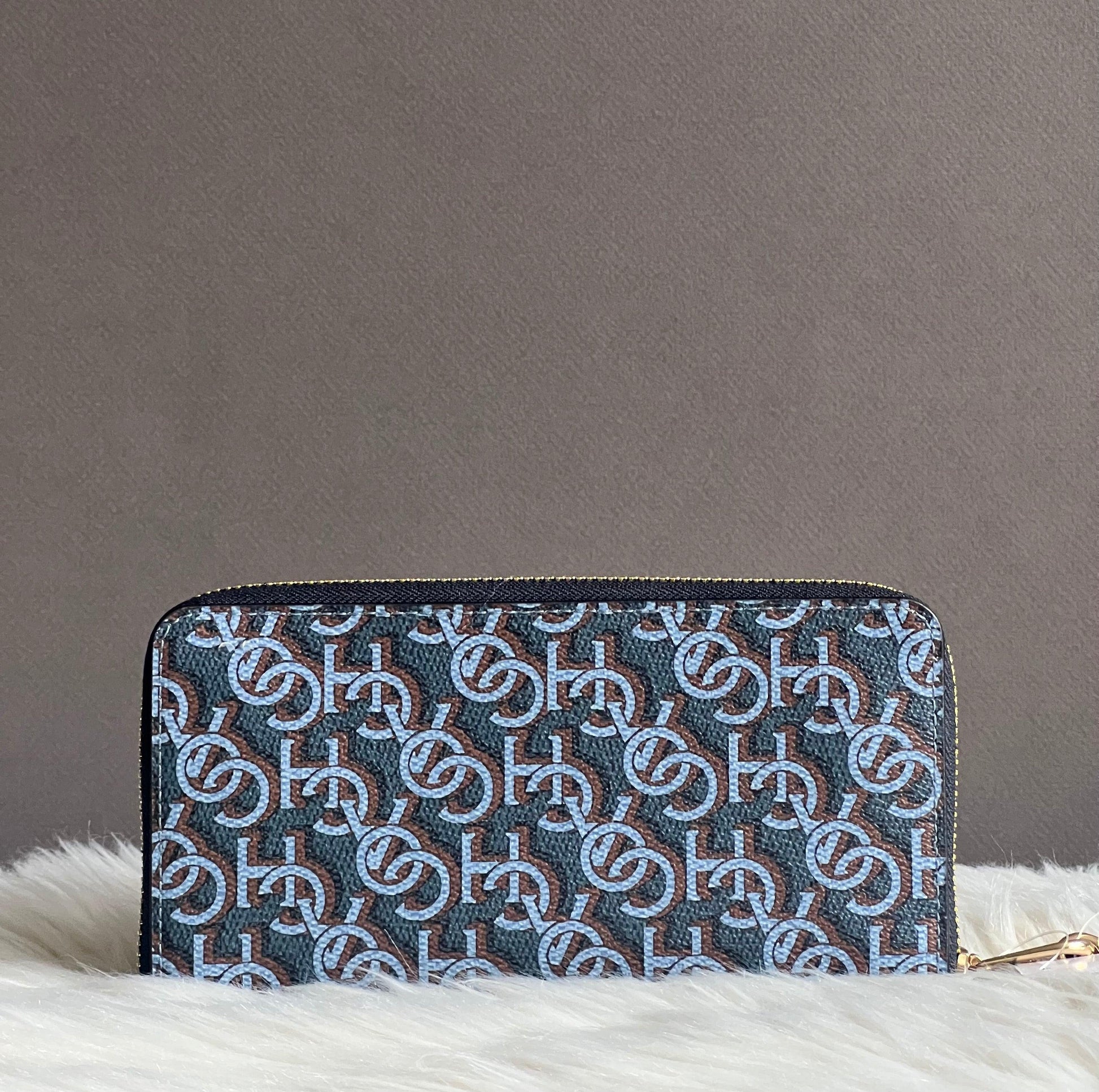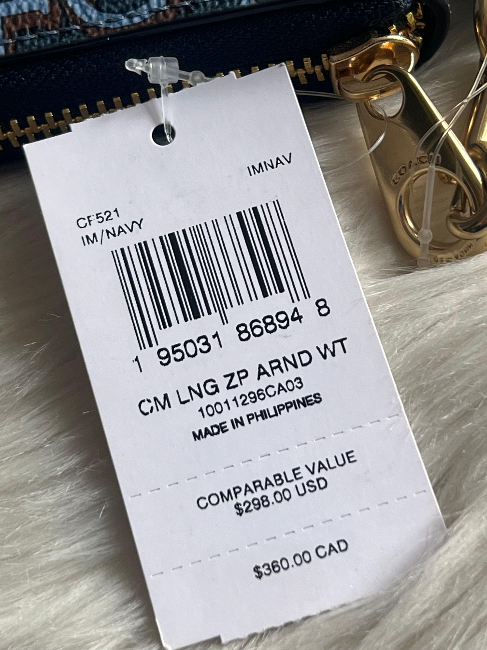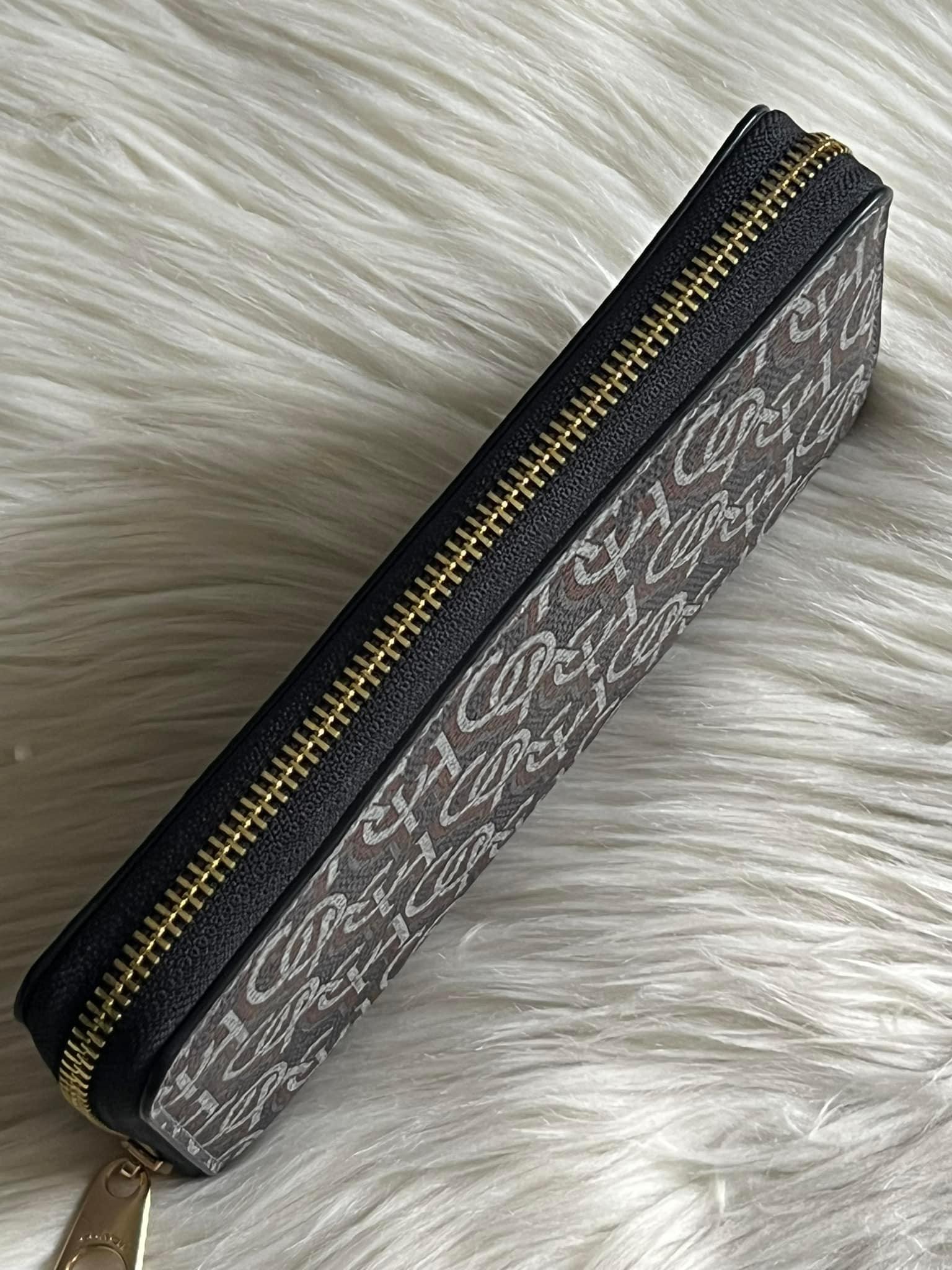 Expertly crafted with the finest materials, this Coach wallet features a sleek monogram print. With a spacious zip around design, it effortlessly holds your cash, cards, and IDs. Available in navy or black, this wallet is both stylish and functional, measuring 7.25”L x 4”H x .75”W.