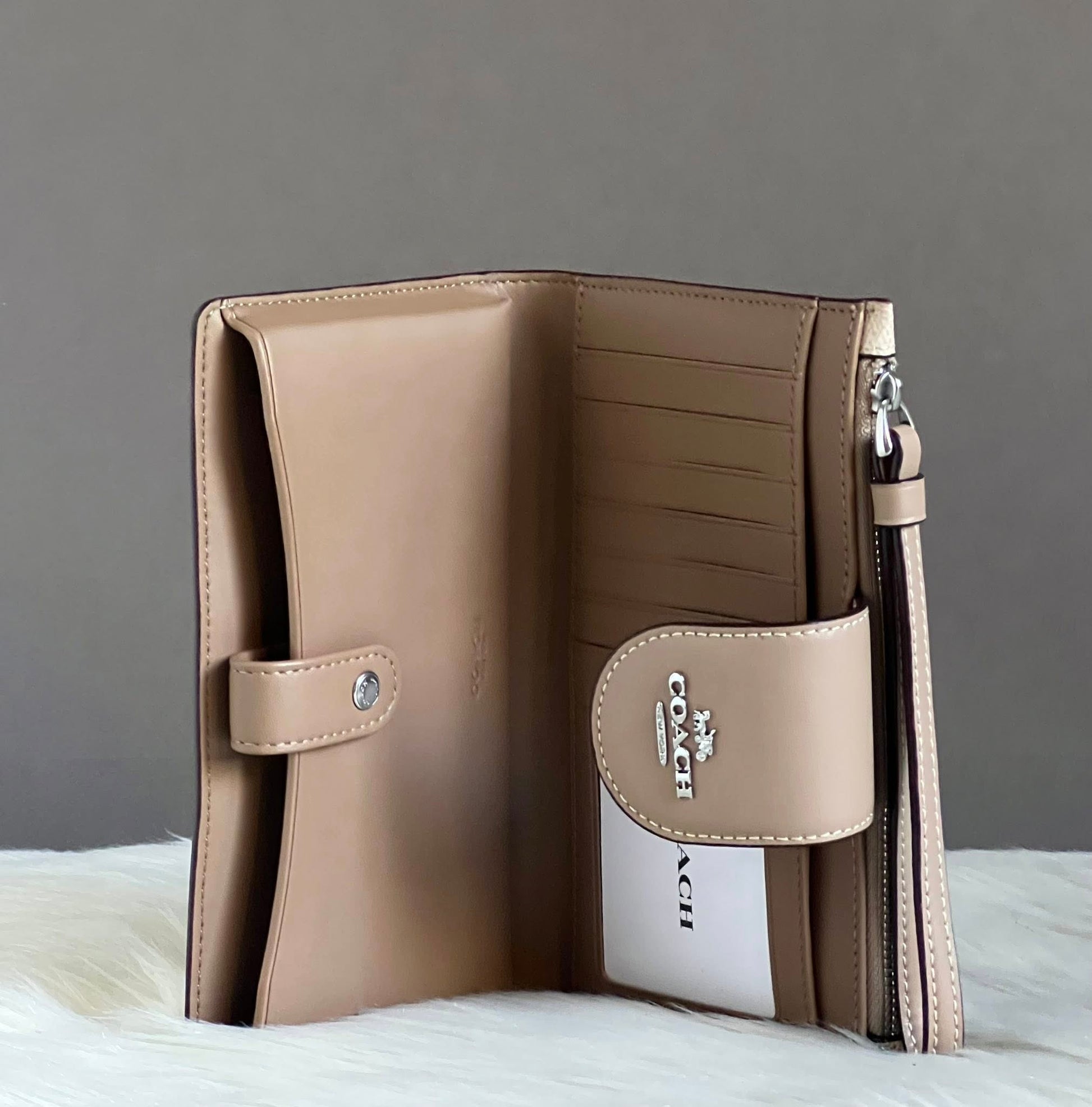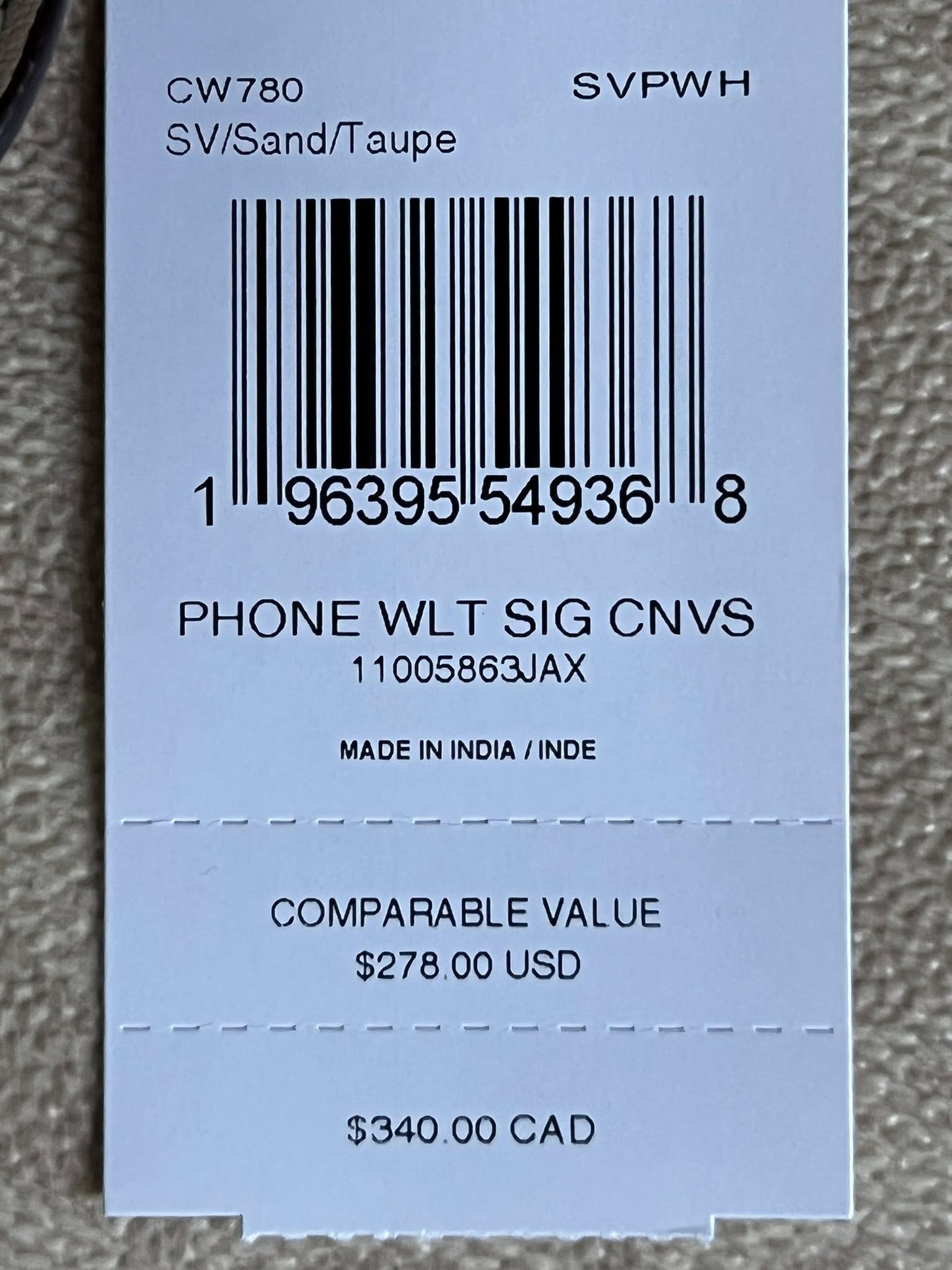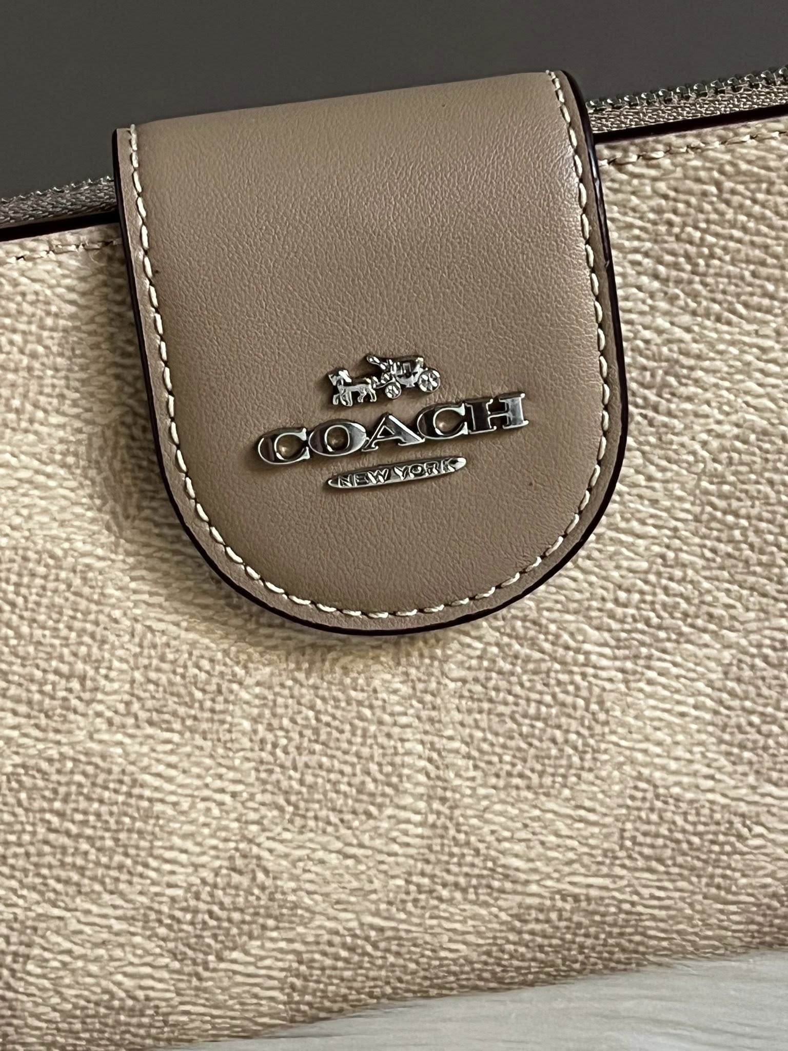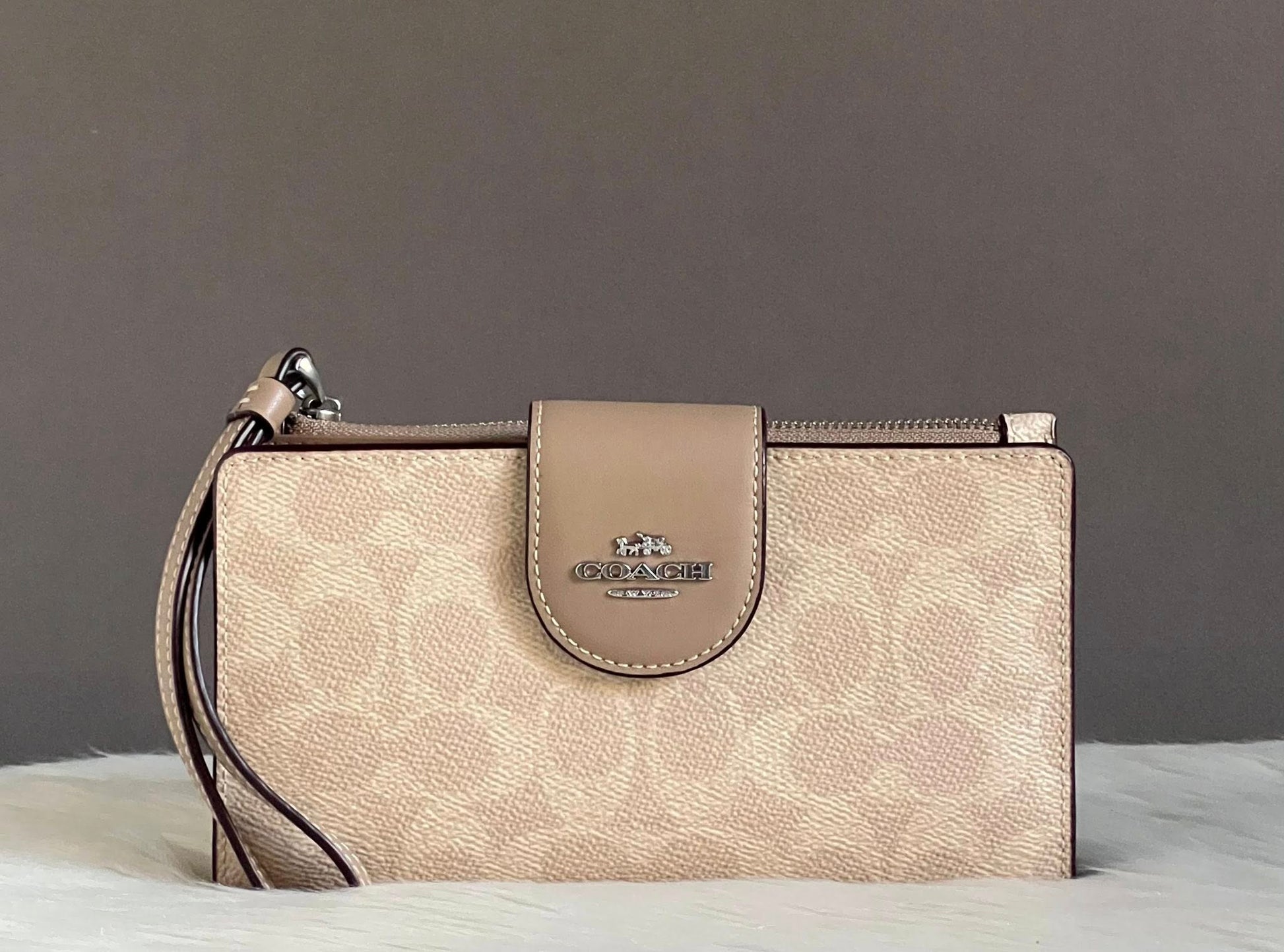 Designed for seamless functionality, the Coach Phone Wallet in Signature Canvas combines style and convenience. Crafted from durable sand and taupe signature canvas, it measures 7.25”L x 4.5”H, perfectly sized to hold your phone alongside essential cards and cash. This wallet delivers refined organization in a compact form, ensuring quick access while maintaining Coach’s hallmark quality and timeless aesthetic. Ideal for those seeking an elegant yet practical everyday accessory.