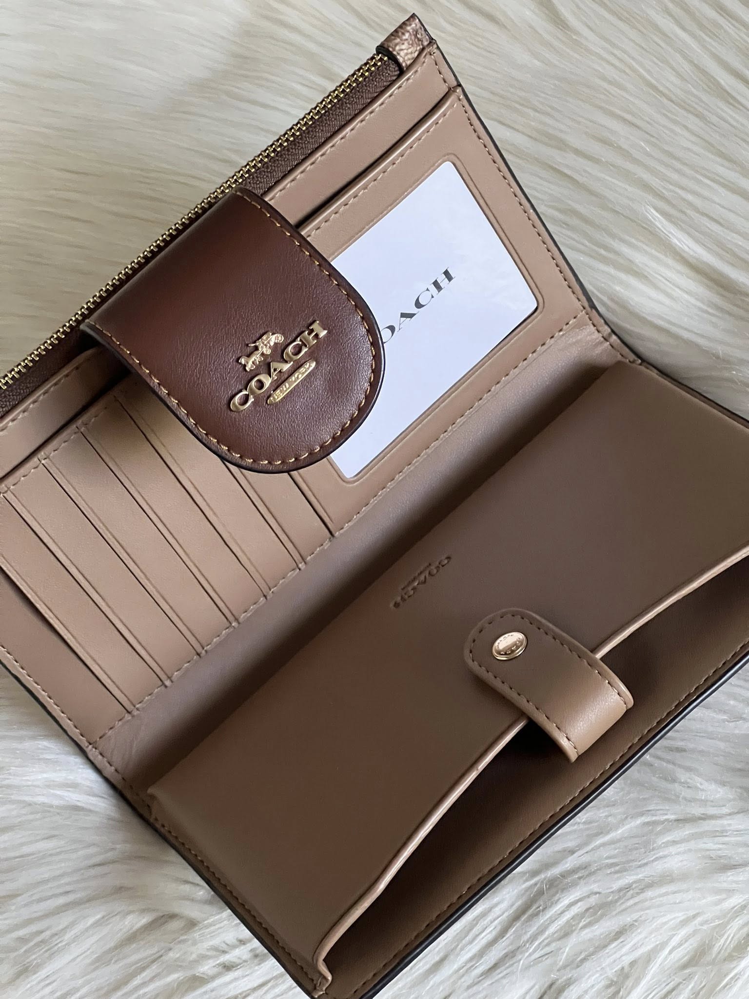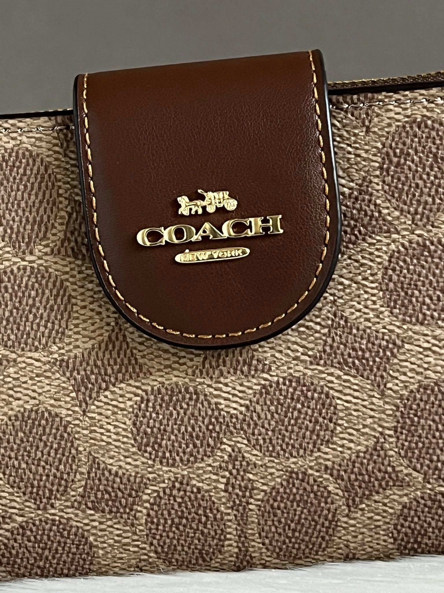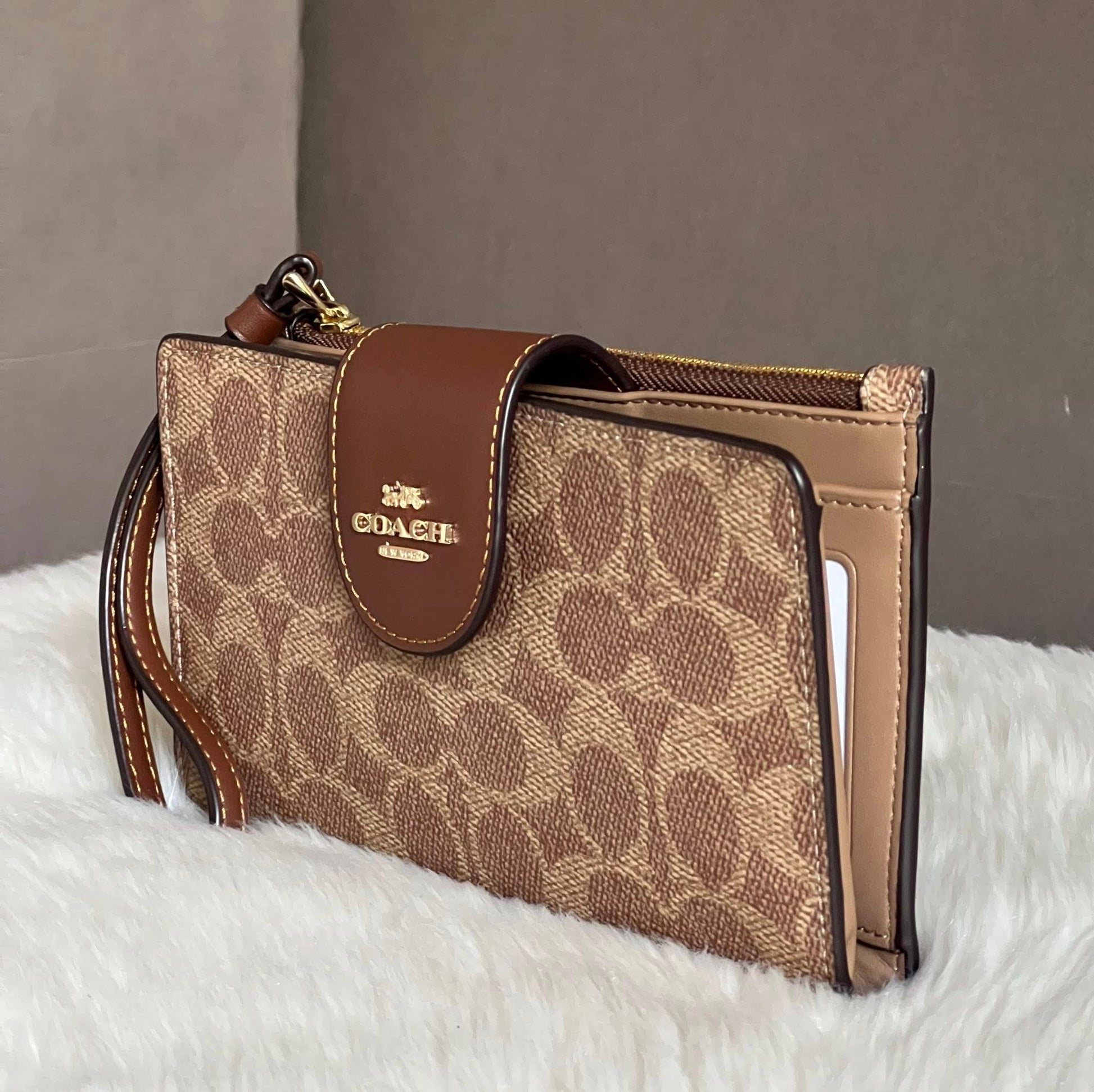 This Coach Phone Wallet in Signature Canvas combines classic style with practical functionality. Crafted in the iconic tan and brown signature pattern, it measures a convenient 7.25”L x 4.5”H—ideal for securely carrying your phone alongside essential cards and cash. Its refined design and durable canvas make it a versatile accessory for everyday use, offering effortless organization without compromising elegance. Priced at $340, it exemplifies quality craftsmanship tailored for those who appreciate both fashion and utility.