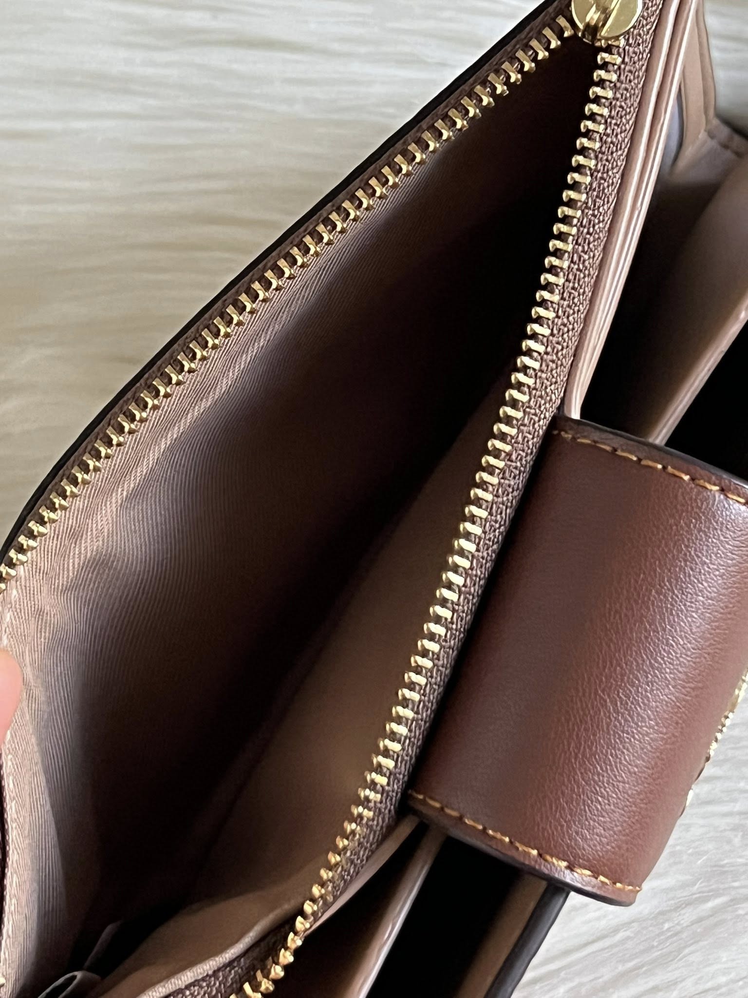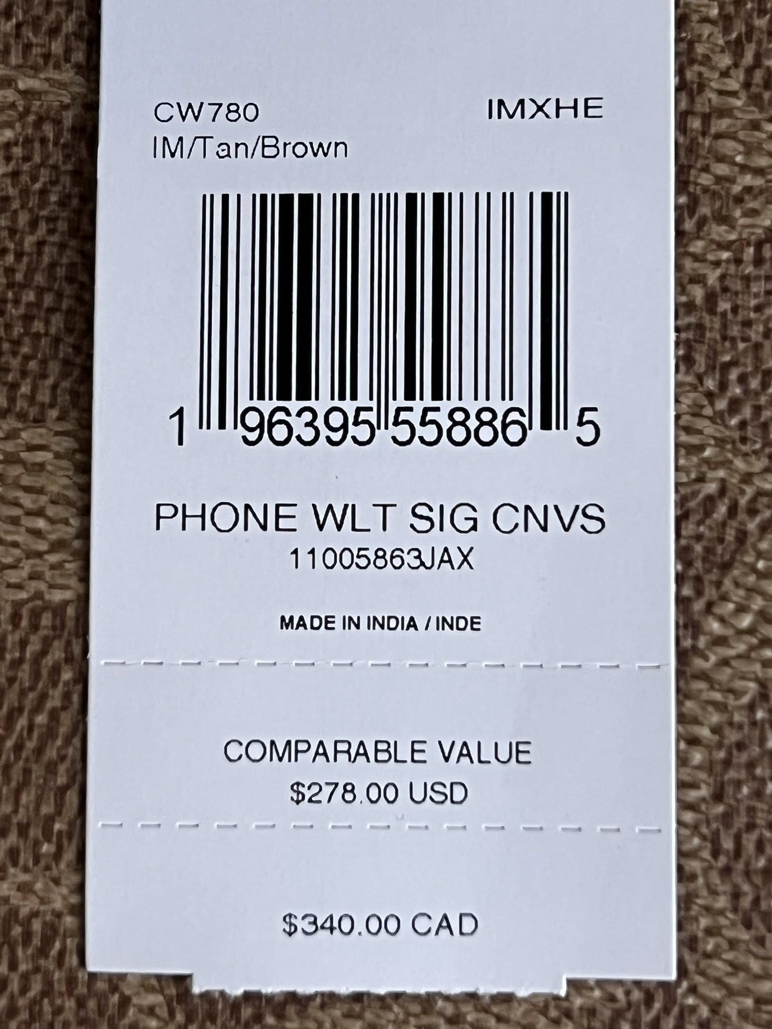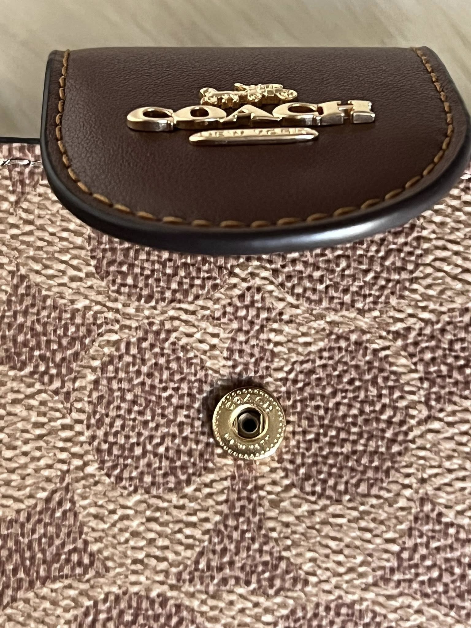 This Coach Phone Wallet in Signature Canvas combines classic style with practical functionality. Crafted in the iconic tan and brown signature pattern, it measures a convenient 7.25”L x 4.5”H—ideal for securely carrying your phone alongside essential cards and cash. Its refined design and durable canvas make it a versatile accessory for everyday use, offering effortless organization without compromising elegance. Priced at $340, it exemplifies quality craftsmanship tailored for those who appreciate both fashion and utility.