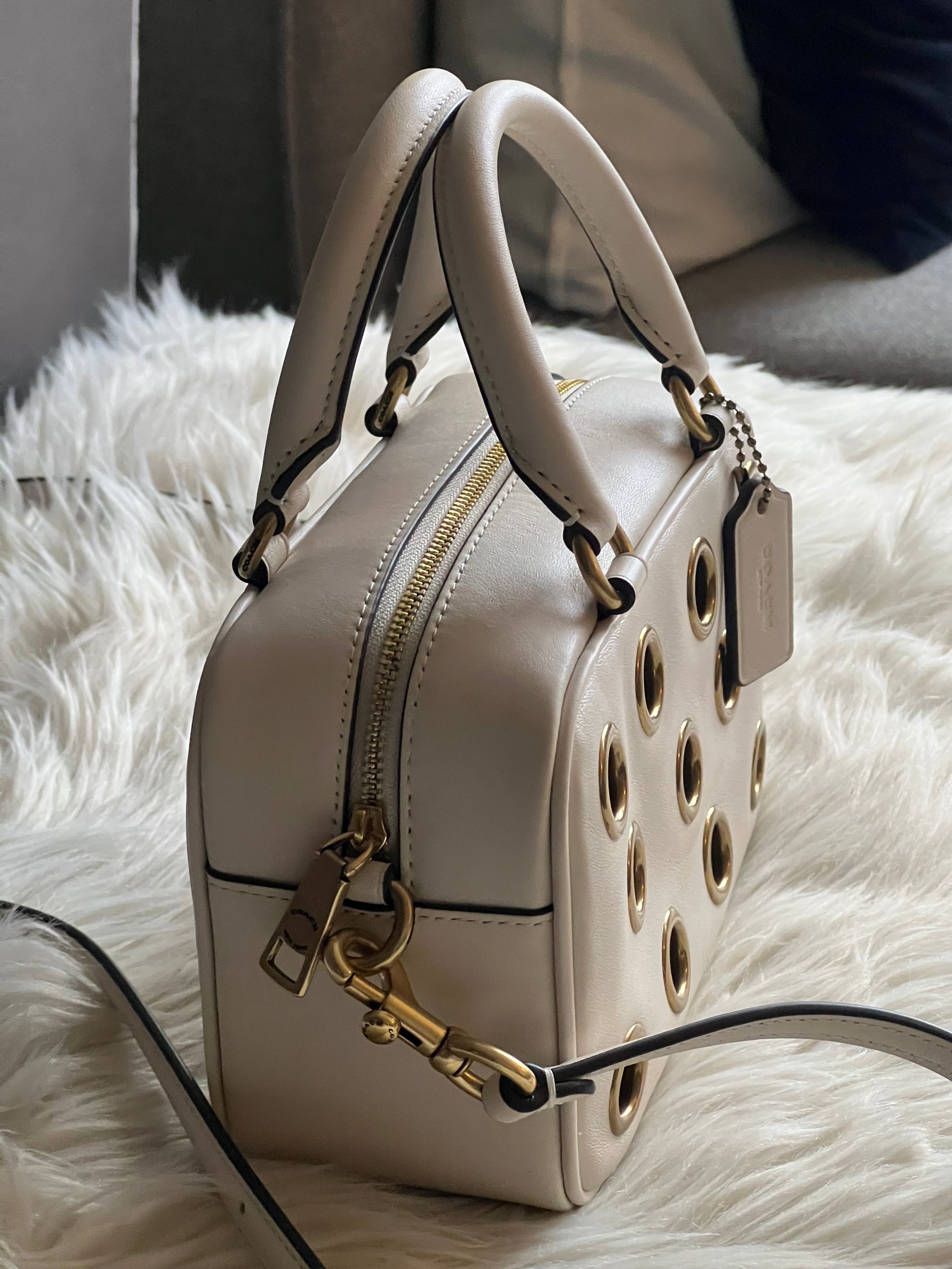 This Coach Satchel Crossbody Bag is a versatile and trendy choice for any fashion-forward individual. With its unique grommet detailing, this bag adds an edgy touch to any outfit. The adjustable strap allows for comfortable wear as a crossbody or on the shoulder. Stay effortlessly stylish with this must-have accessory!