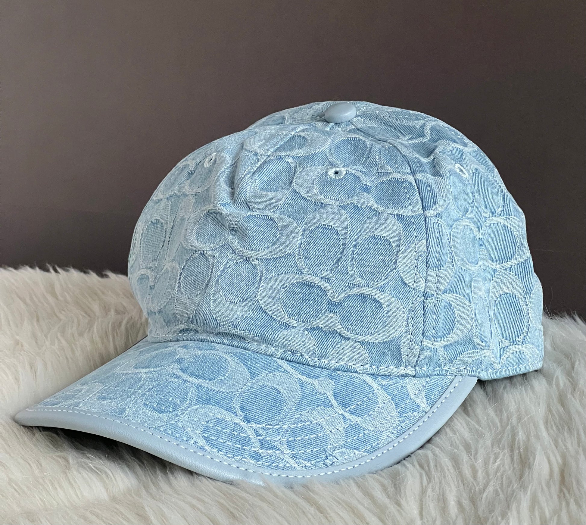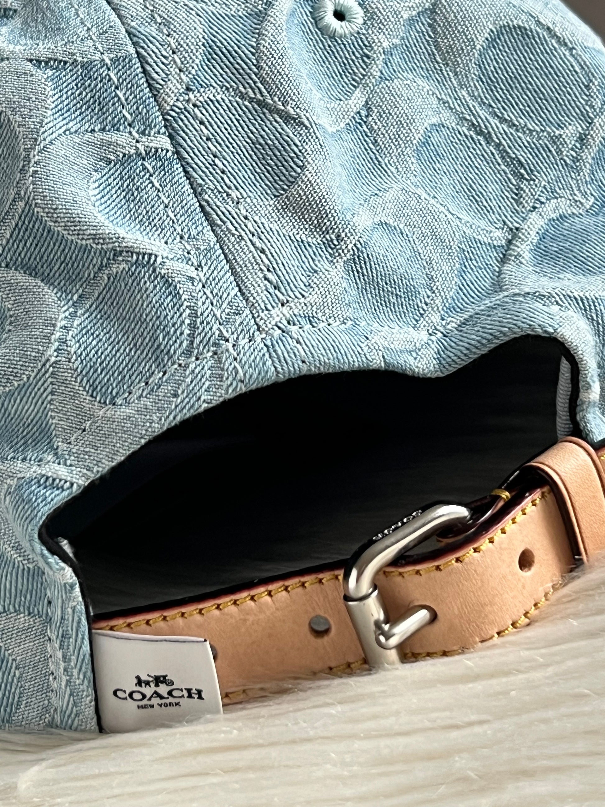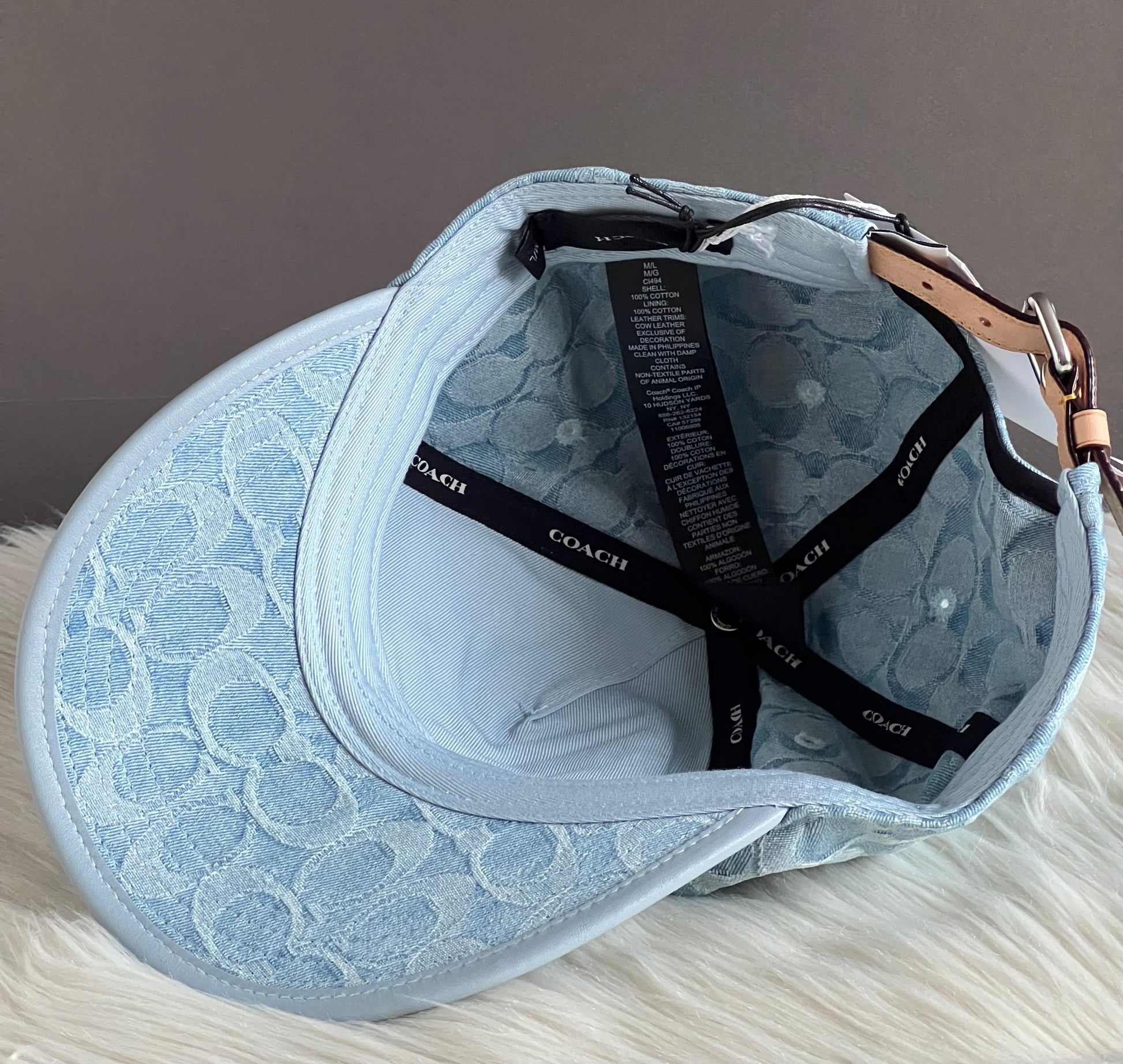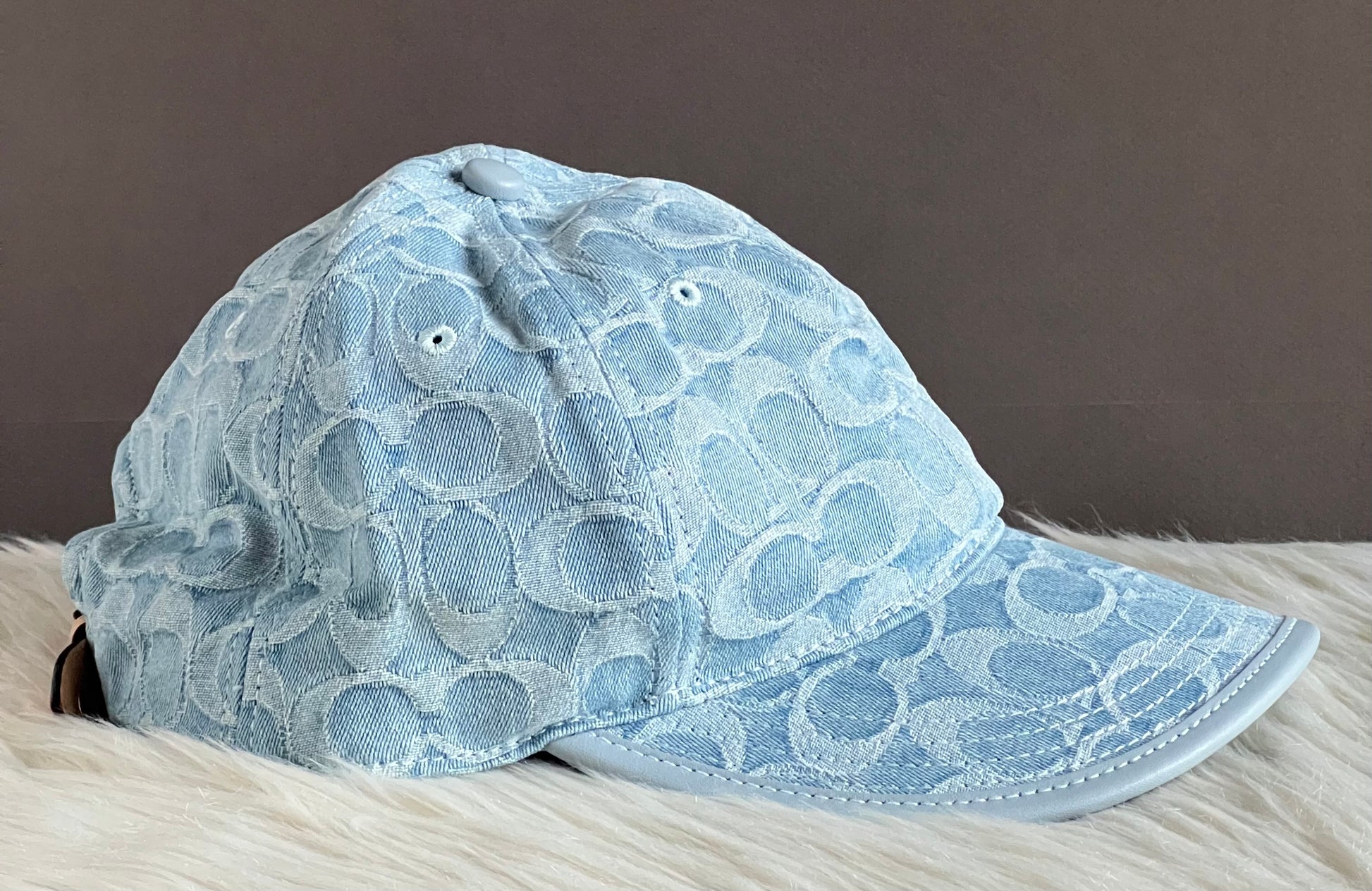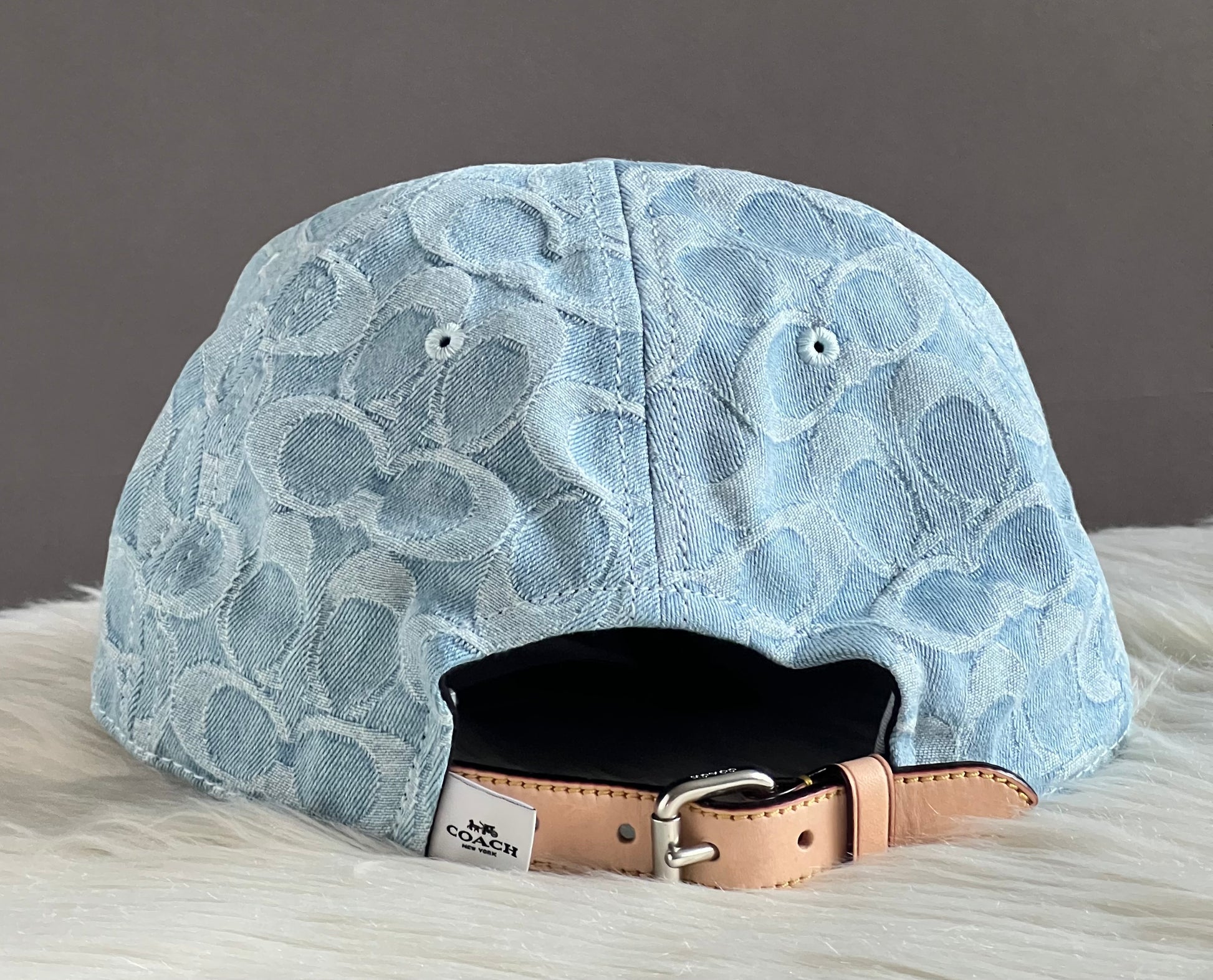 Stay stylish and protected in the Coach Signature Denim Baseball Hat. Made with high-quality denim material, this hat offers both durability and comfort. Its timeless design features the iconic Coach signature logo, making it a statement piece for any outfit. Perfect for any outdoor activity, this hat is a must-have for any fashion-forward individual.