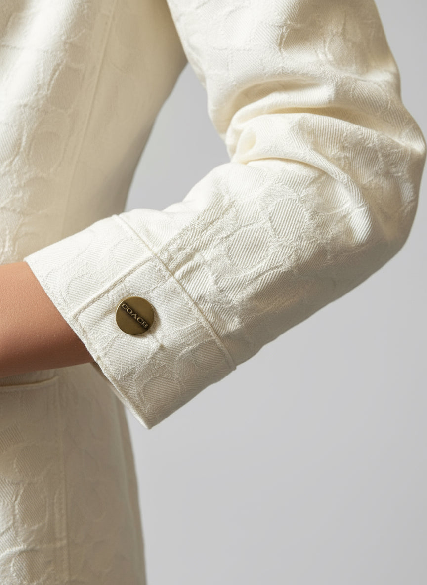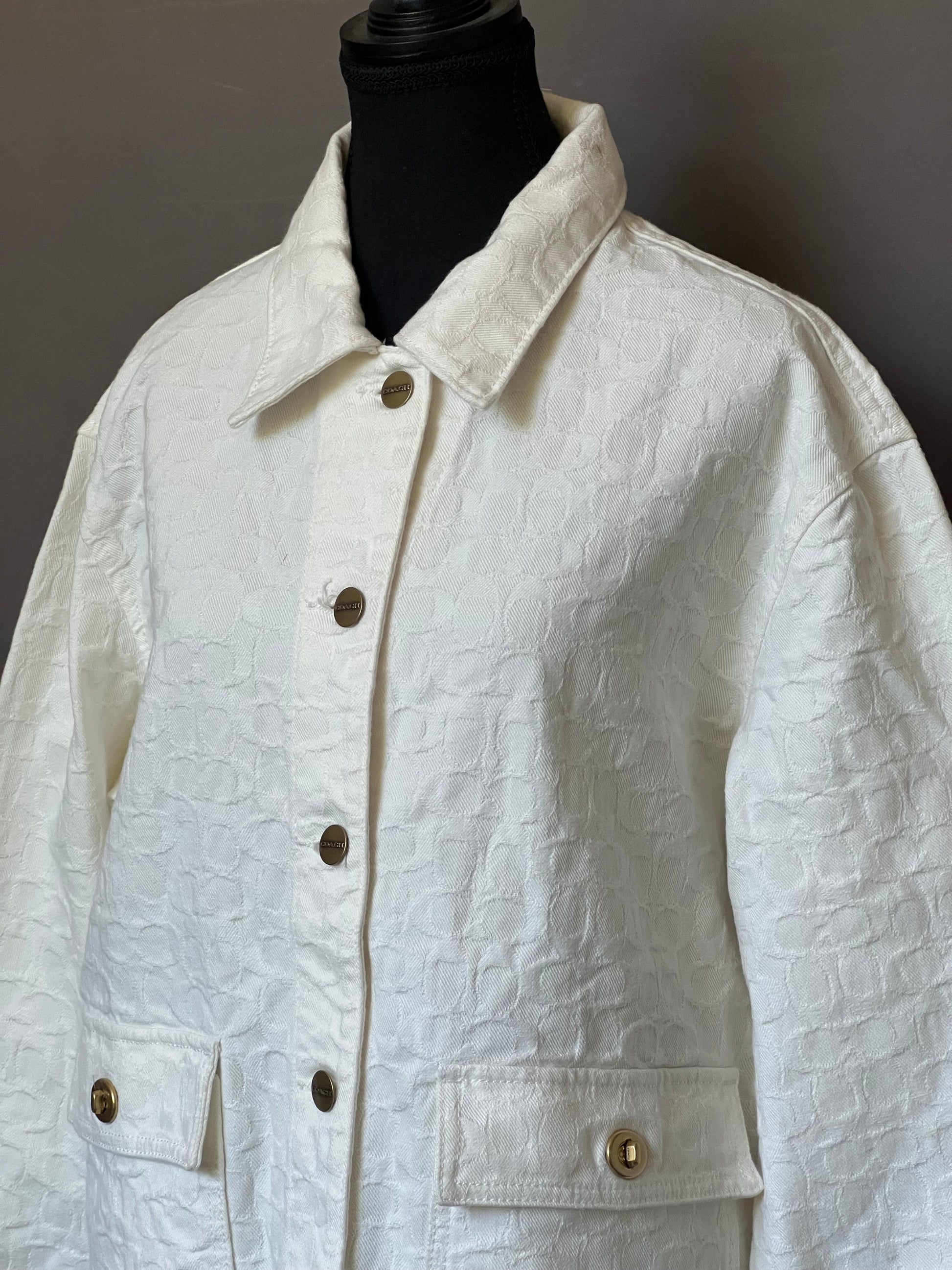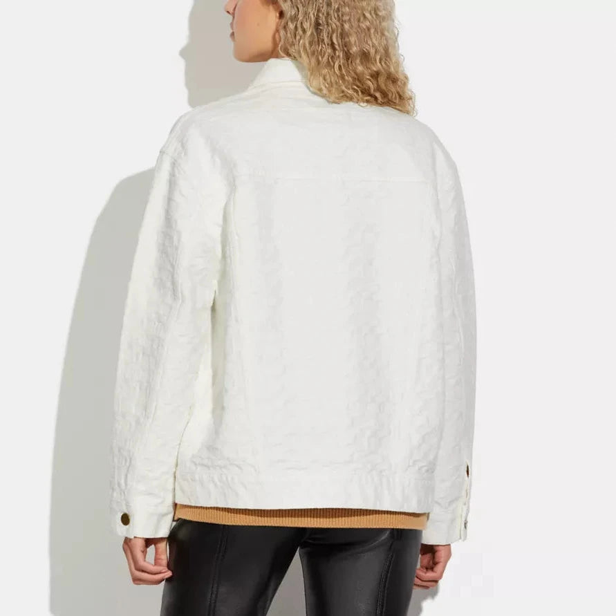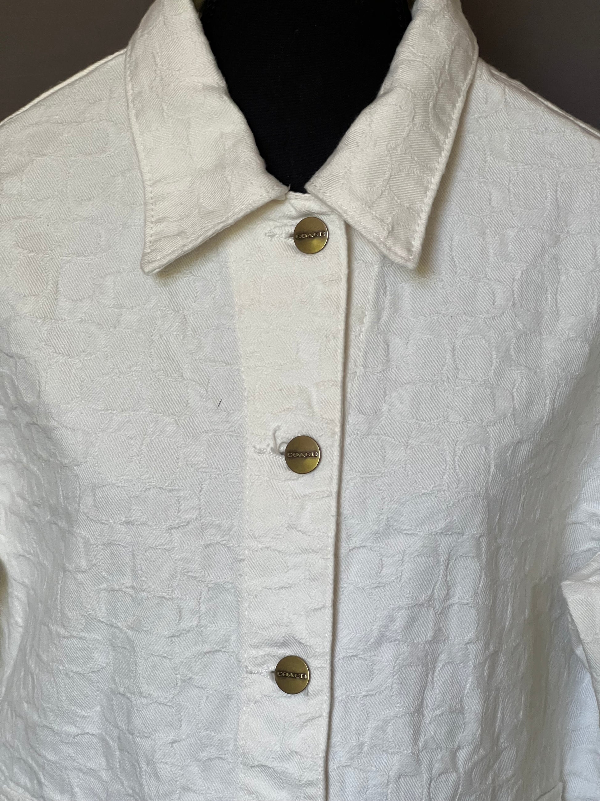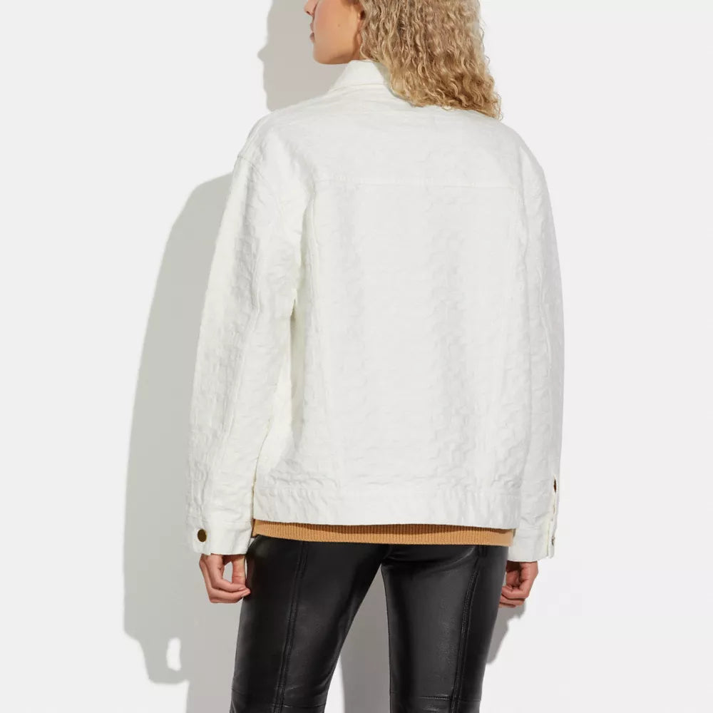 Introducing the Coach Signature Denim Jacket. Crafted from premium quality denim, this jacket combines timeless style with durability. The signature Coach monogram design adds a touch of sophistication. Stay warm and fashionable all year long with this must-have piece.