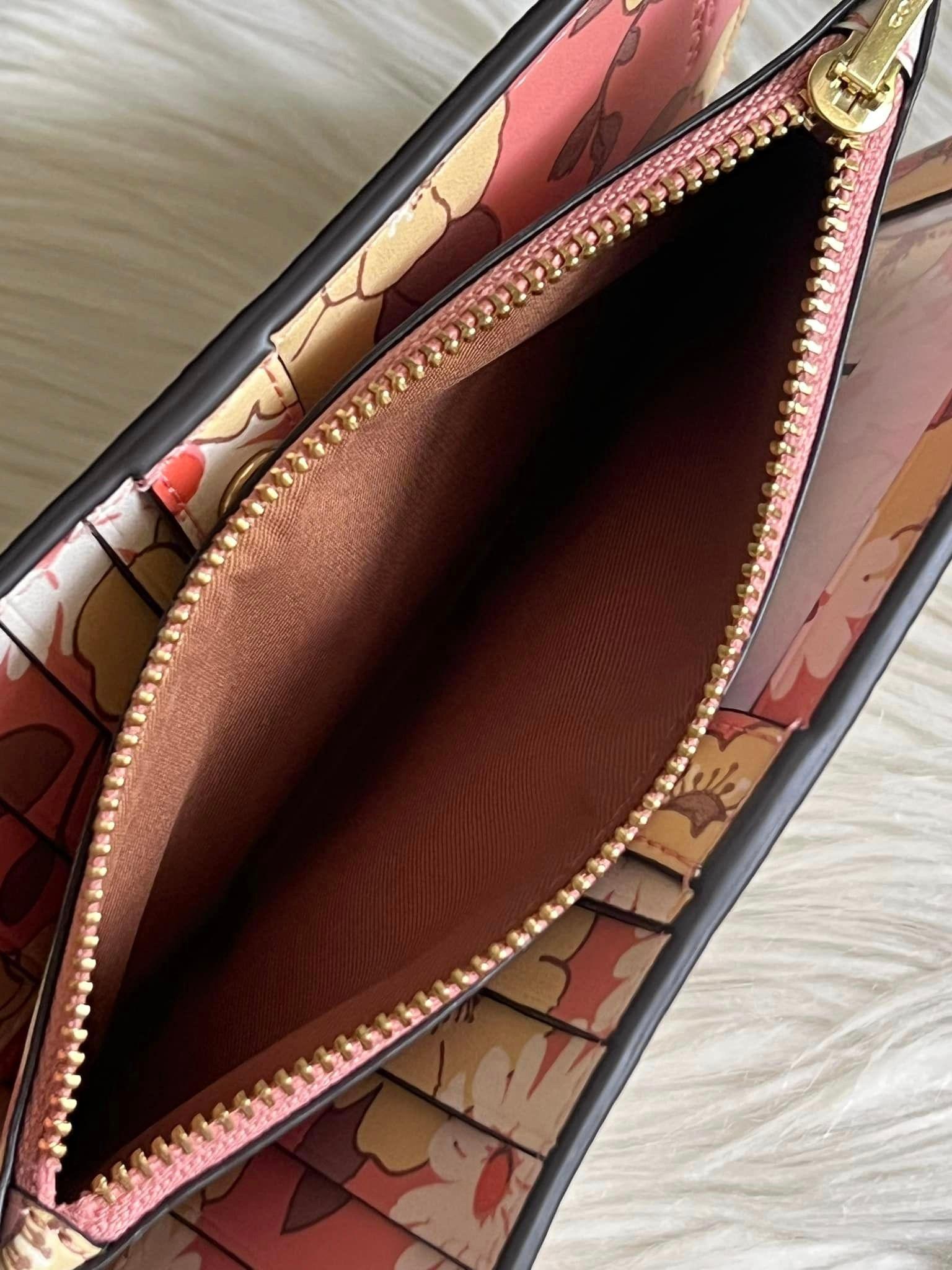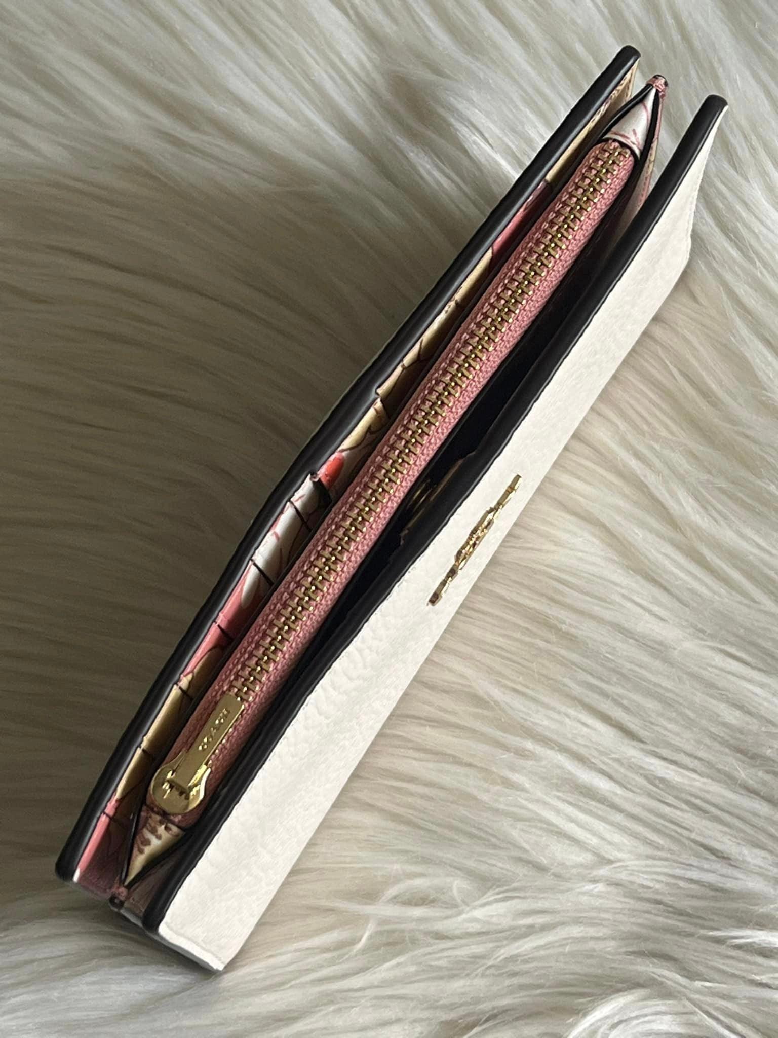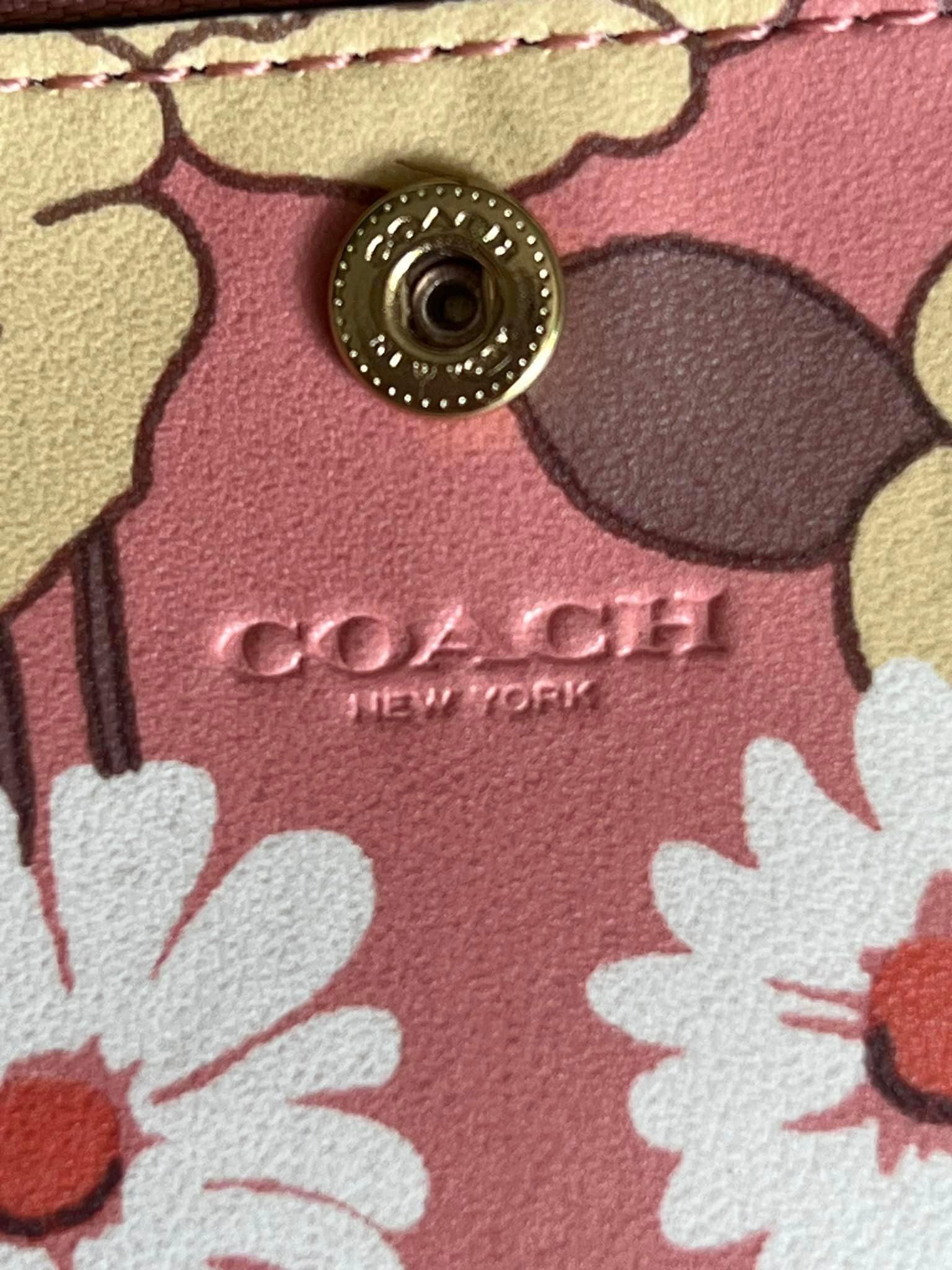 Expertly crafted with floral cluster print interior, the Coach Slim Zip Wallet is a stylish and practical addition to your accessories collection. Its compact design of 7”L x 3.75”H allows for easy storage while the gold and chalk color combination adds a touch of elegance. Perfect for staying organized on the go.