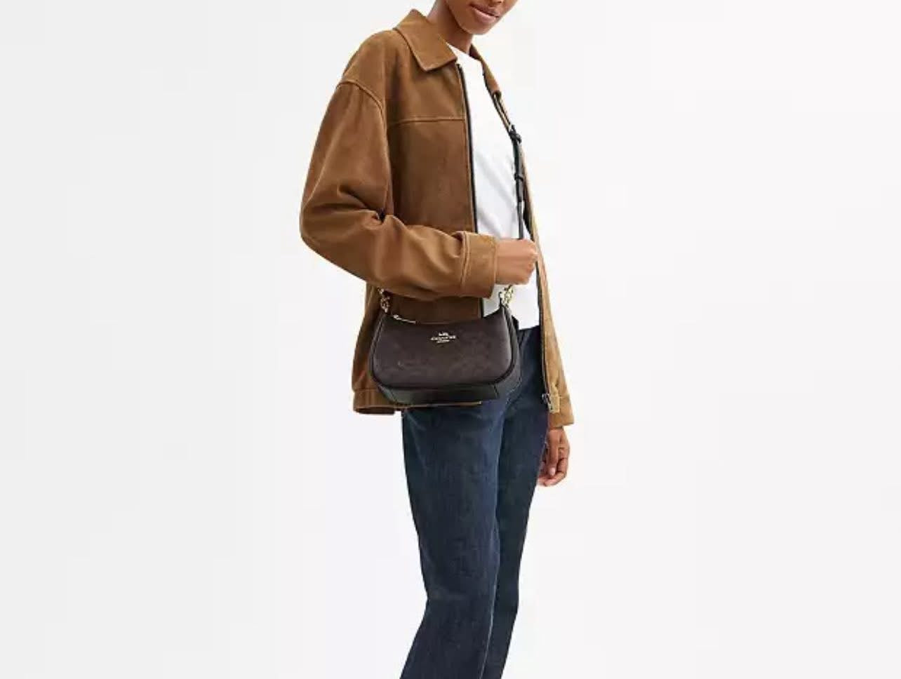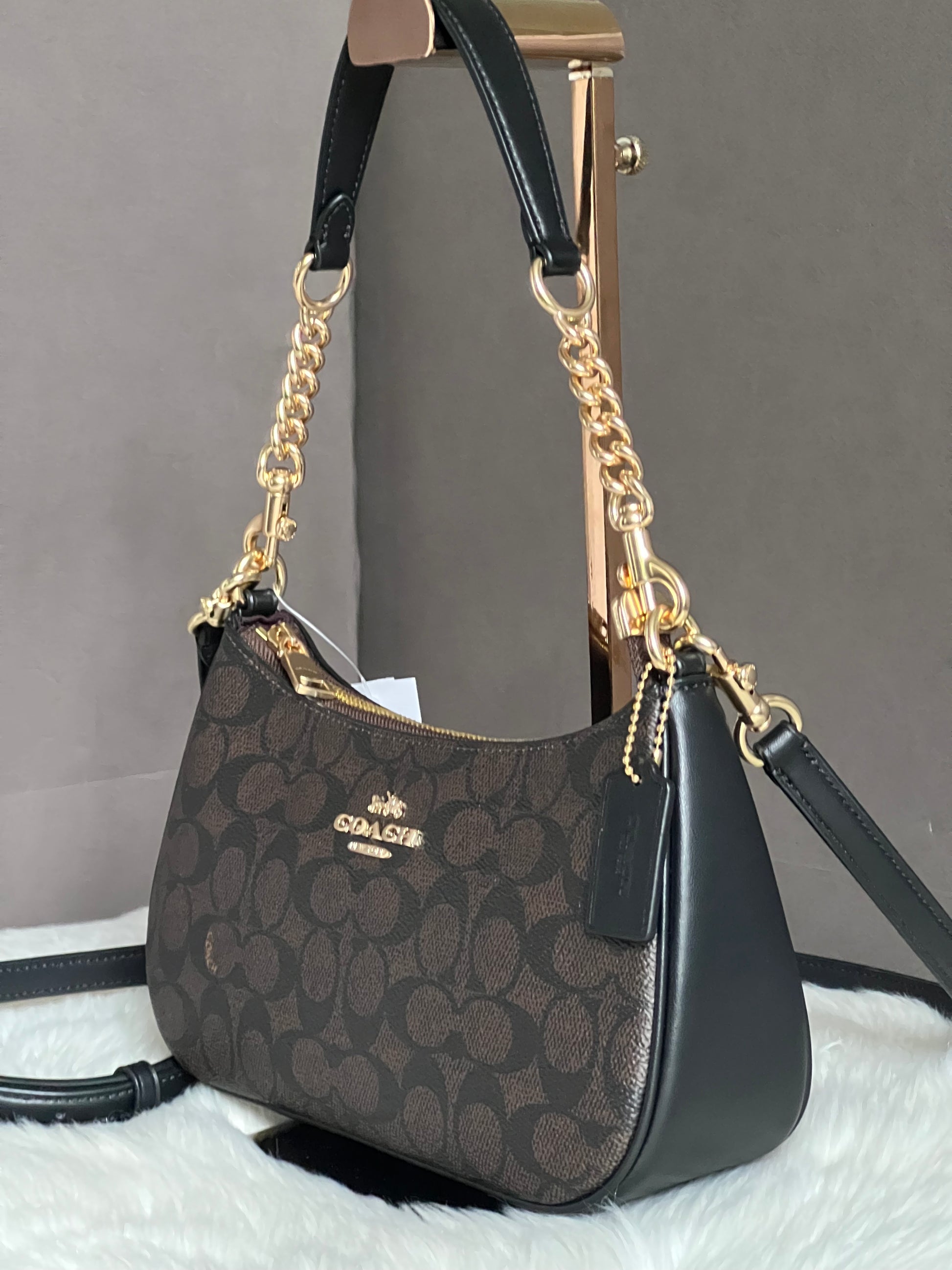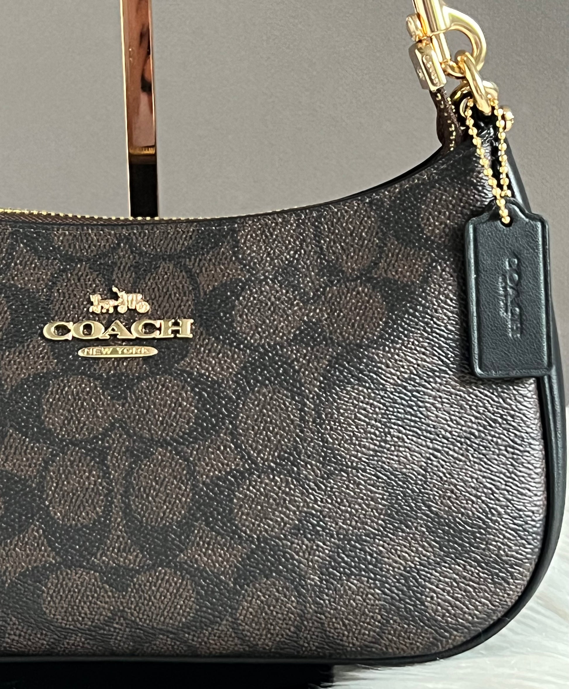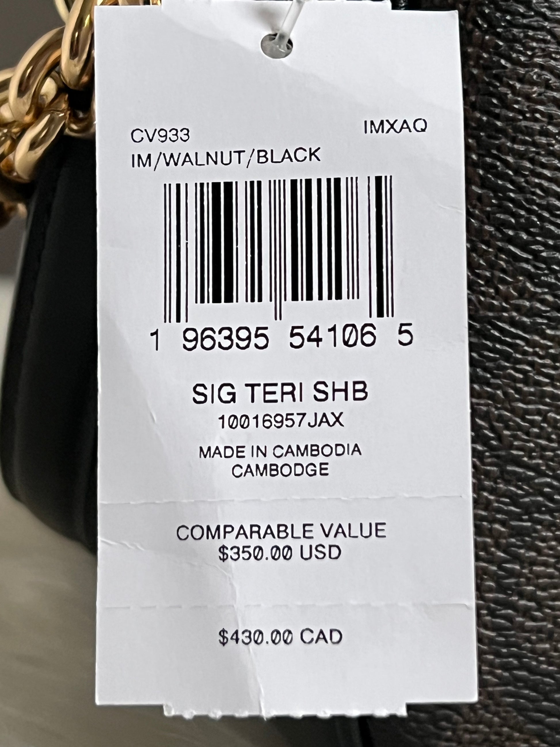 The Coach Teri Shoulder Bag in Signature Canvas combines timeless style with practical design. Crafted in a rich Walnut and Black colorway, this compact bag measures 9.5”L x 6”H x 3”W, offering just the right space for essentials. Its signature canvas exterior ensures durability while maintaining a sophisticated look, making it an ideal accessory for both day and evening wear. Priced at $430, it reflects Coach’s commitment to quality and craftsmanship.