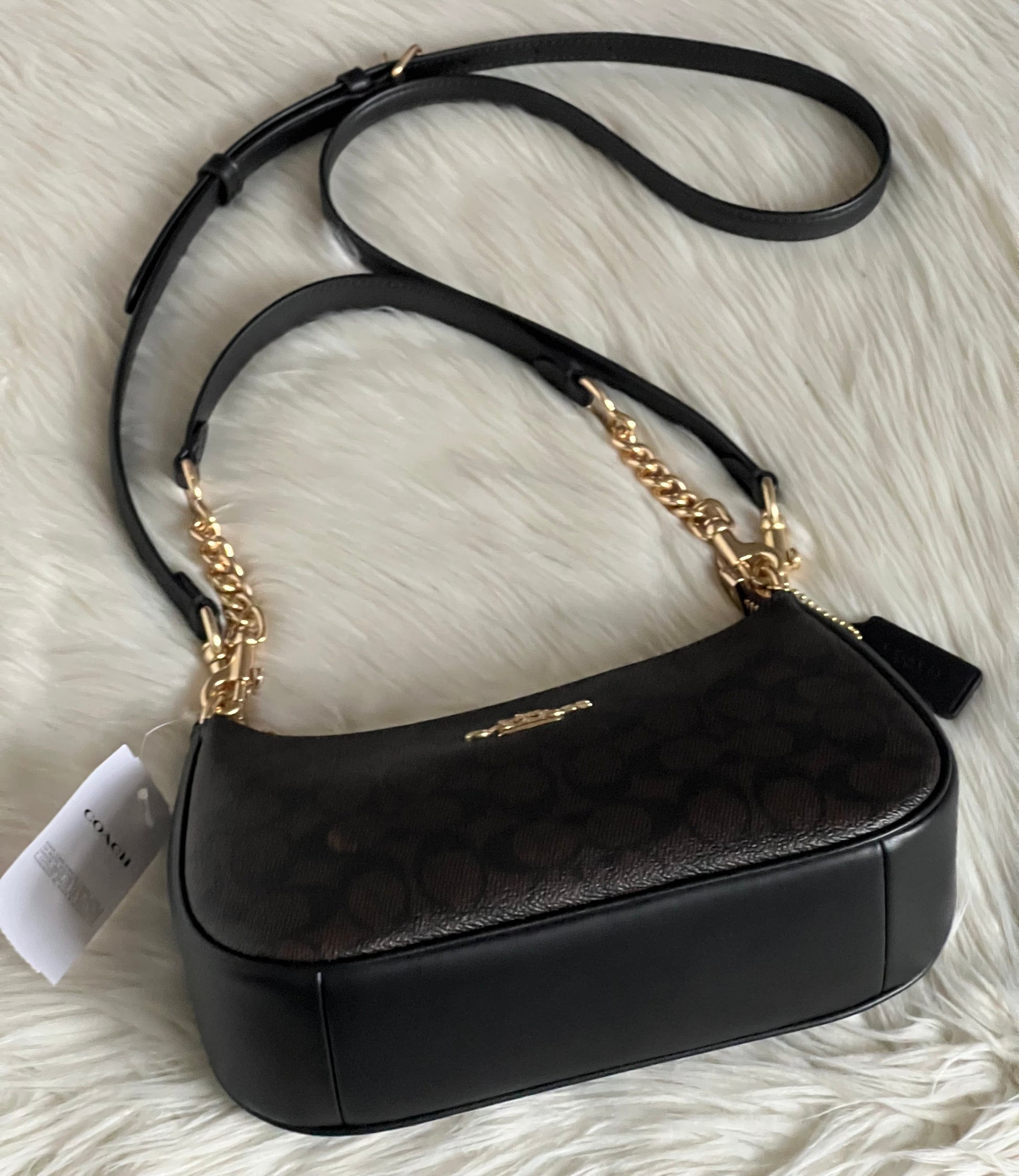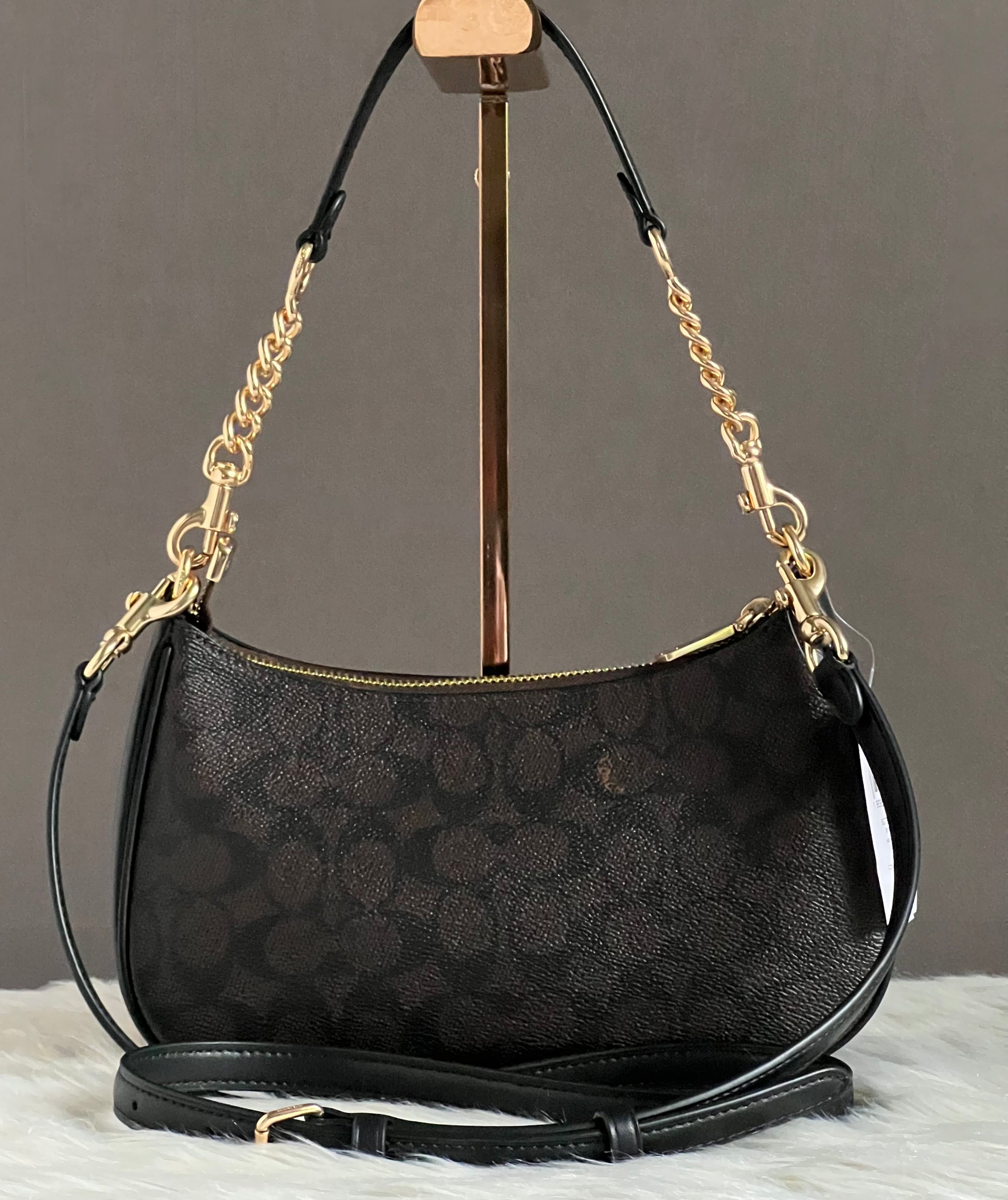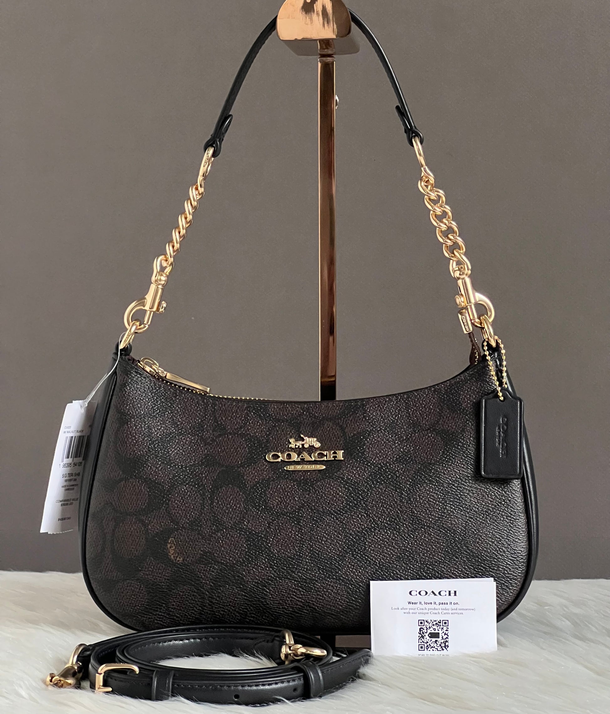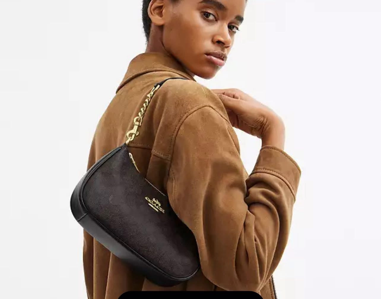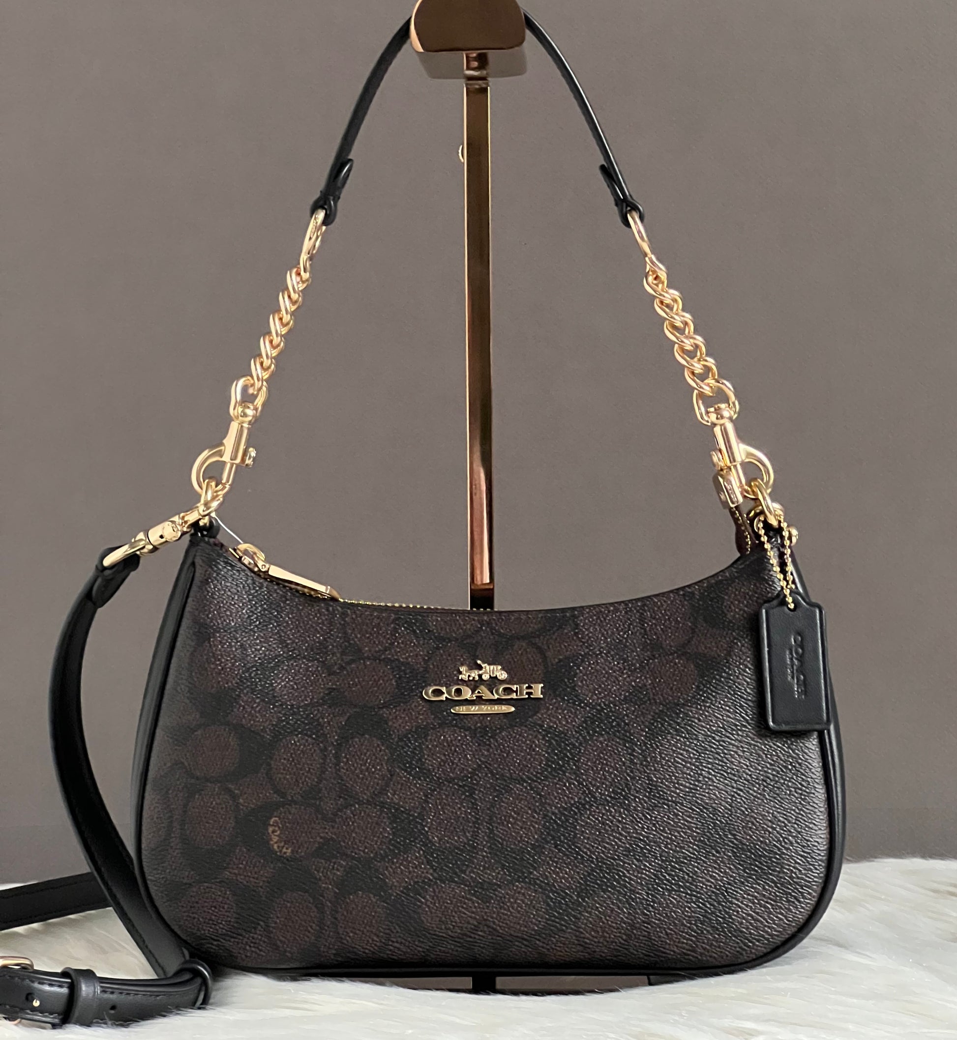 The Coach Teri Shoulder Bag in Signature Canvas combines timeless style with practical design. Crafted in a rich Walnut and Black colorway, this compact bag measures 9.5”L x 6”H x 3”W, offering just the right space for essentials. Its signature canvas exterior ensures durability while maintaining a sophisticated look, making it an ideal accessory for both day and evening wear. Priced at $430, it reflects Coach’s commitment to quality and craftsmanship.