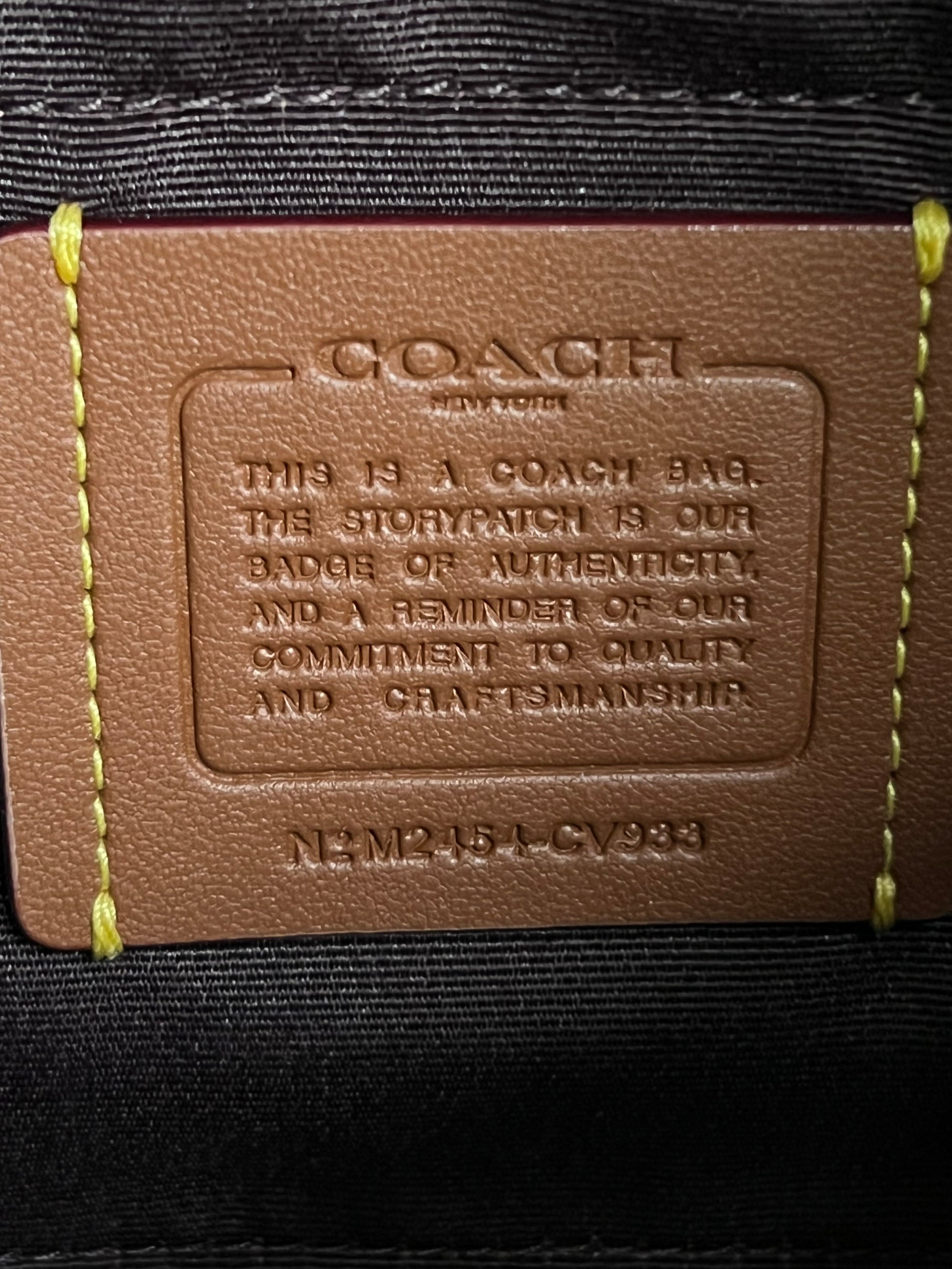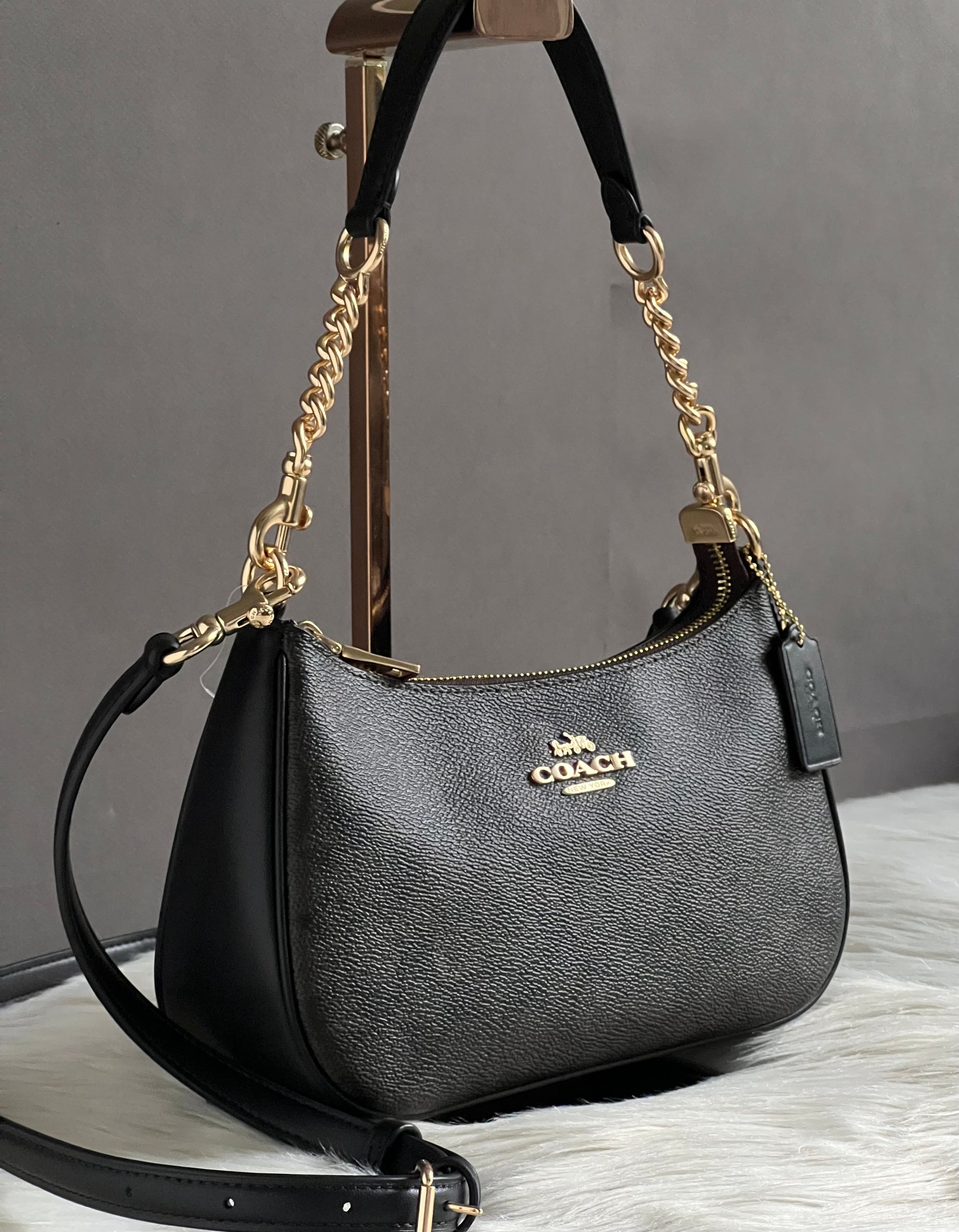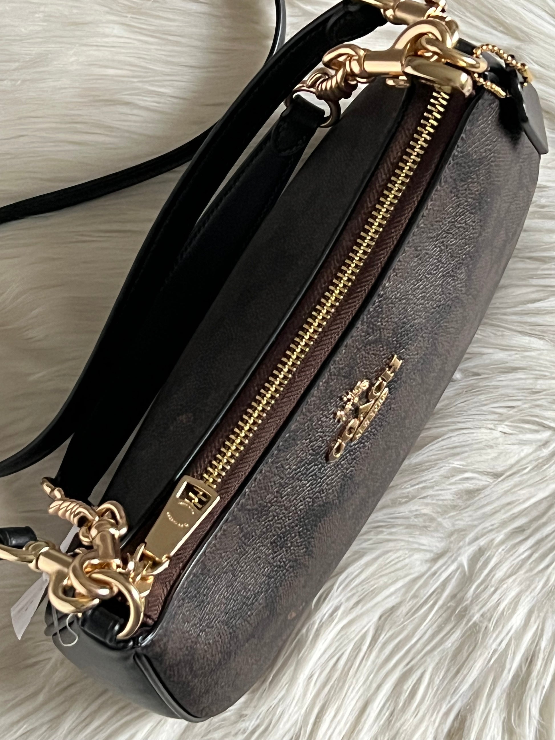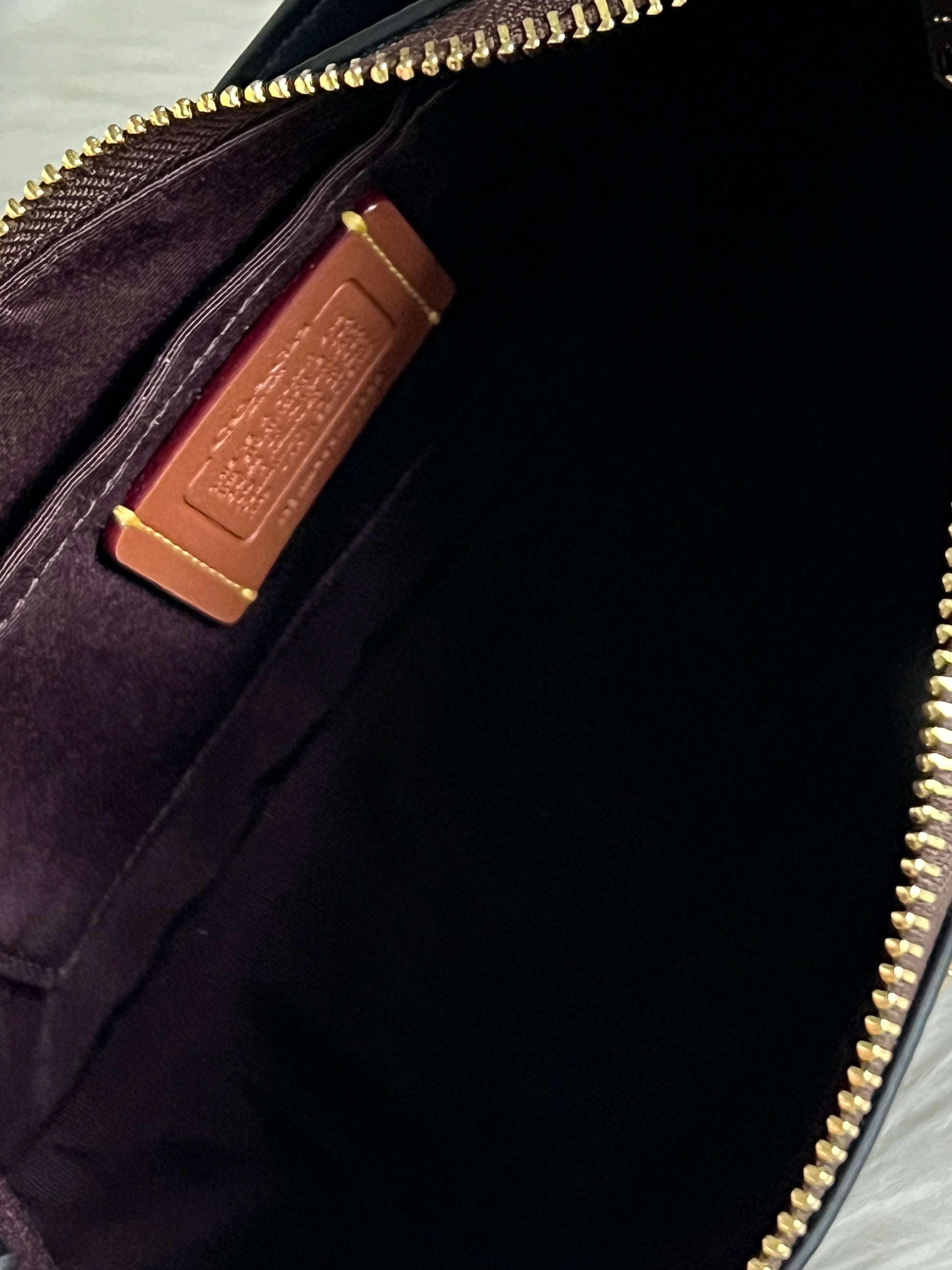 The Coach Teri Shoulder Bag in Signature Canvas combines timeless style with practical design. Crafted in a rich Walnut and Black colorway, this compact bag measures 9.5”L x 6”H x 3”W, offering just the right space for essentials. Its signature canvas exterior ensures durability while maintaining a sophisticated look, making it an ideal accessory for both day and evening wear. Priced at $430, it reflects Coach’s commitment to quality and craftsmanship.