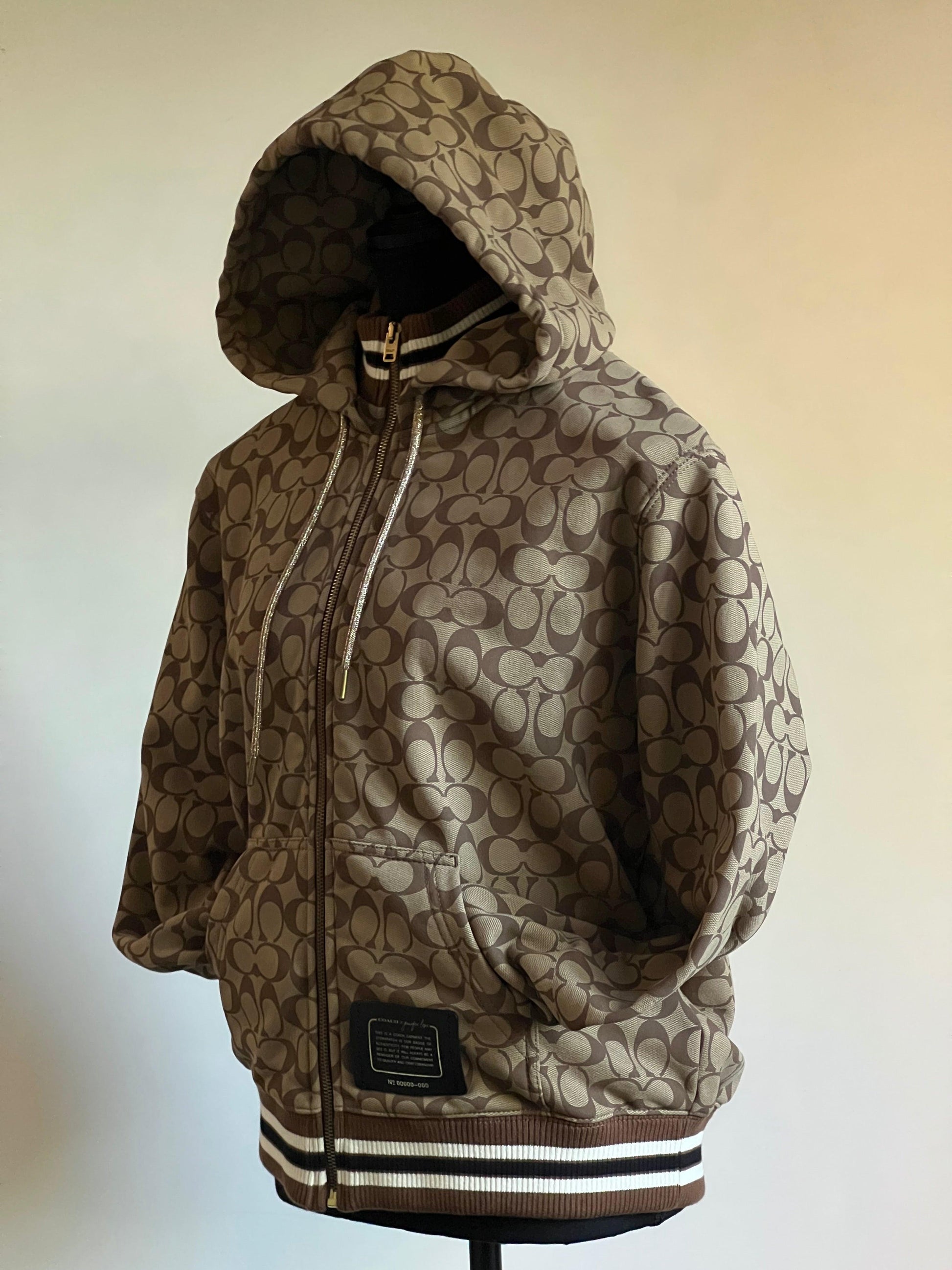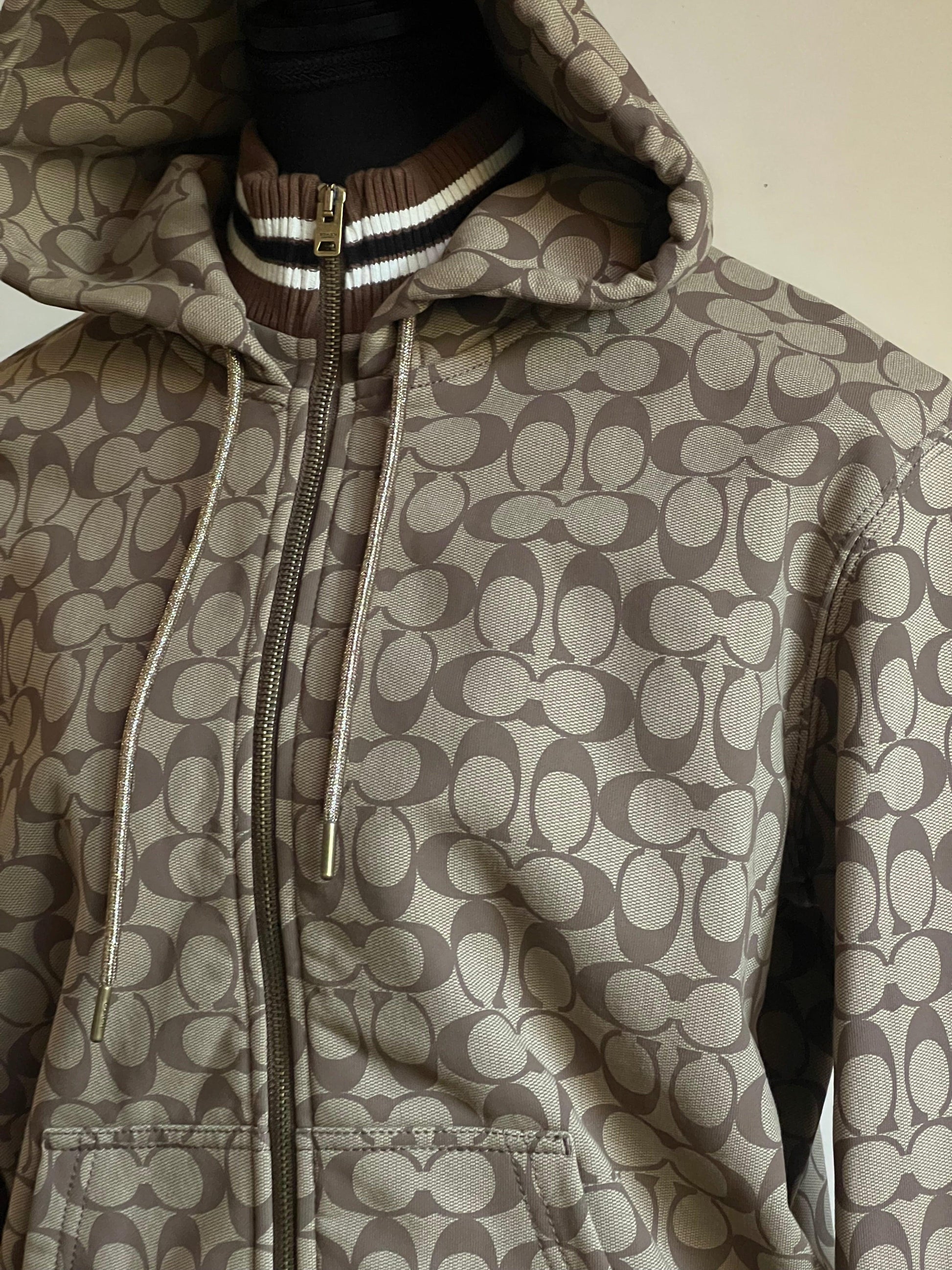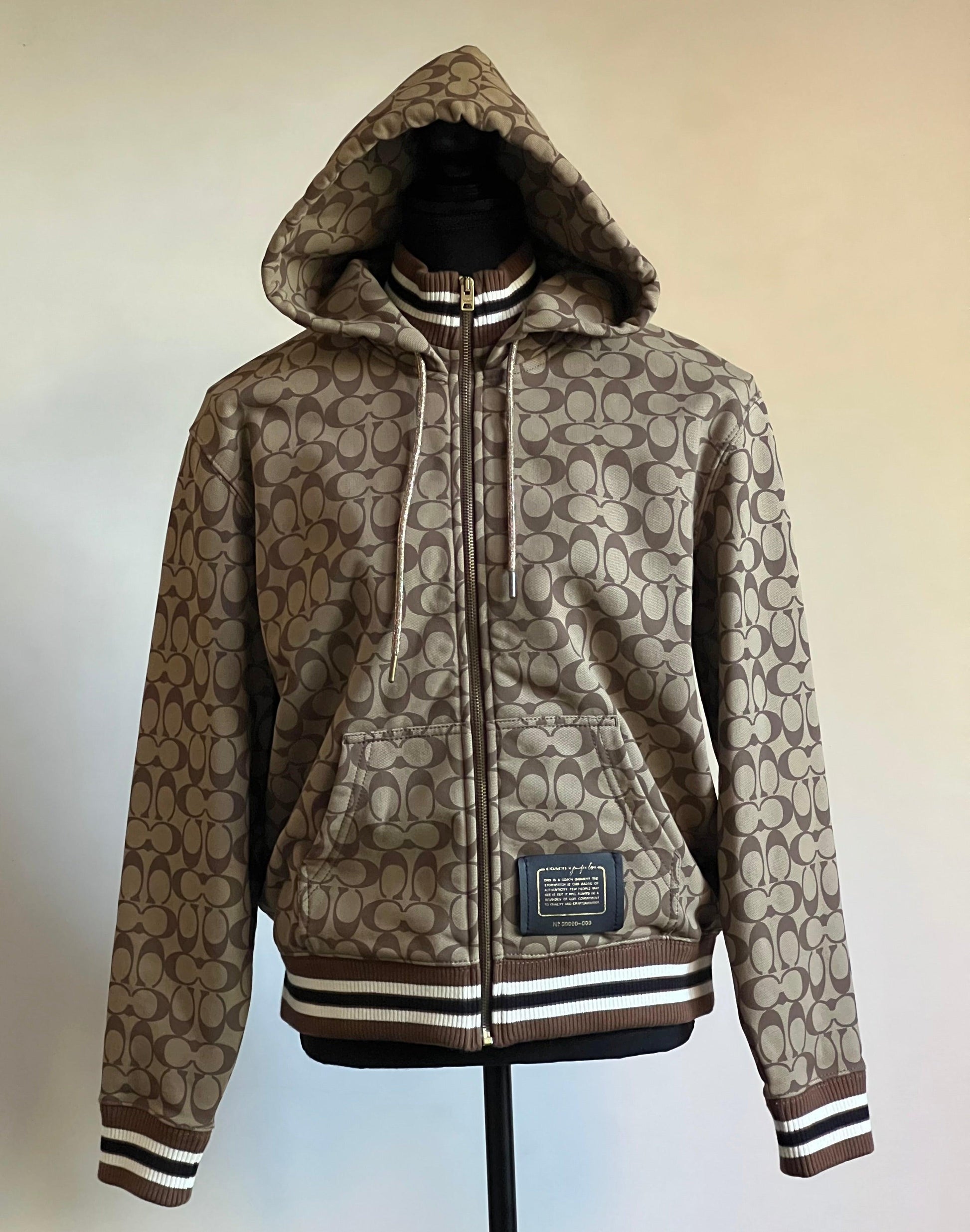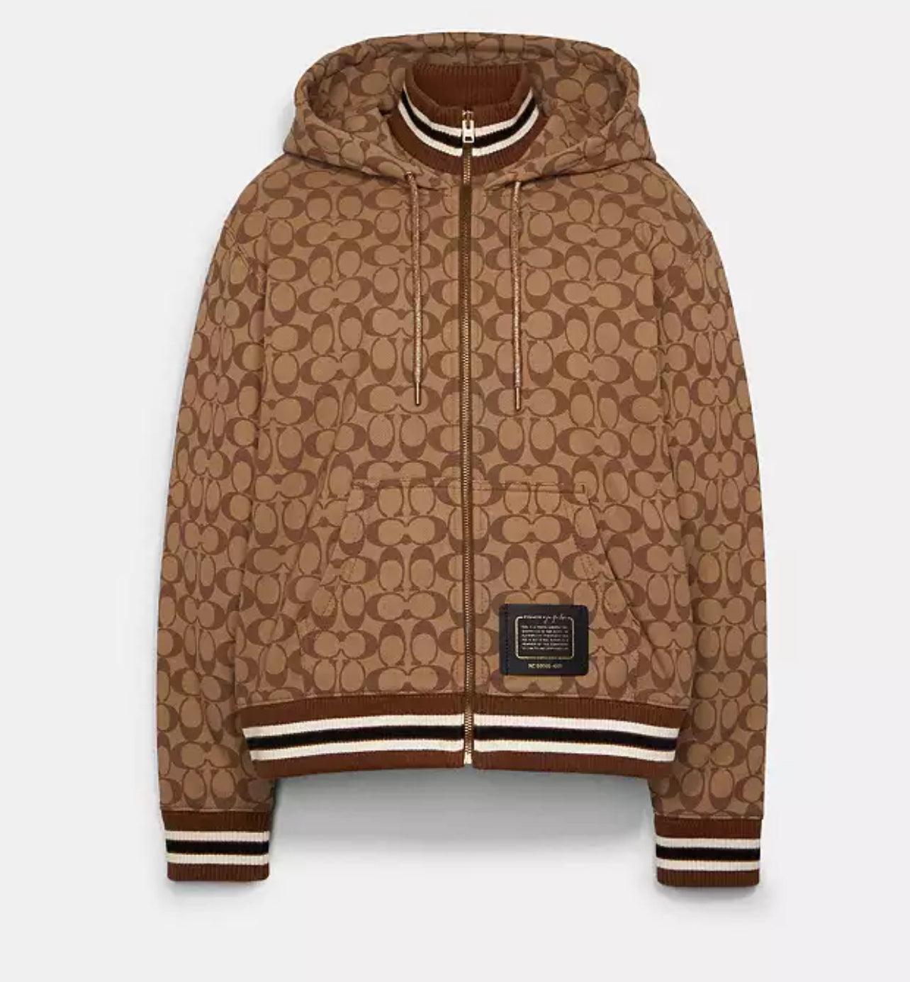 Elevate your style with the Coach X Jennifer Lopez Signature Zip Up Hoodie. Designed with a chic signature print, this hoodie will make a statement wherever you go. The zip up feature allows for versatile wear while providing warmth and comfort. Step out in confidence and style with this must-have piece!