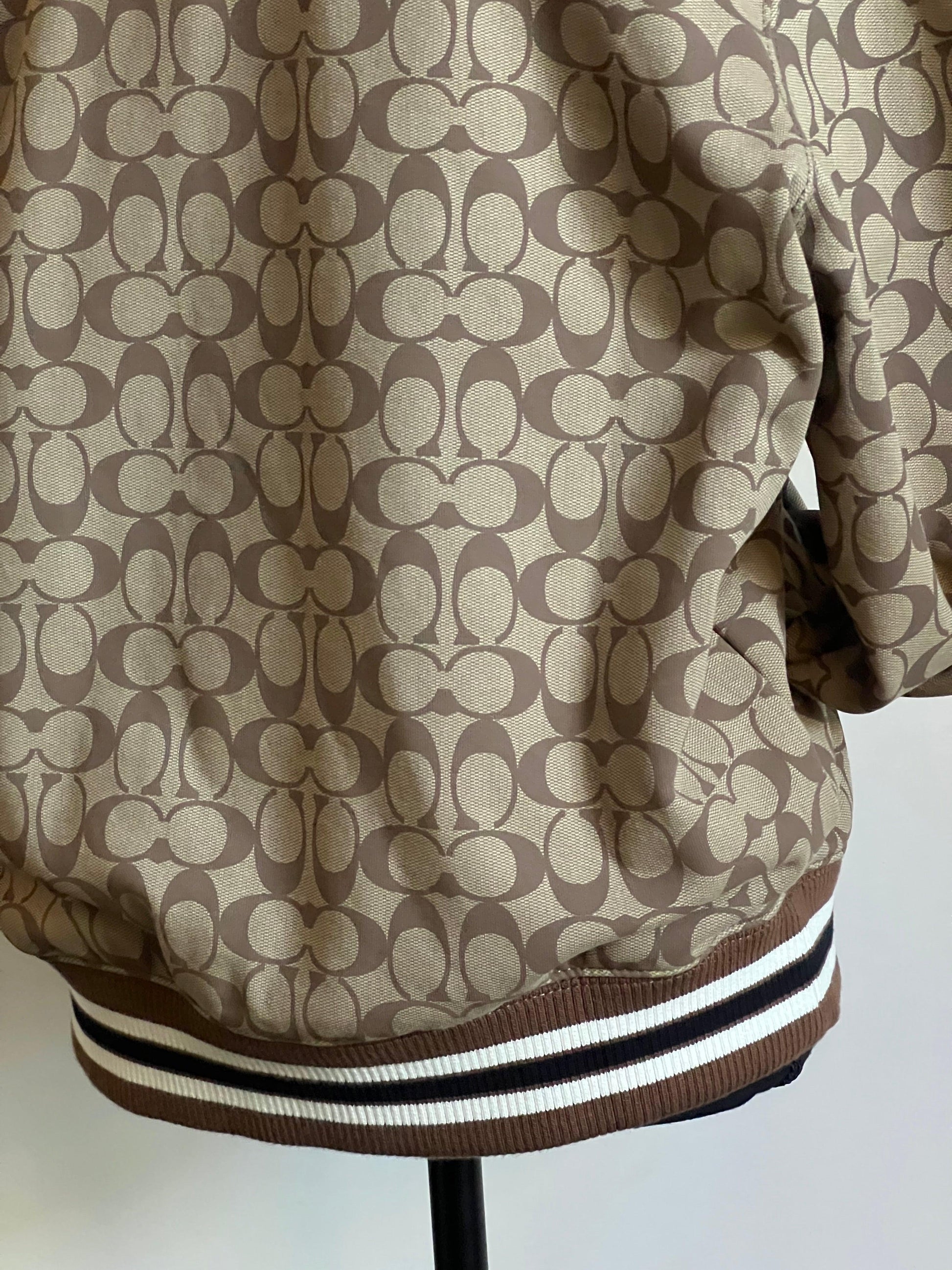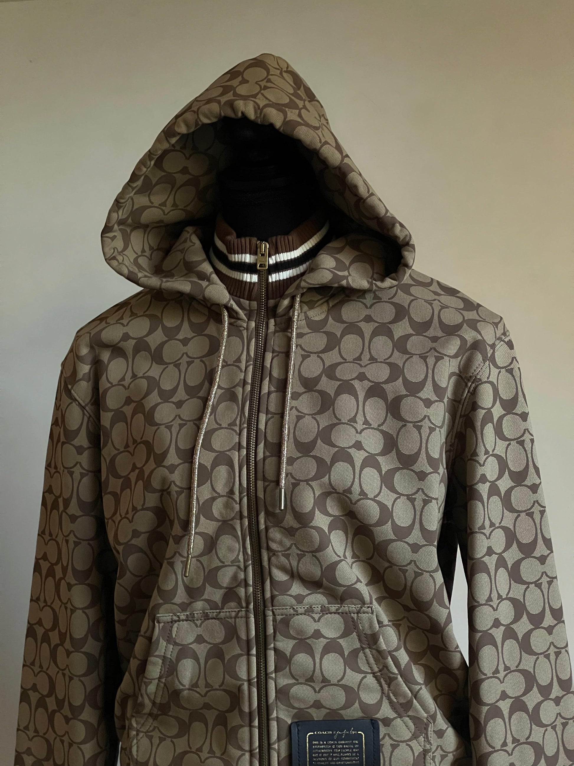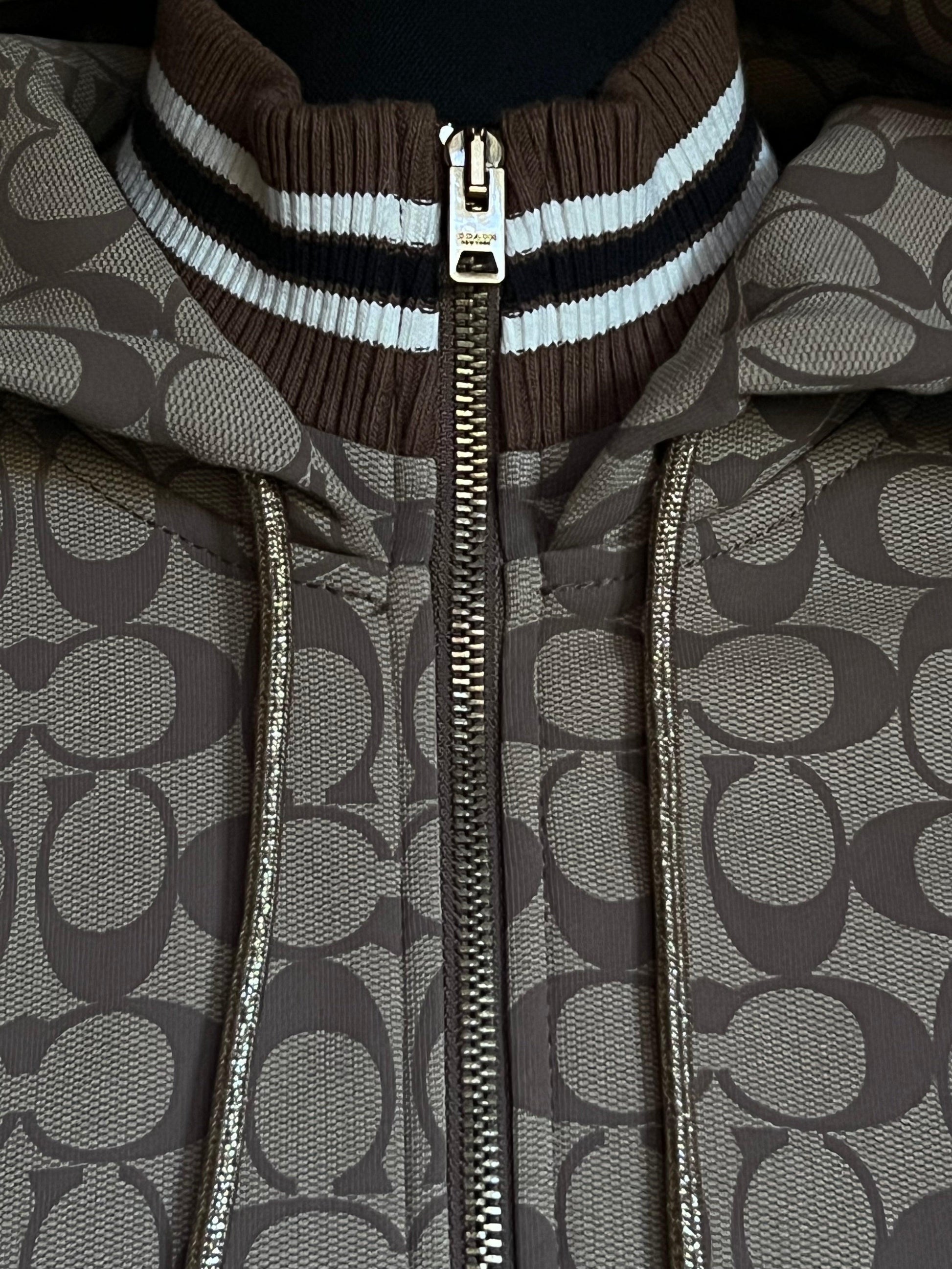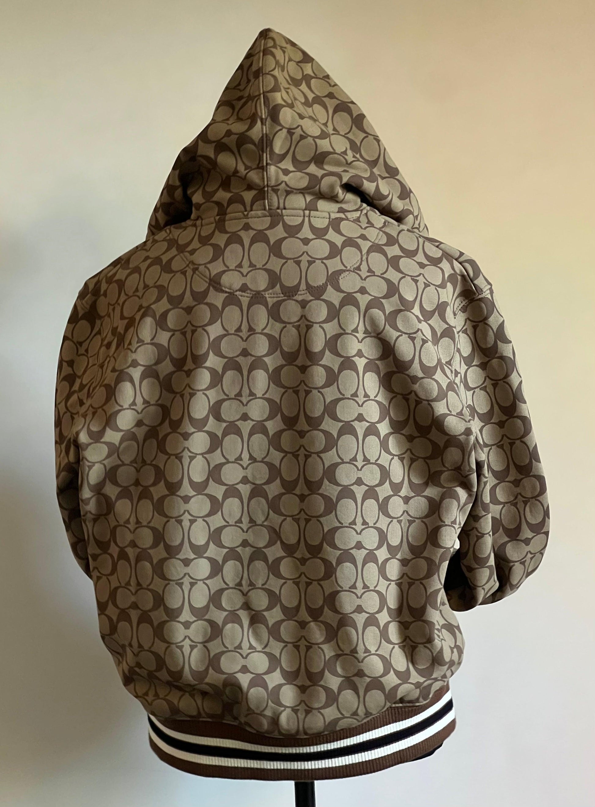 Elevate your style with the Coach X Jennifer Lopez Signature Zip Up Hoodie. Designed with a chic signature print, this hoodie will make a statement wherever you go. The zip up feature allows for versatile wear while providing warmth and comfort. Step out in confidence and style with this must-have piece!