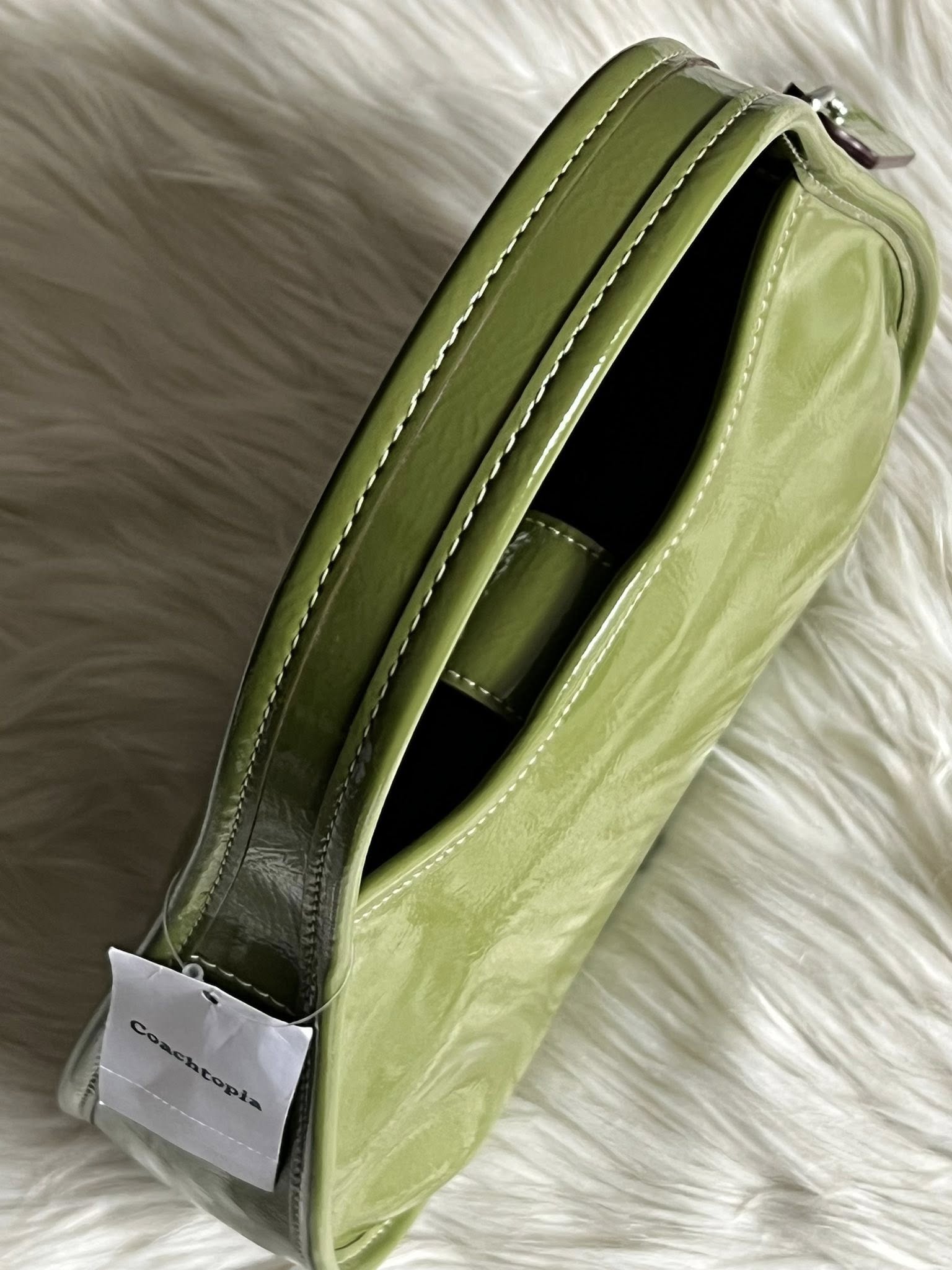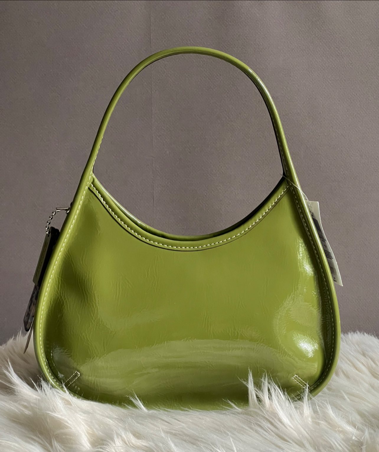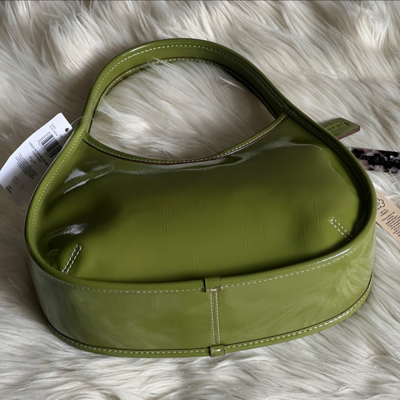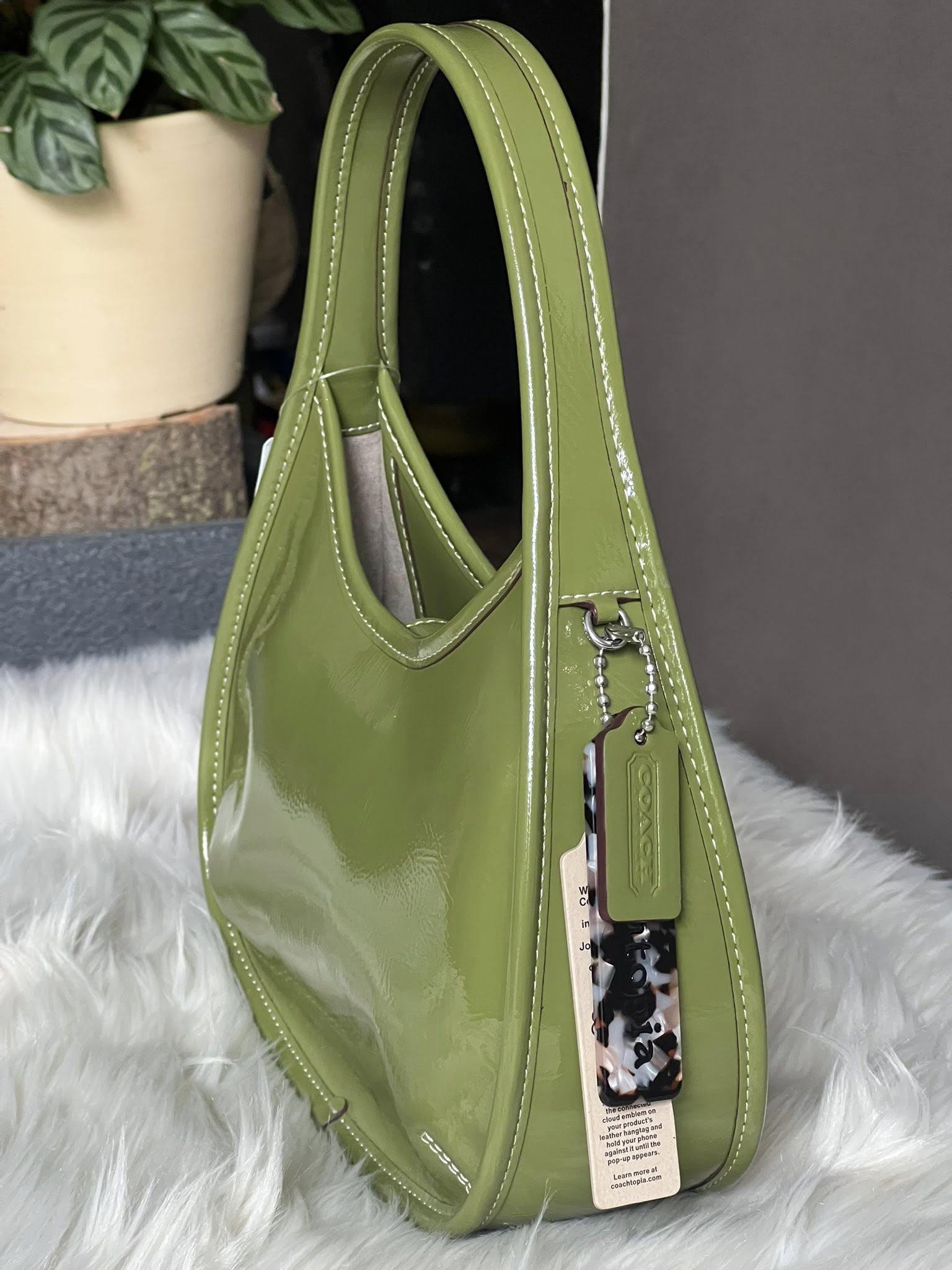 The Coachtopia Ergo in Crinkled Patent Leather offers a sophisticated blend of style and practicality. Crafted in an elegant olive green, this bag measures 10”L x 12”H x 3”D, providing ample space for essentials while maintaining a sleek profile. Its crinkled patent leather finish adds a distinctive texture and durability, making it a refined choice for everyday use. Priced at $350, it combines expert craftsmanship with functional design, ideal for those seeking a versatile accessory that complements both professional and casual wardrobes.