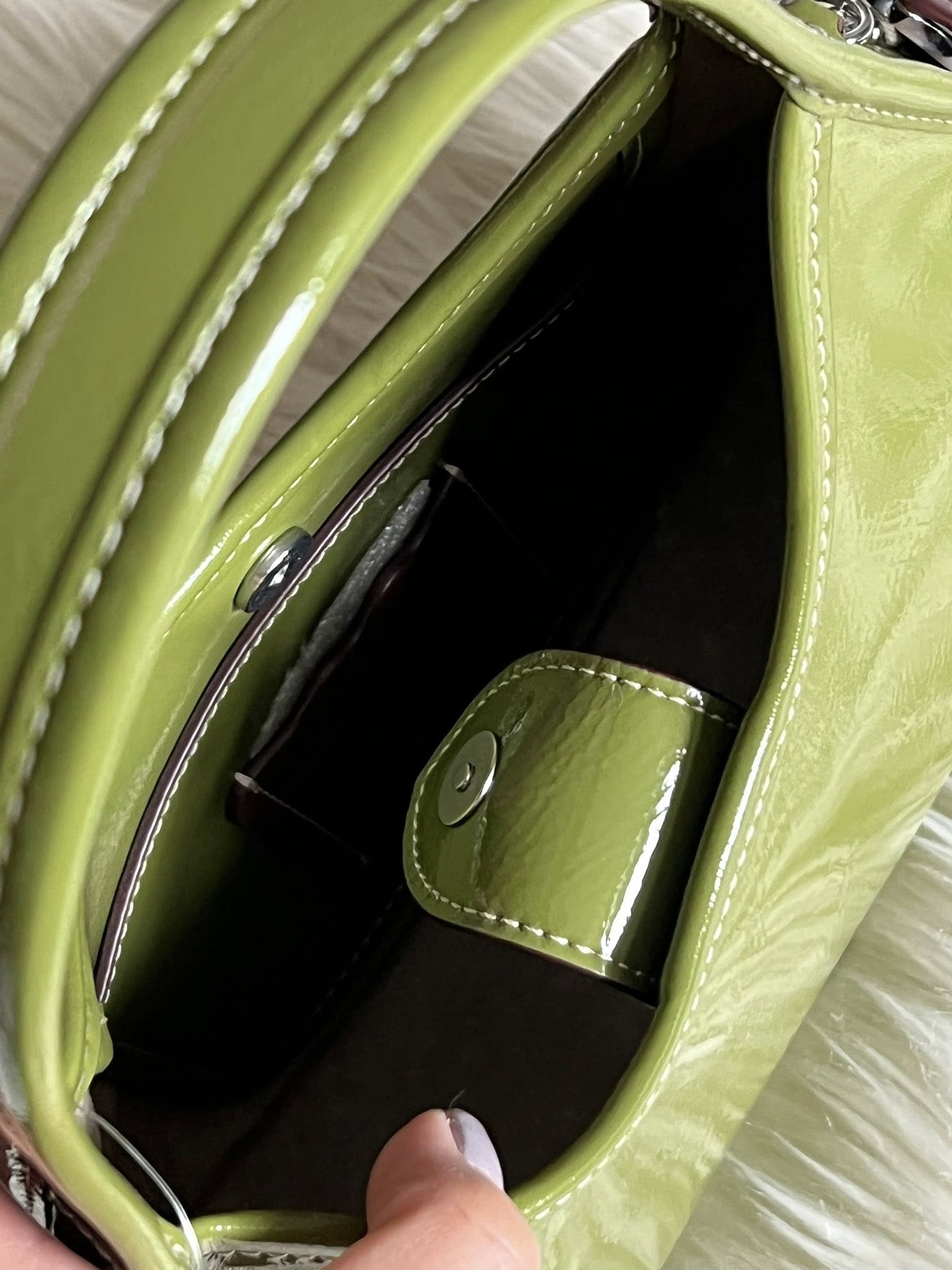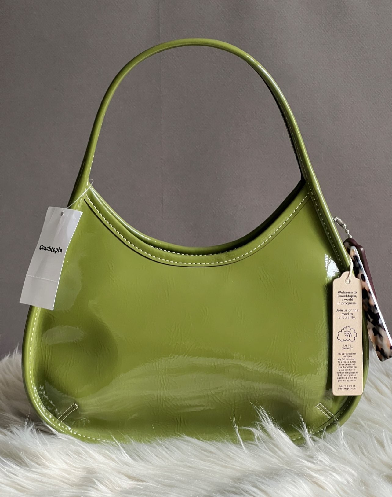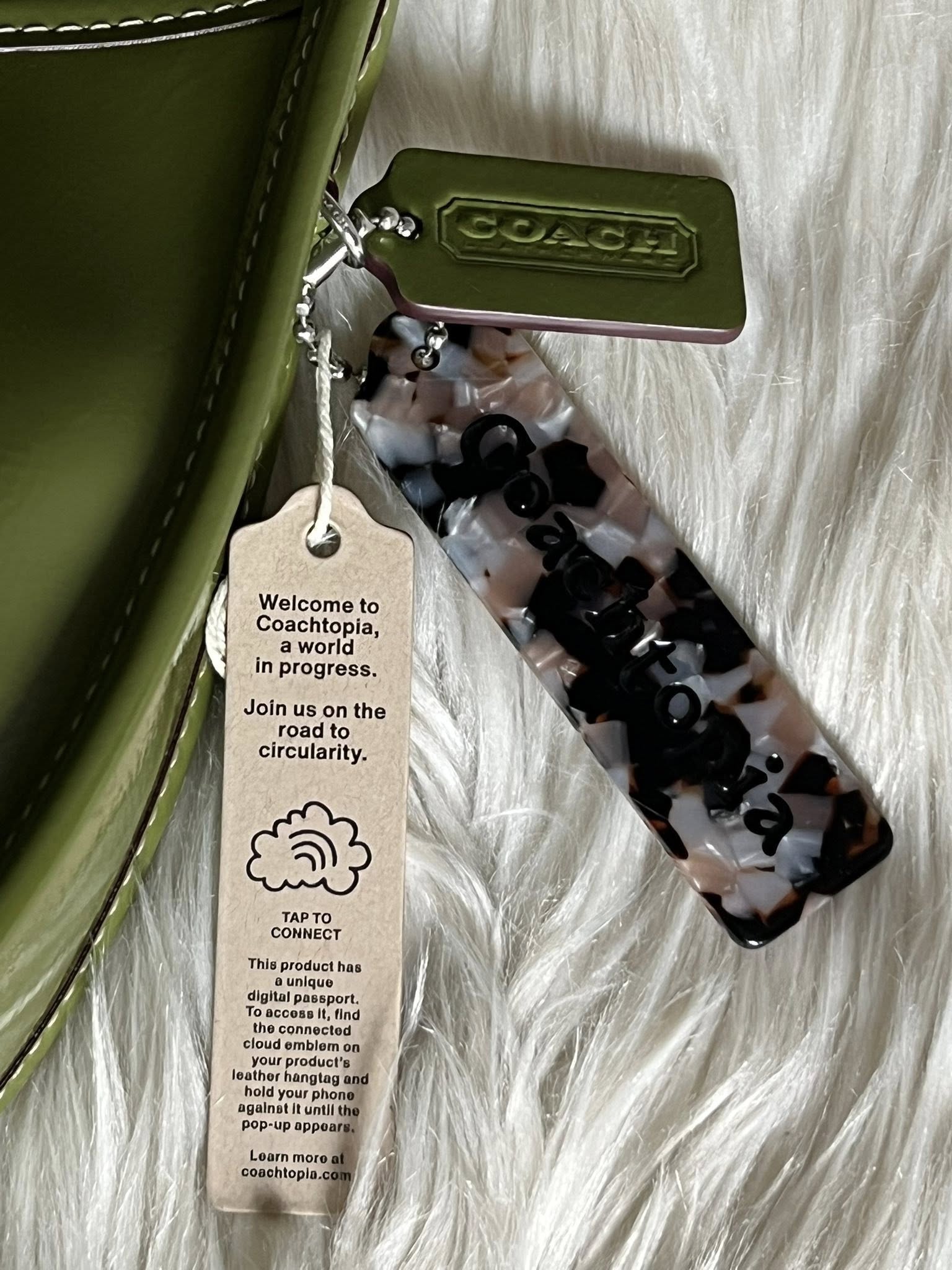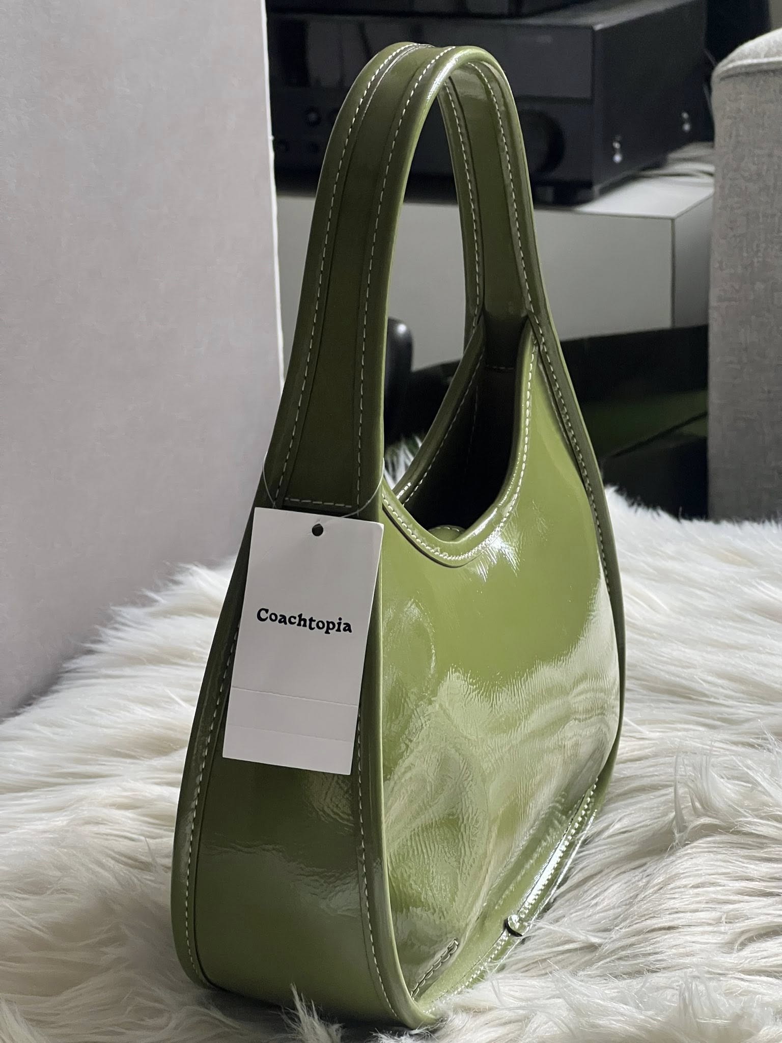 The Coachtopia Ergo in Crinkled Patent Leather offers a sophisticated blend of style and practicality. Crafted in an elegant olive green, this bag measures 10”L x 12”H x 3”D, providing ample space for essentials while maintaining a sleek profile. Its crinkled patent leather finish adds a distinctive texture and durability, making it a refined choice for everyday use. Priced at $350, it combines expert craftsmanship with functional design, ideal for those seeking a versatile accessory that complements both professional and casual wardrobes.