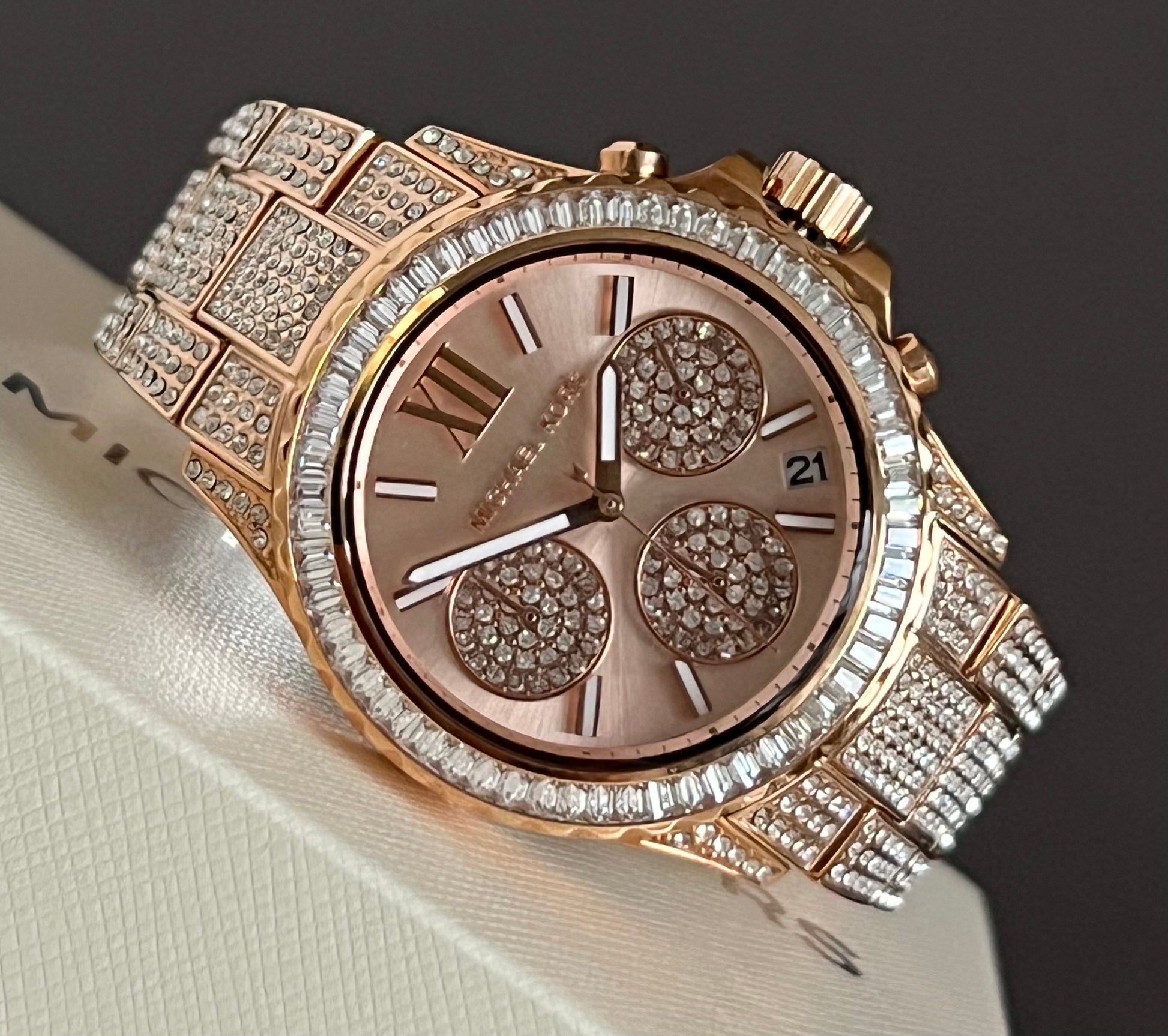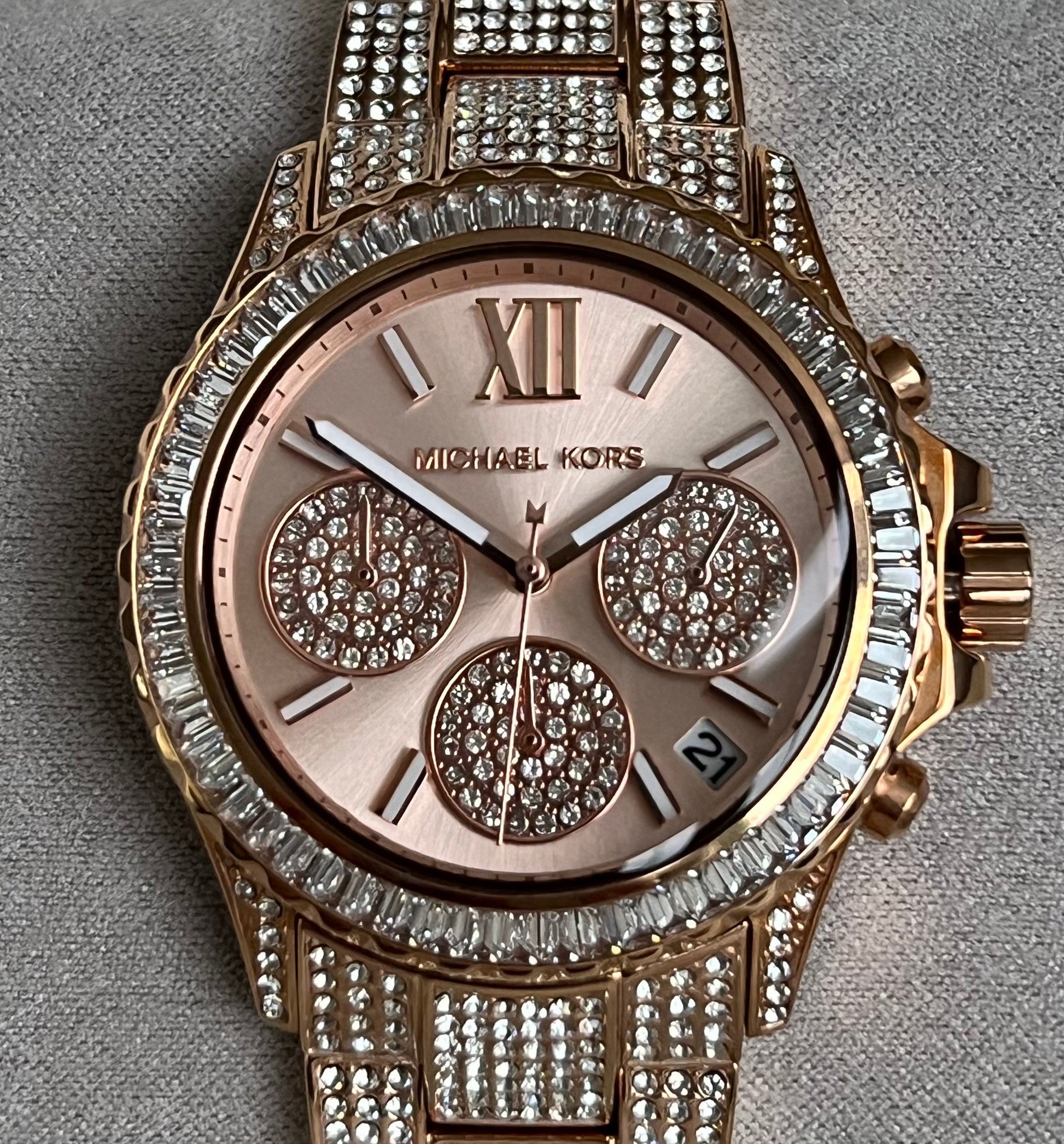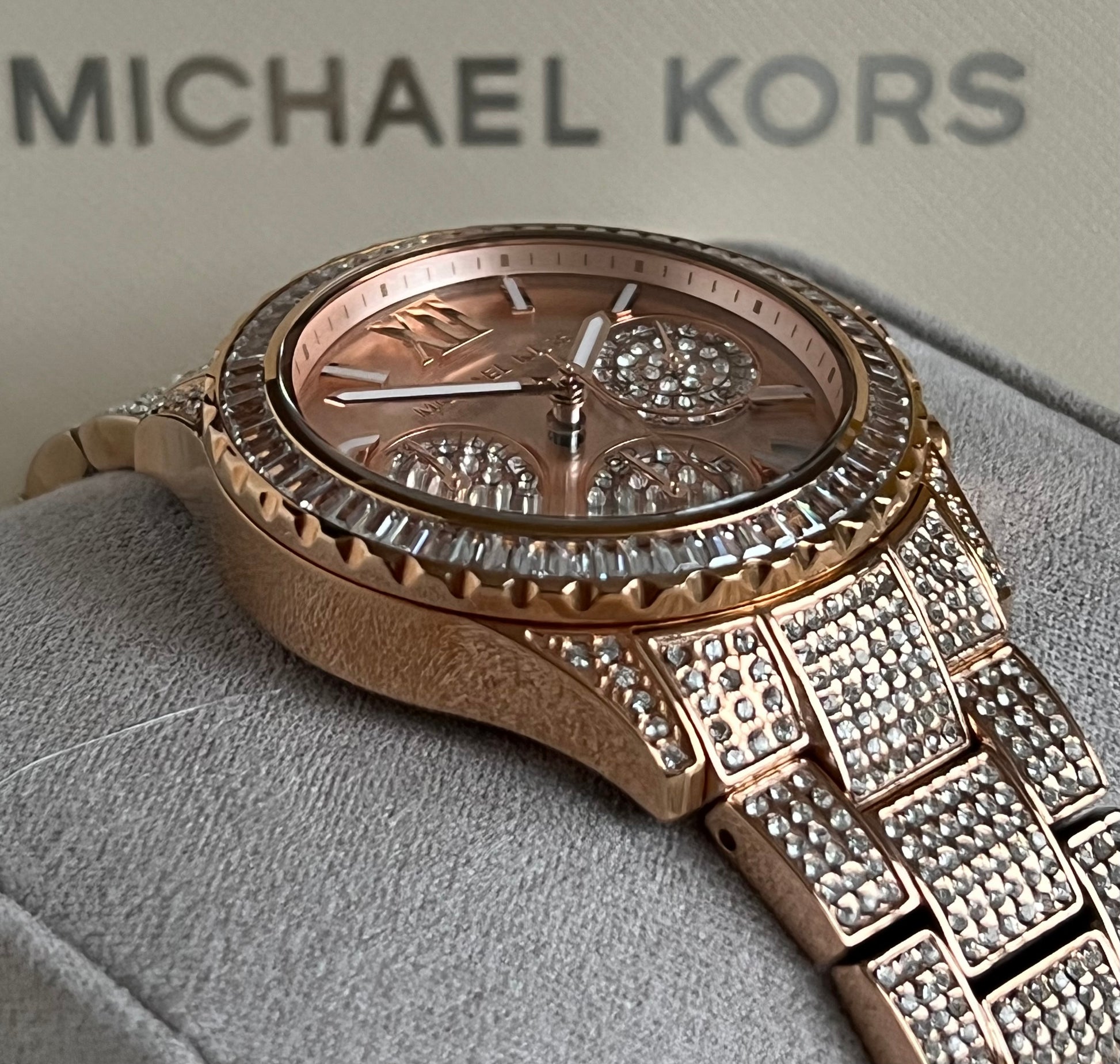 Introducing Michael Kors Women’s Everest Chronograph Quartz Crystal Rose Gold Dial Watch. This elegant timepiece boasts precise quartz movement and a stunning rose gold dial adorned with crystals. With its sleek design and reliable functionality, this watch is a must-have for any fashion-forward woman.