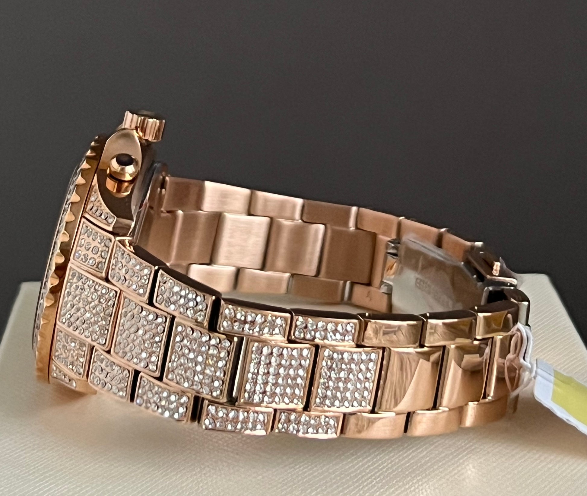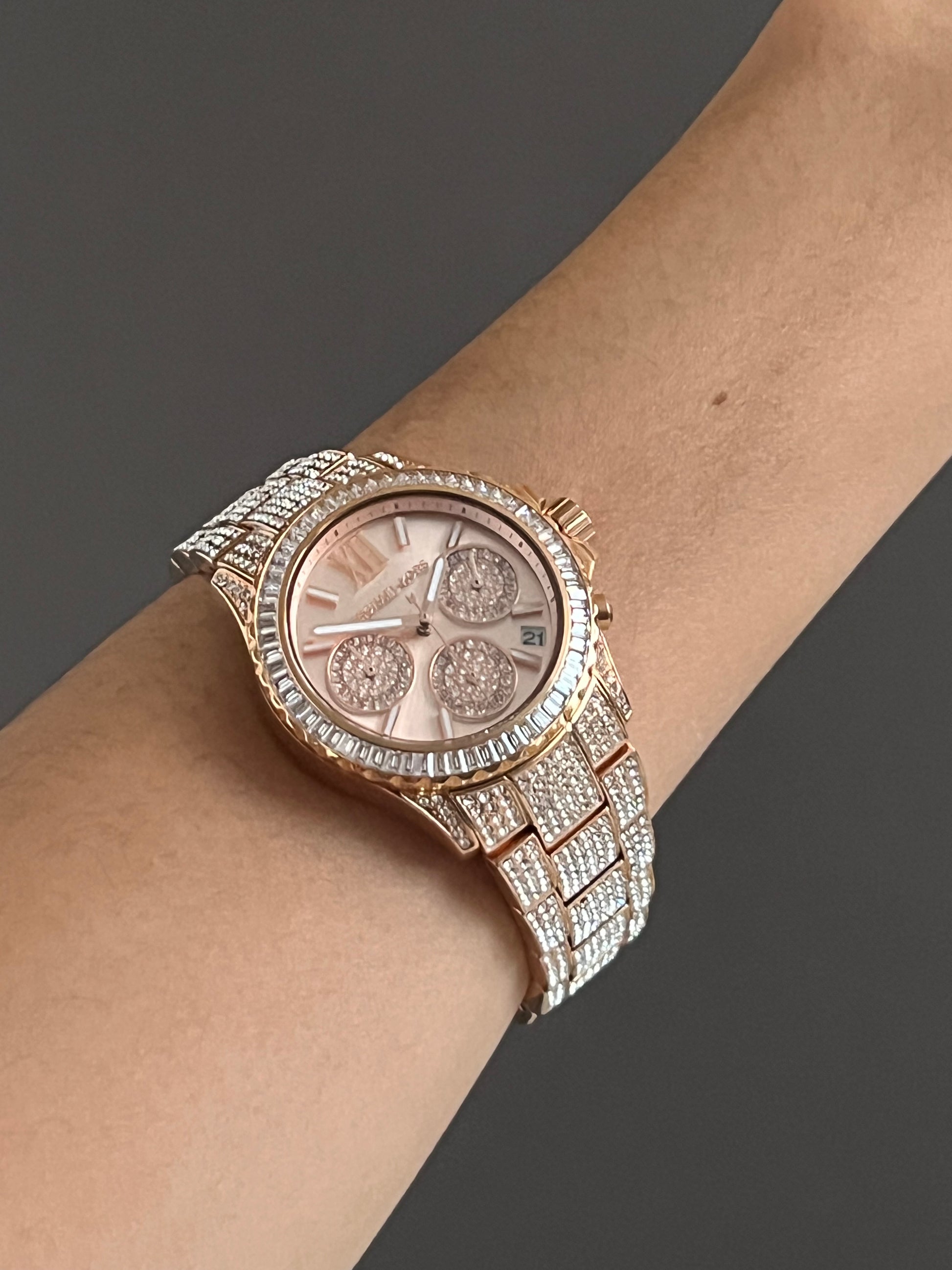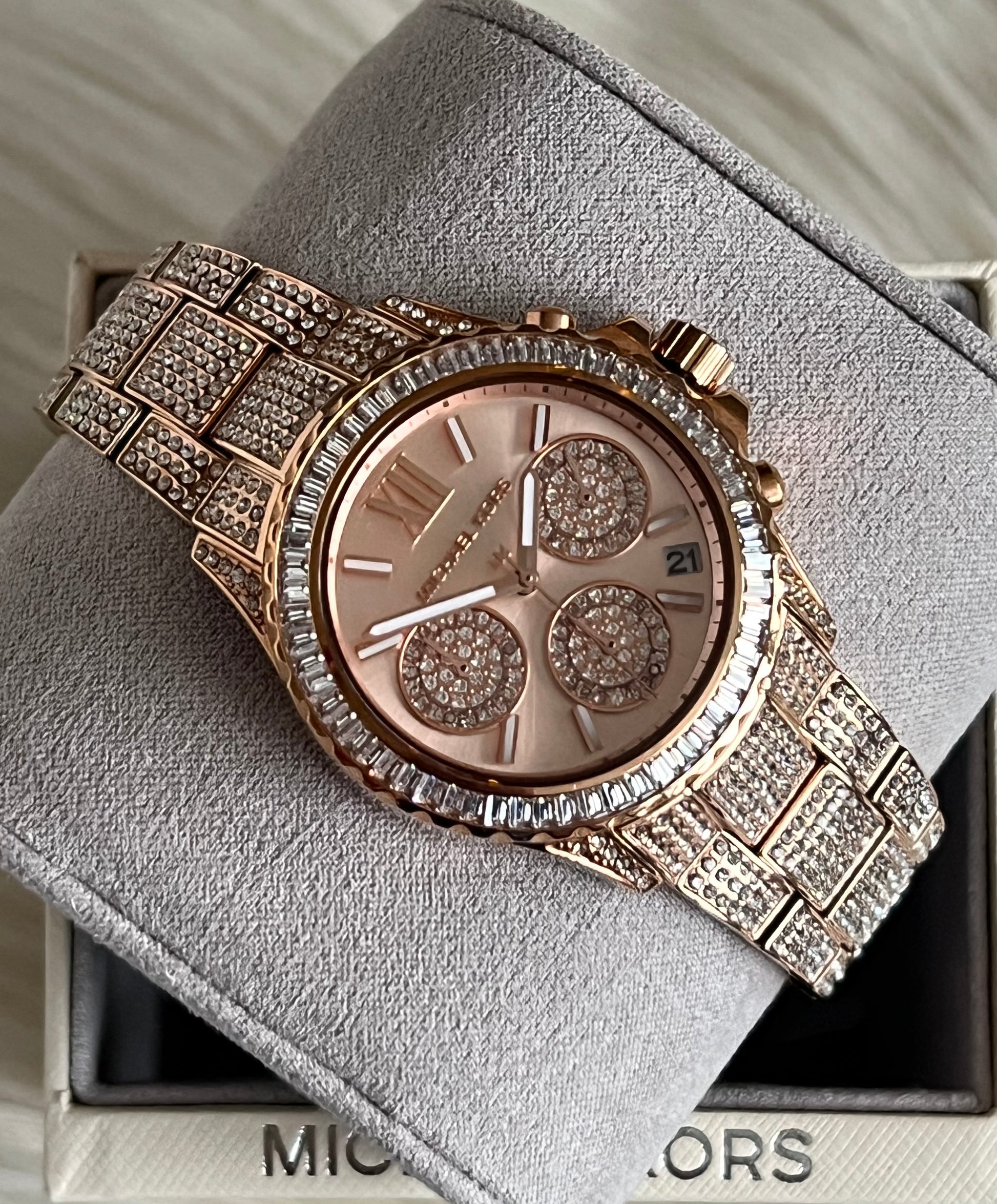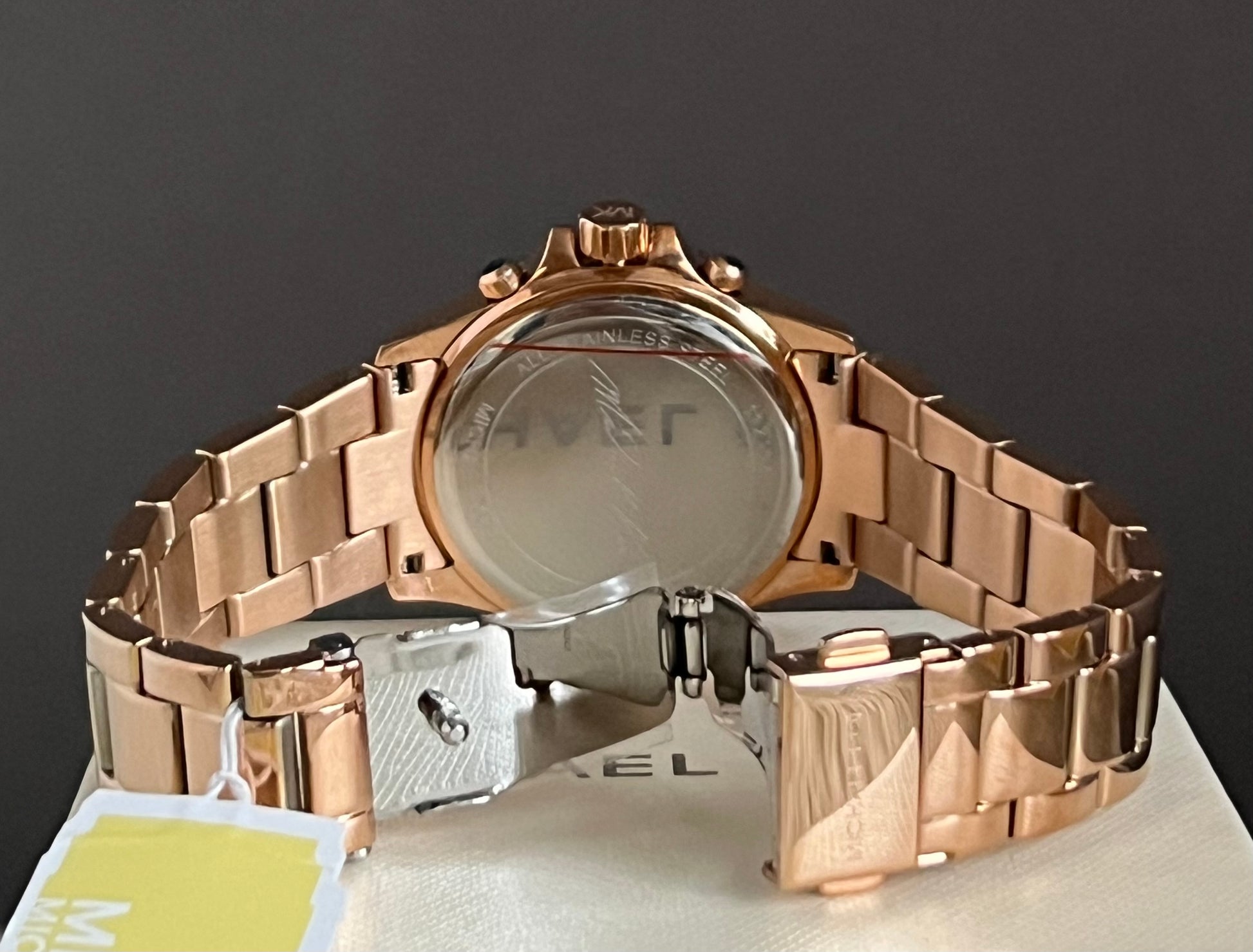 Introducing Michael Kors Women’s Everest Chronograph Quartz Crystal Rose Gold Dial Watch. This elegant timepiece boasts precise quartz movement and a stunning rose gold dial adorned with crystals. With its sleek design and reliable functionality, this watch is a must-have for any fashion-forward woman.